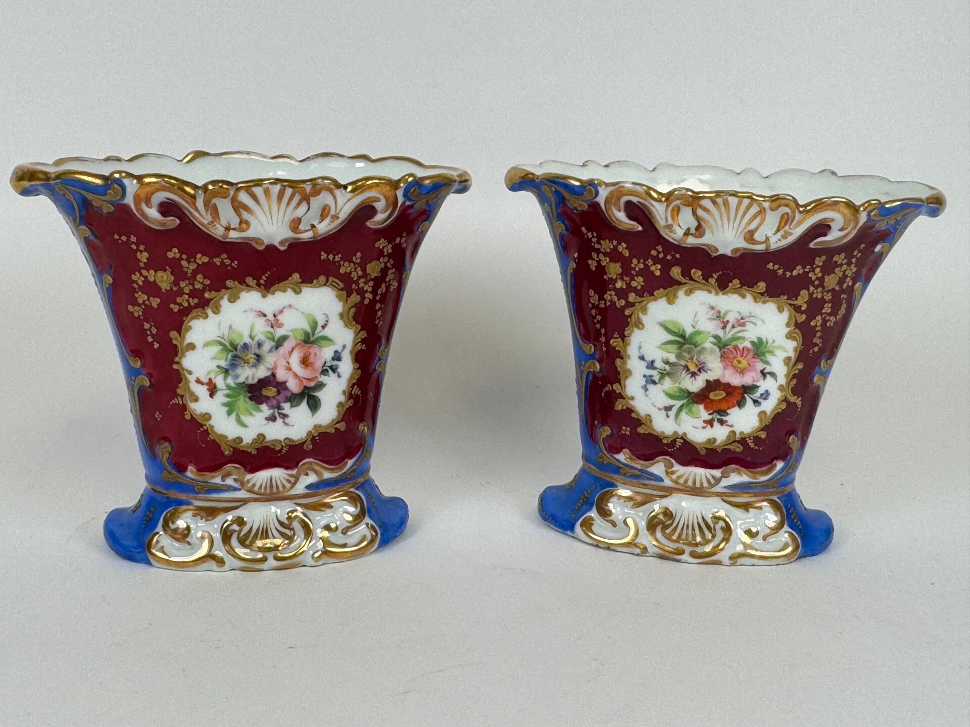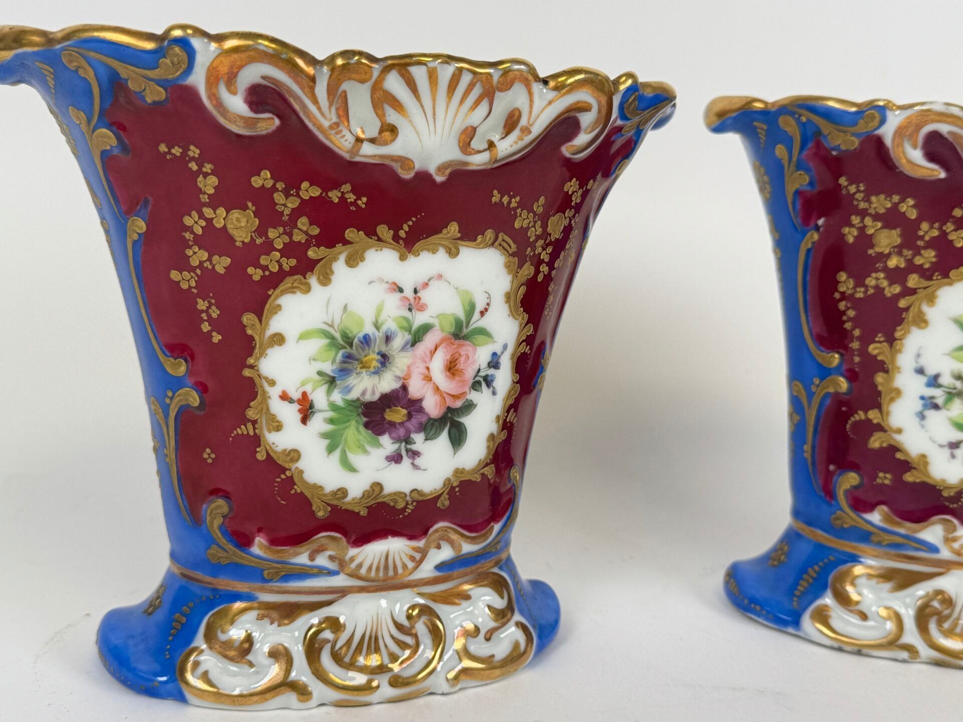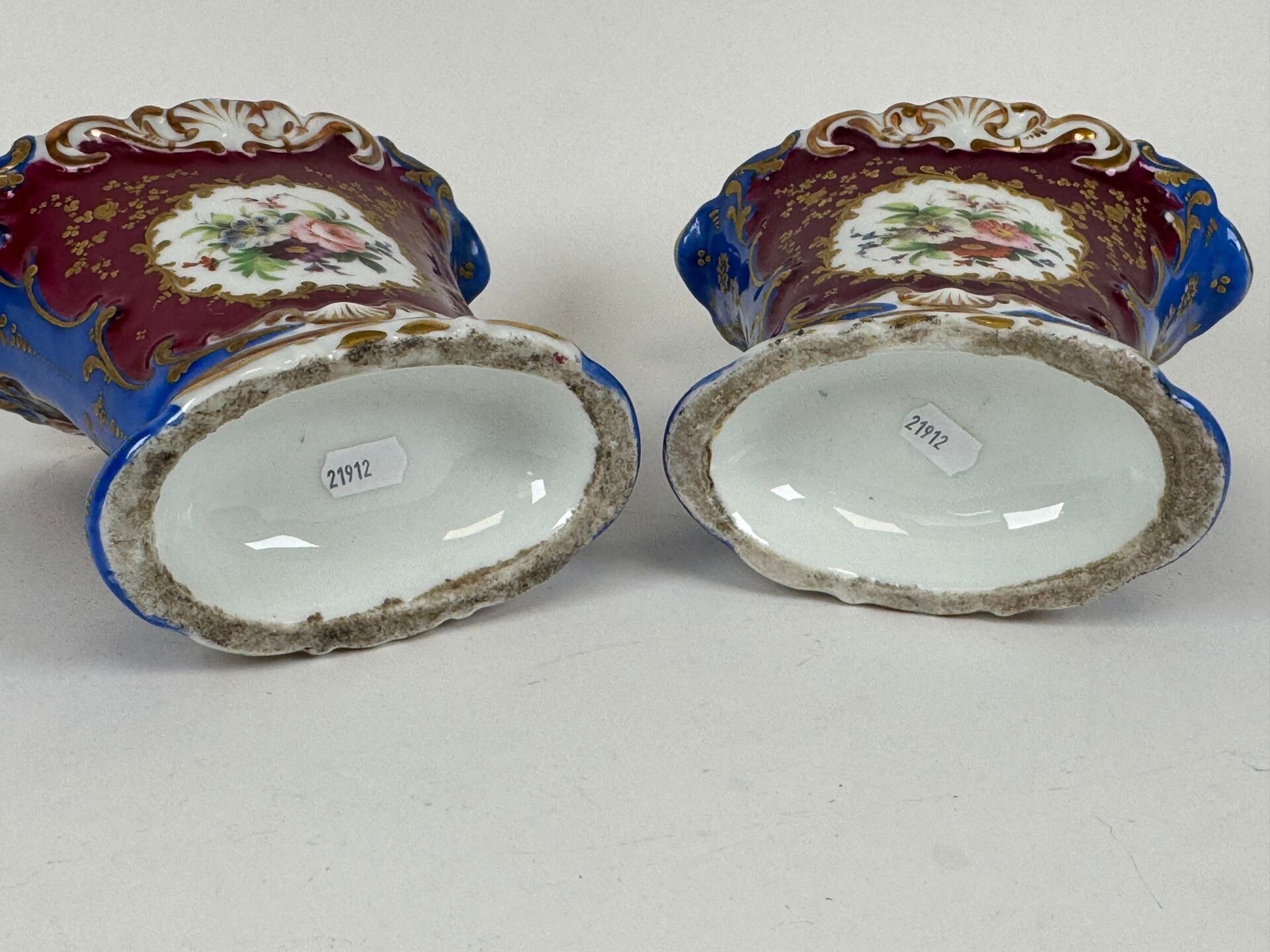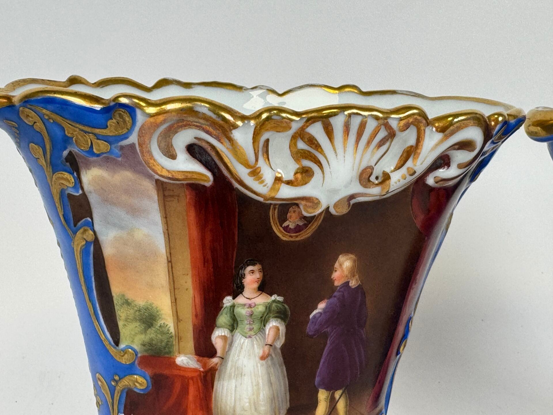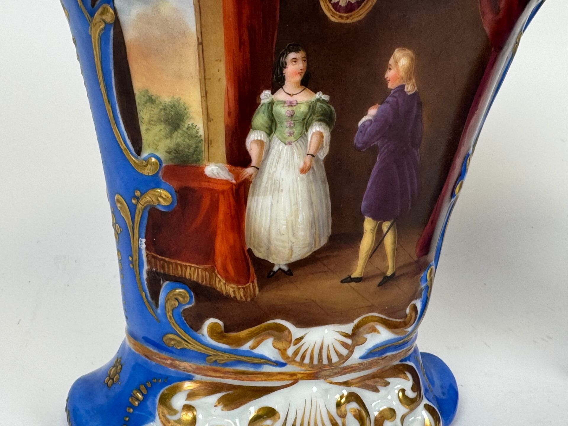 A pair of polychrome and gold porcelain vases decorated in medallions with romantic scenes and flowers.