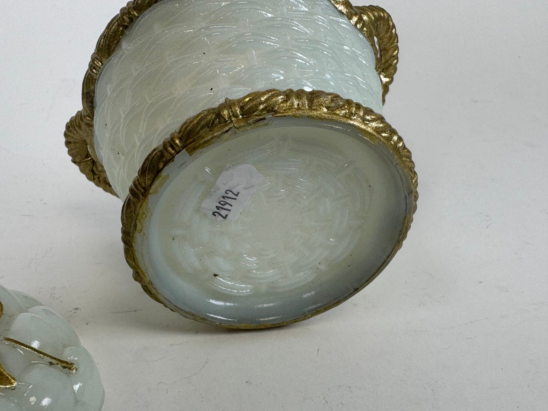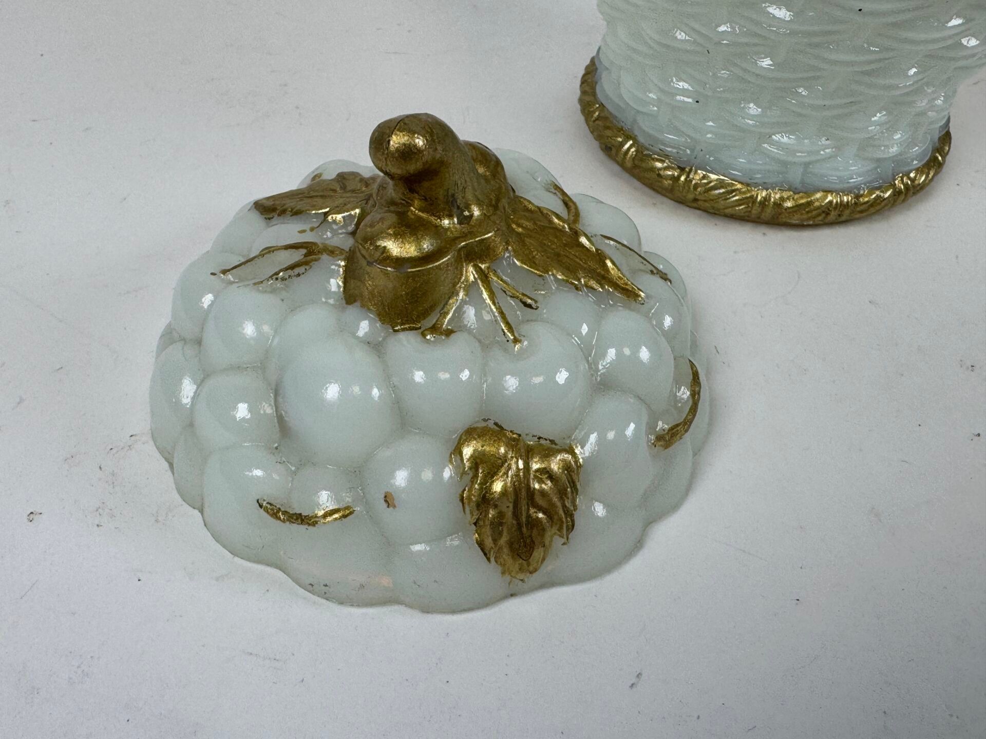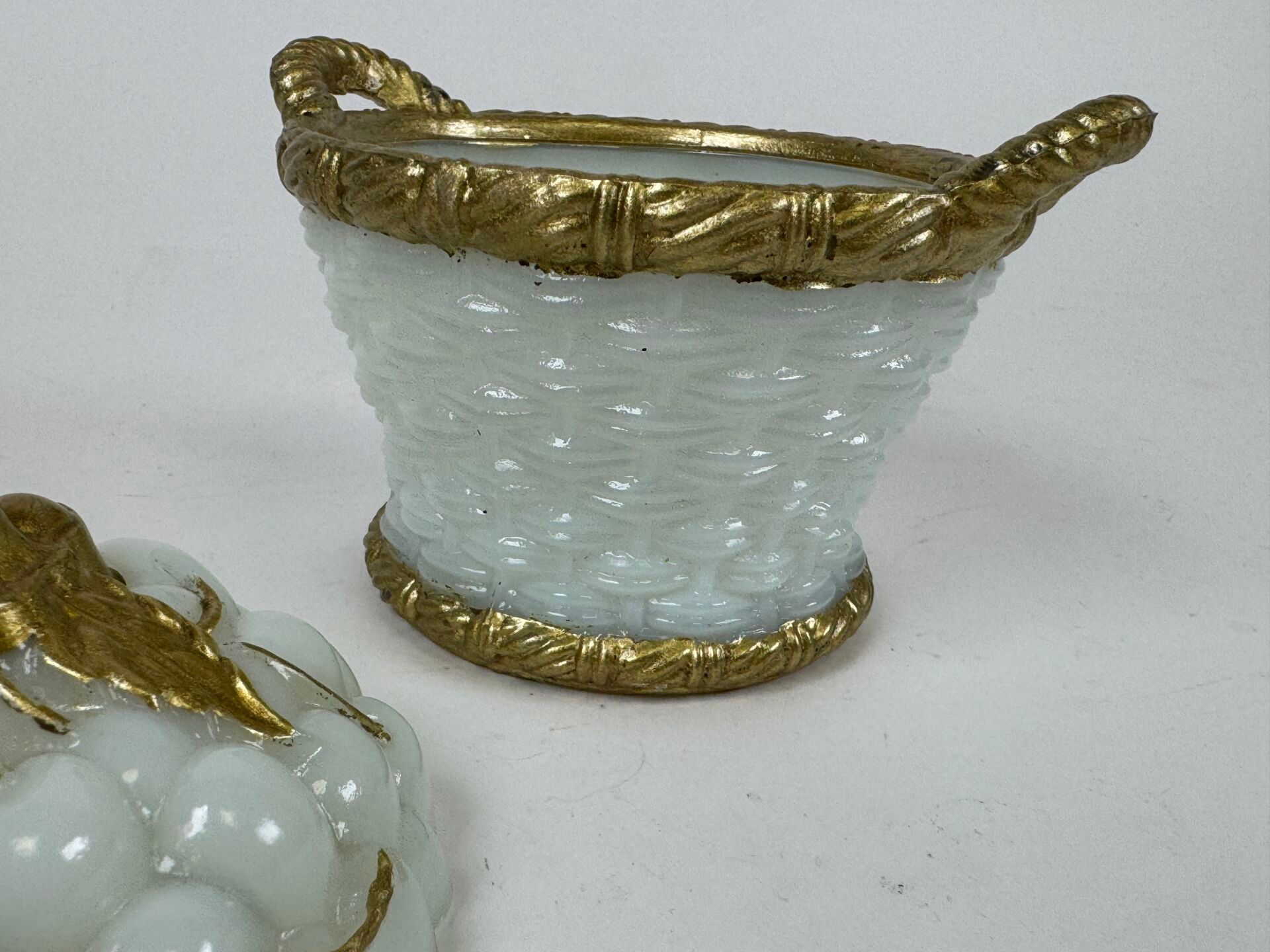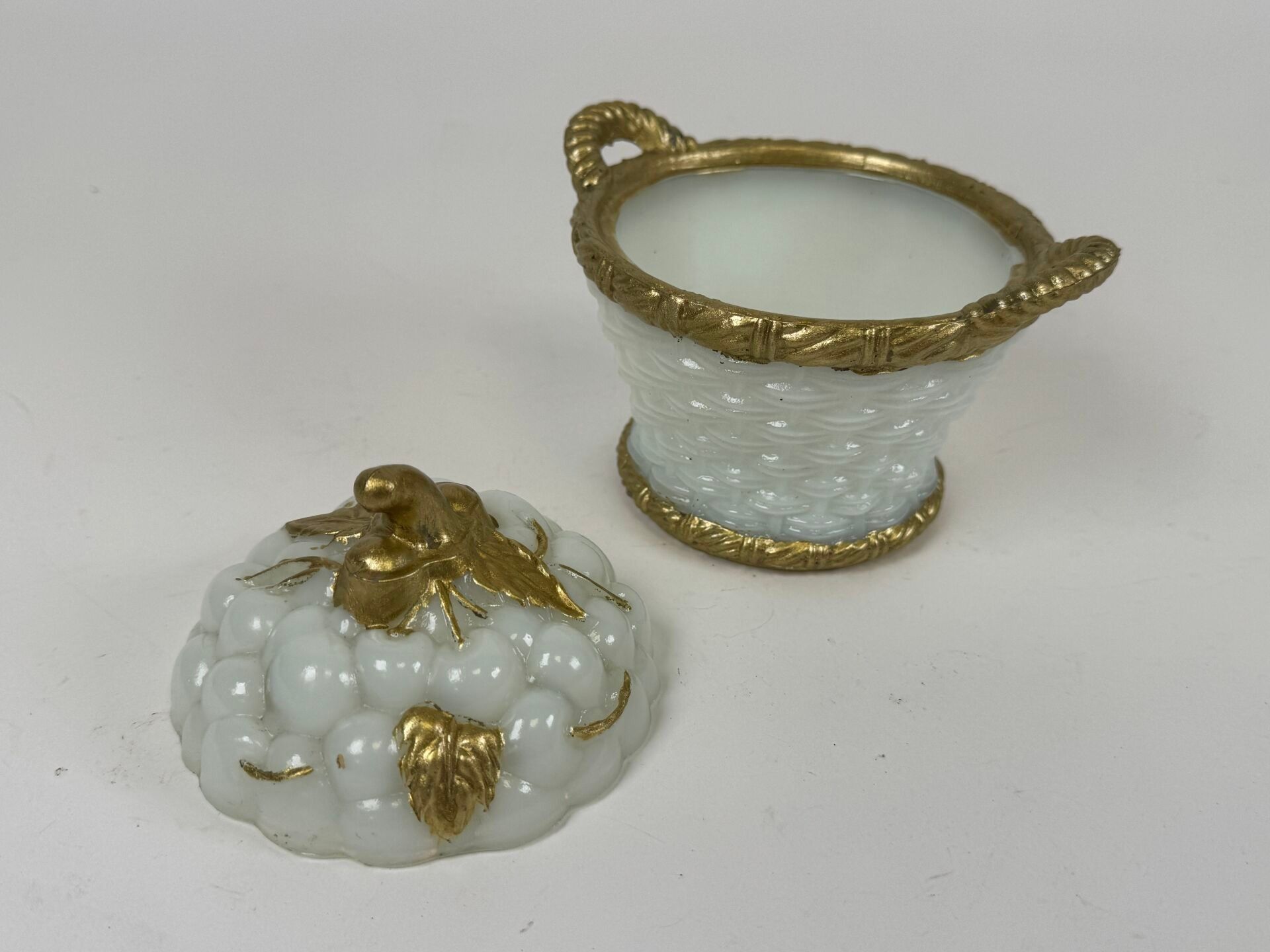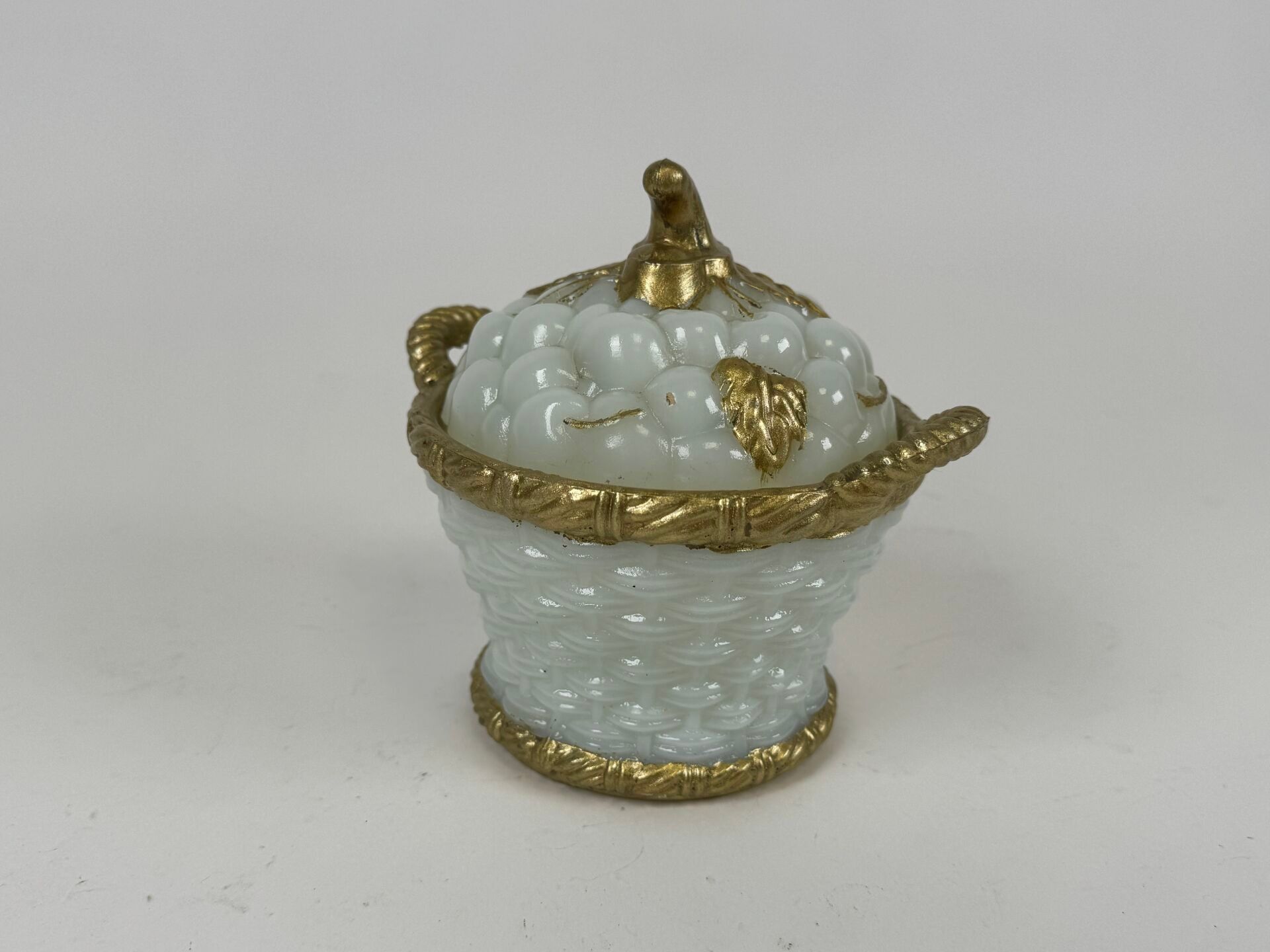 Small opaline and gold glass bonbonnière decorated with a woven basket and fruit.