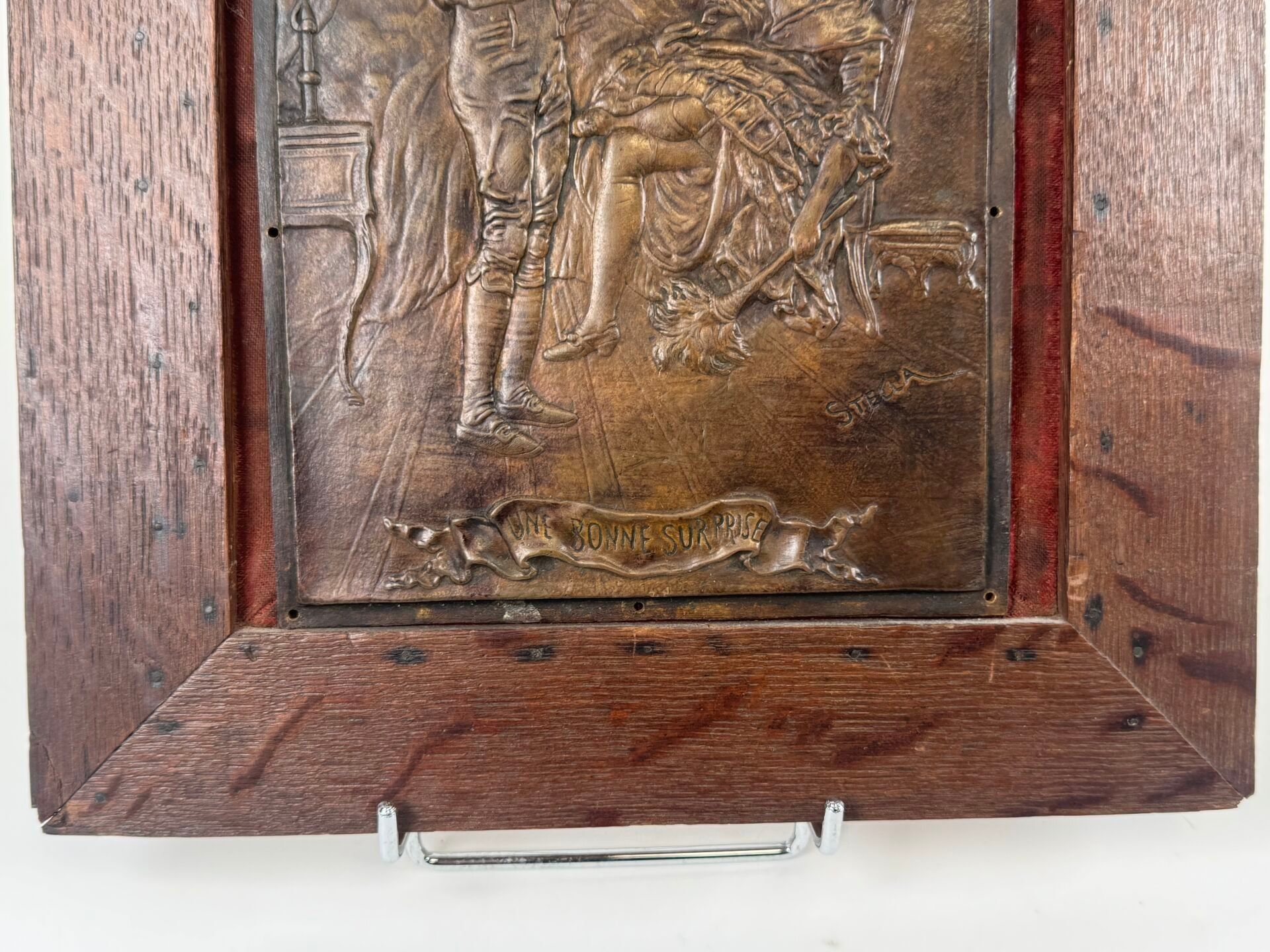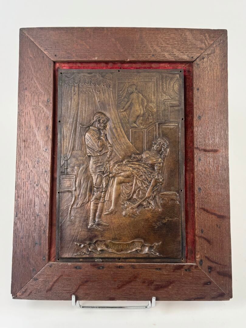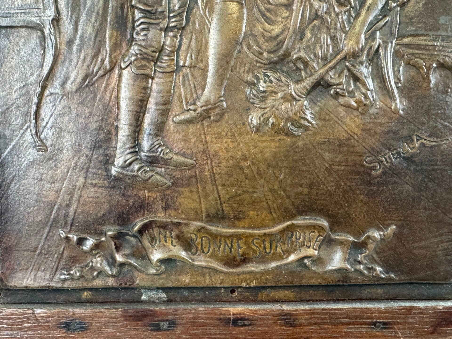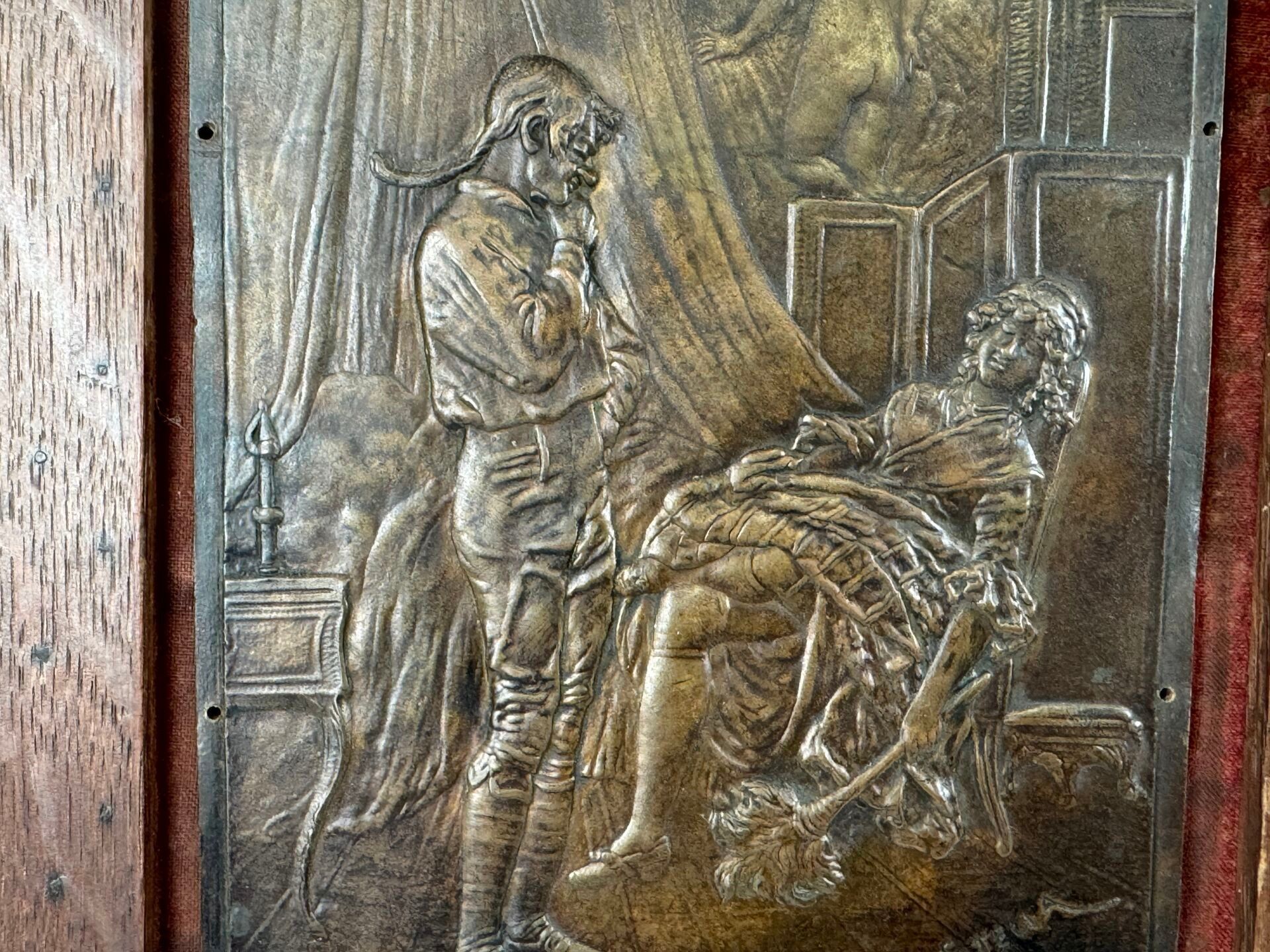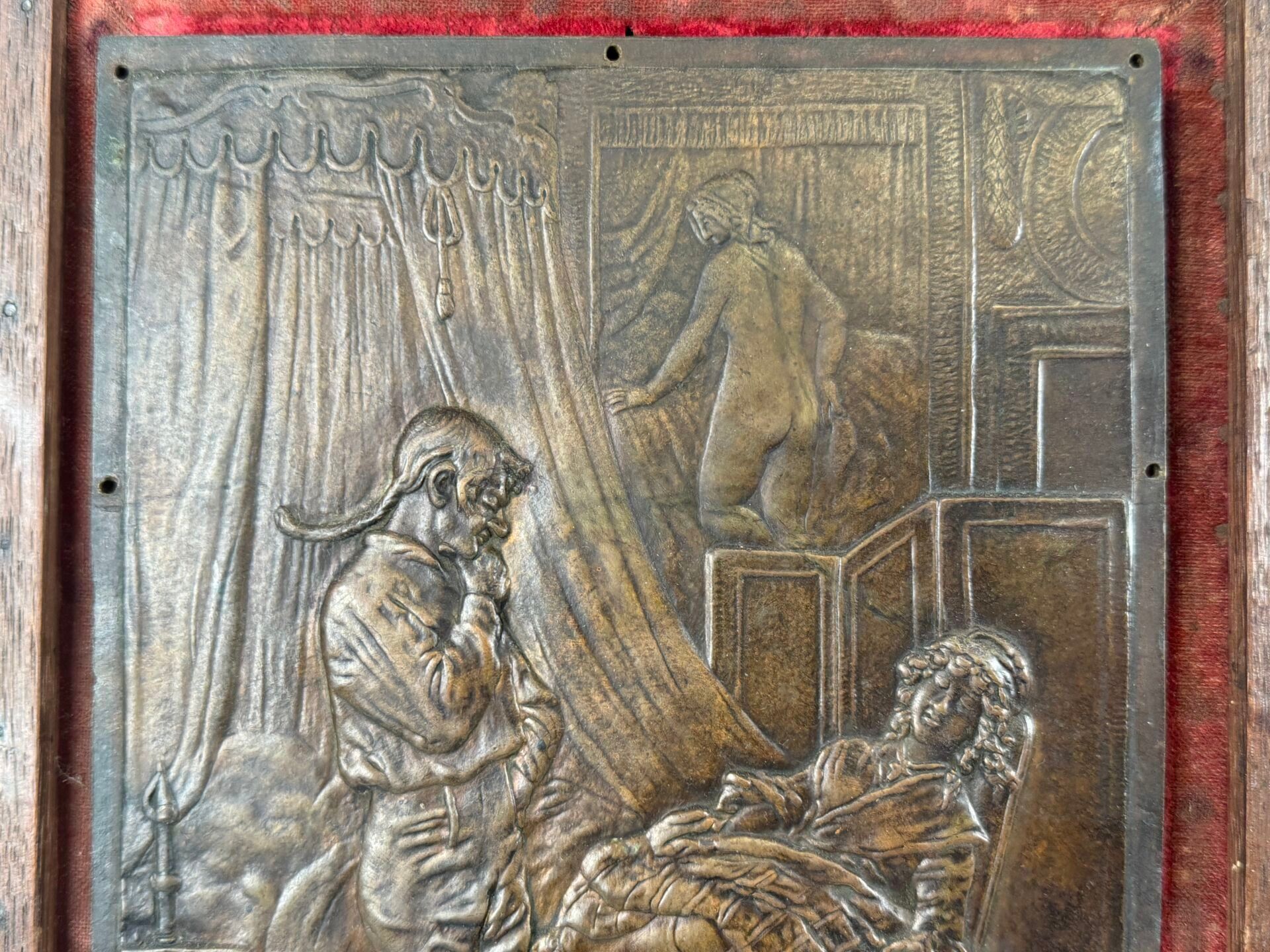 Rectangular copper alloy plate with relief decoration.