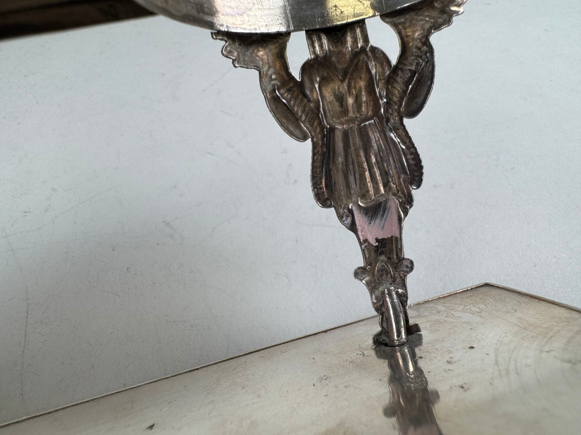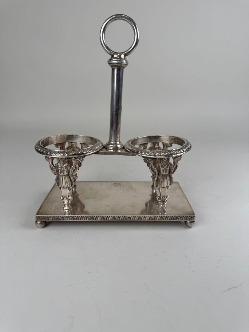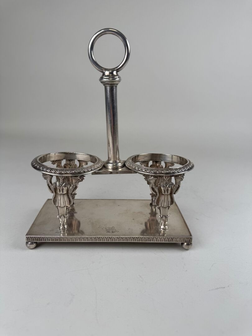 A silver plated oil and vinegar cruet holder decorated with caryatids supporting horns of plenty.