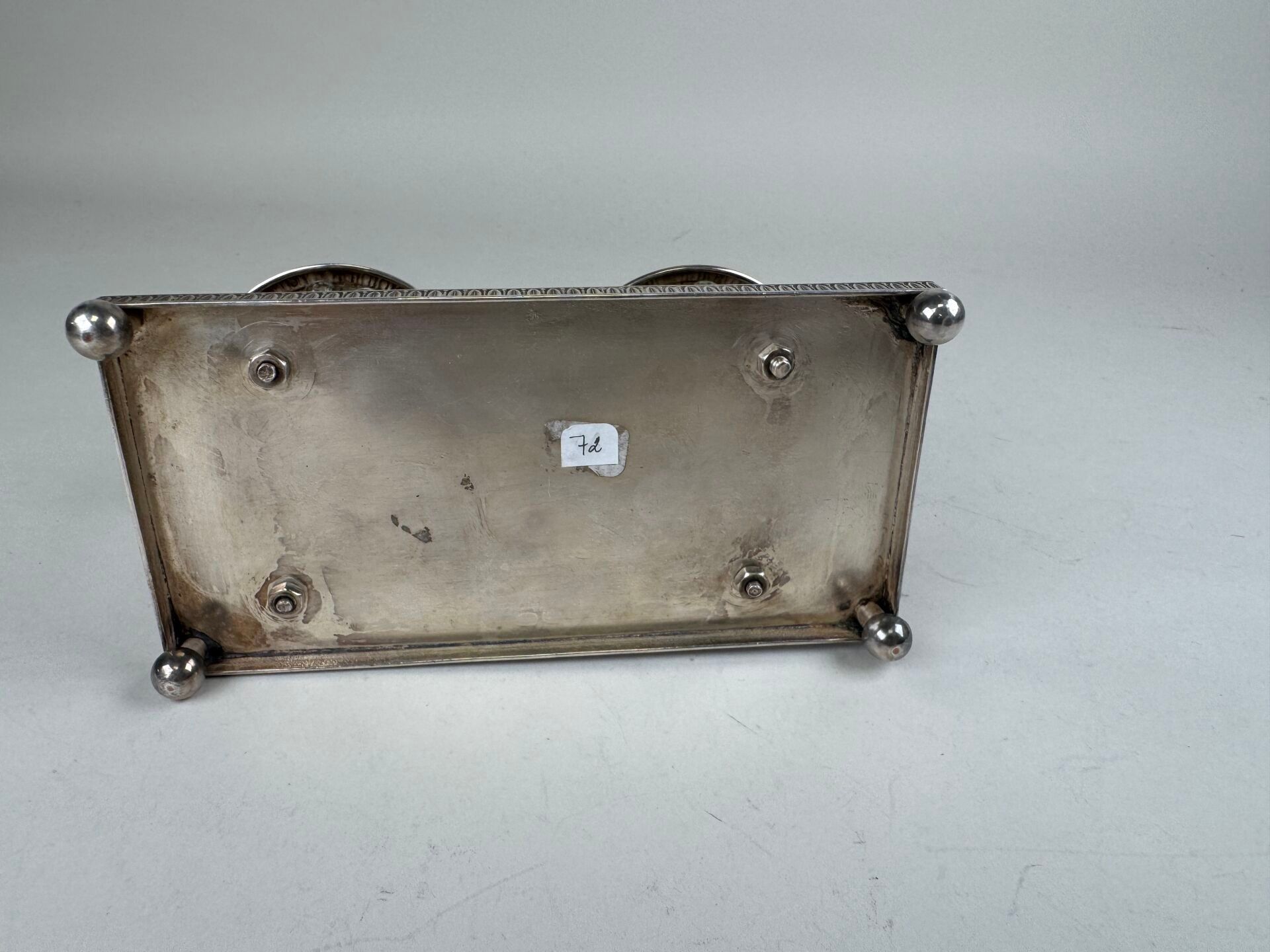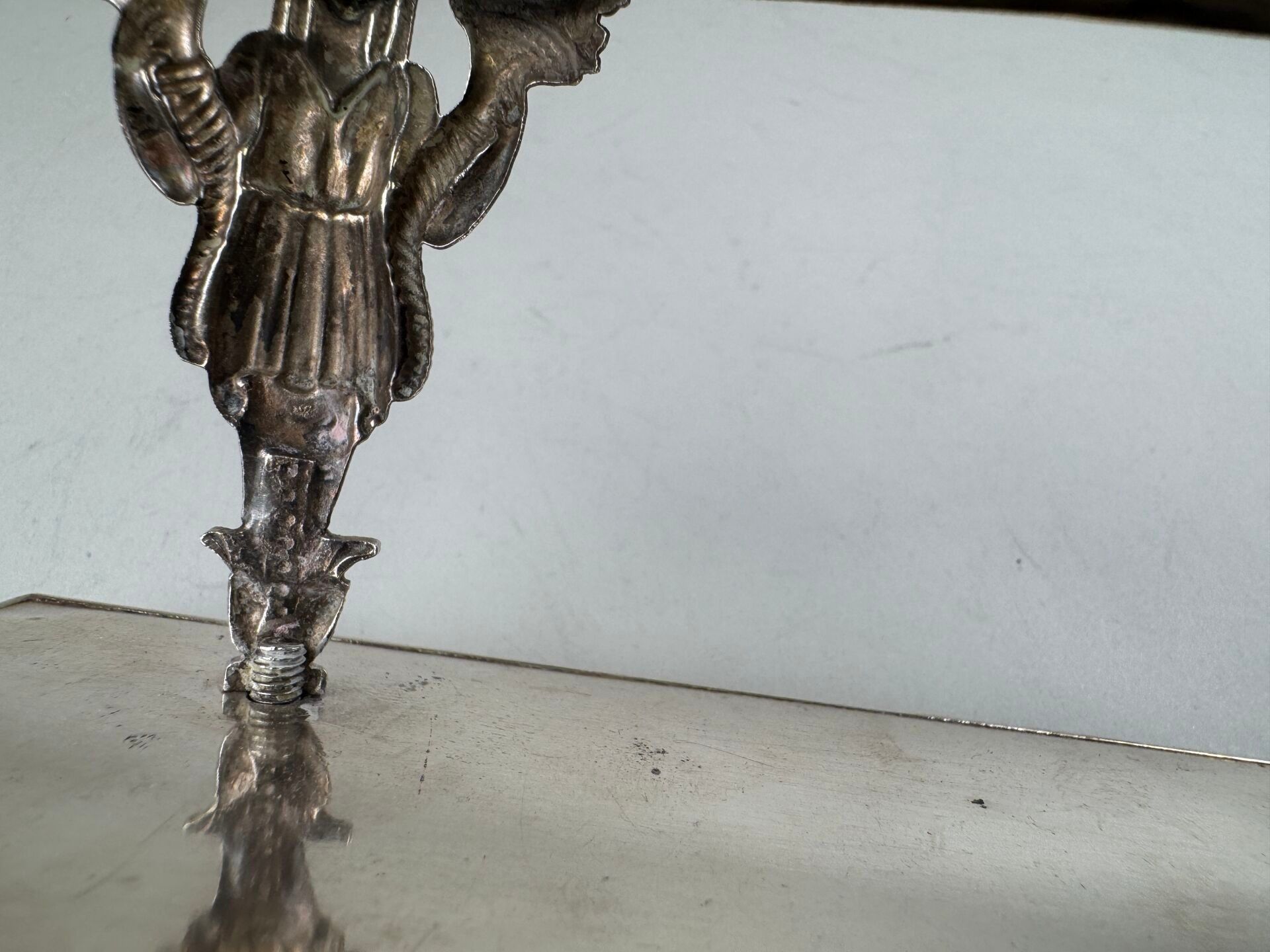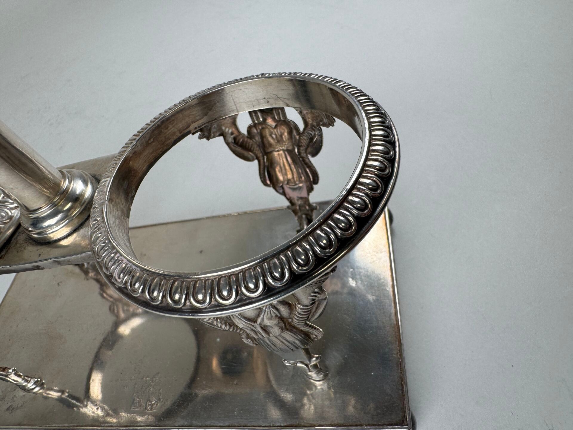 A silver plated oil and vinegar cruet holder decorated with caryatids supporting horns of plenty.