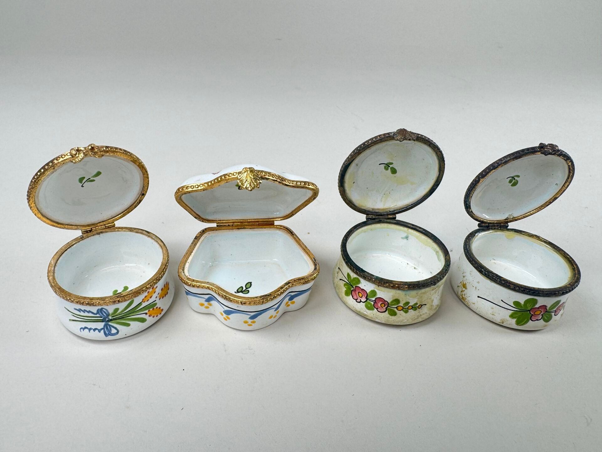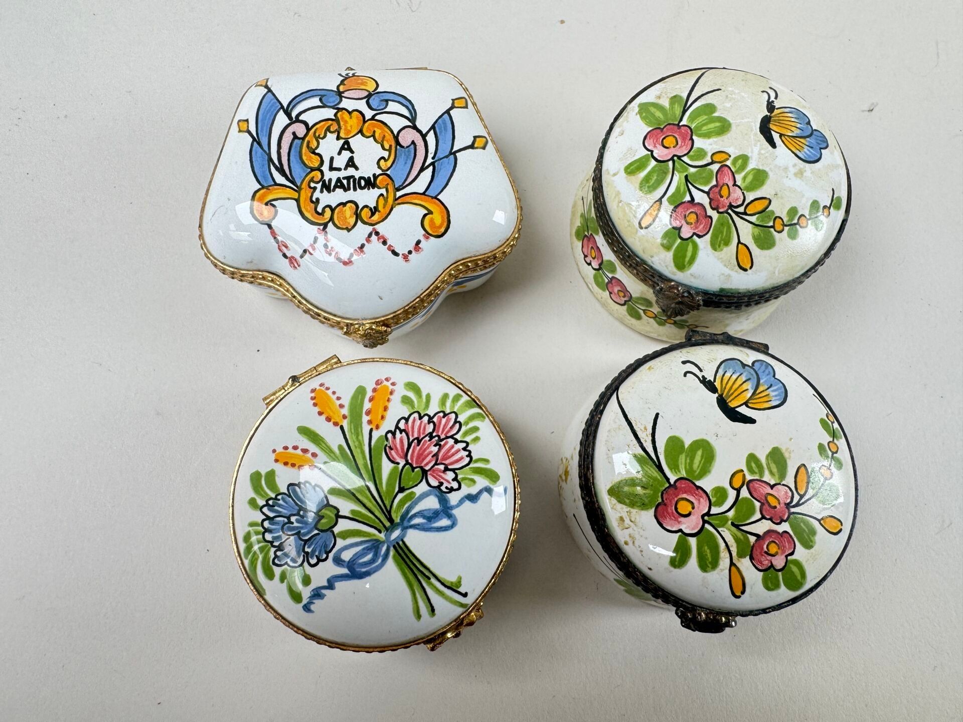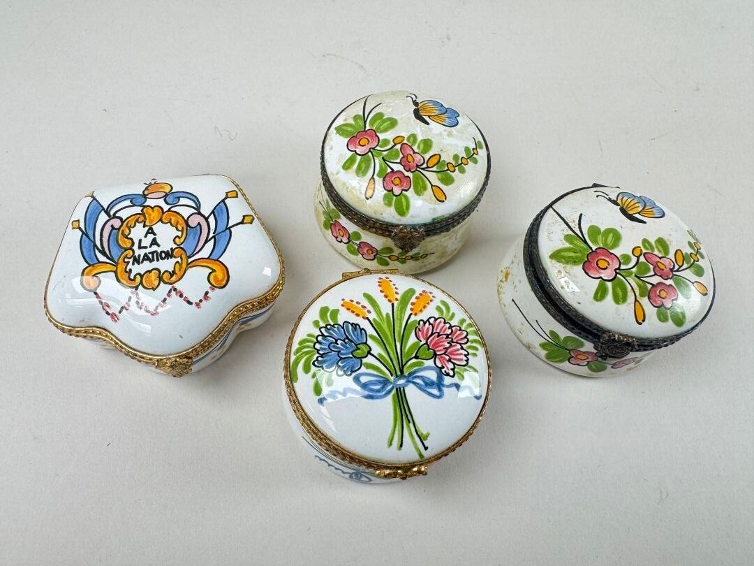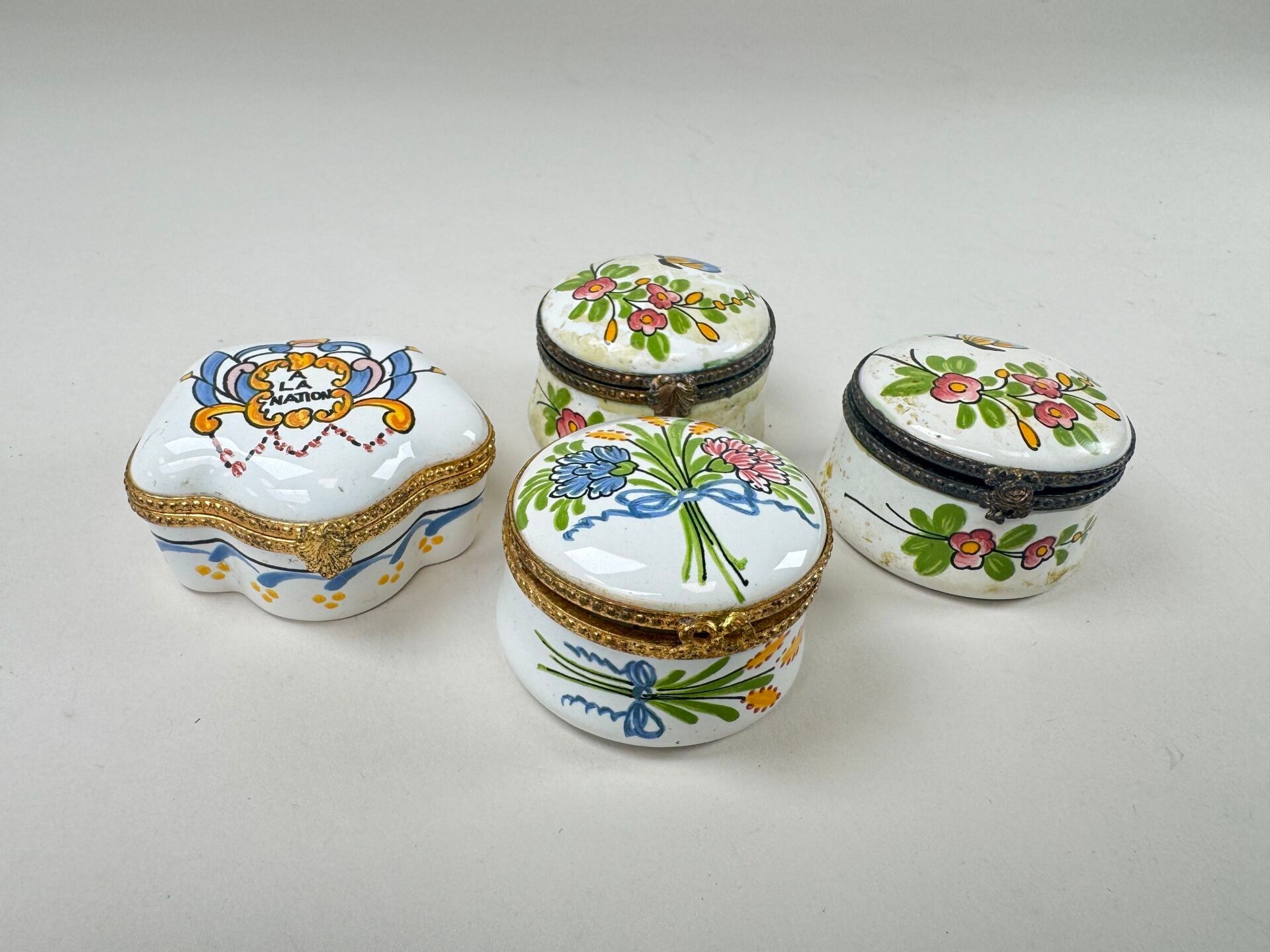 Four small polychrome ceramic boxes or pillboxes decorated with flowers and butterflies, one featuring standards marked "A La Nation" (3 x 6 x 5 cm).