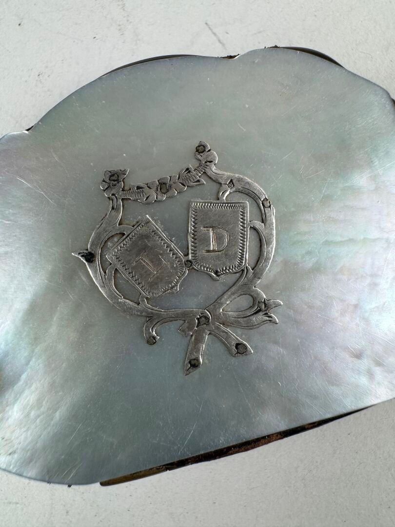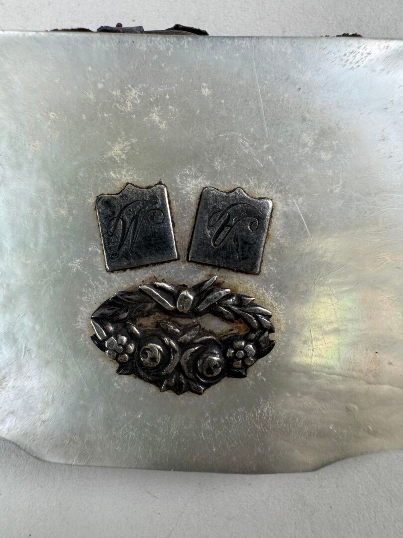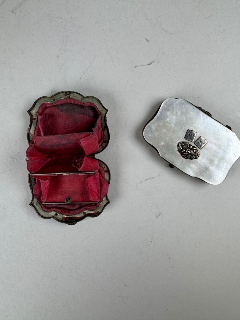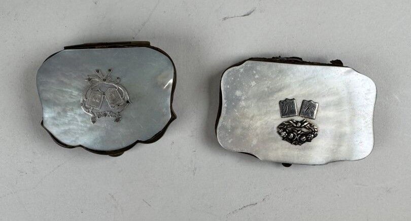 Two metal and mother-of-pearl coin purses decorated with small coats of arms.