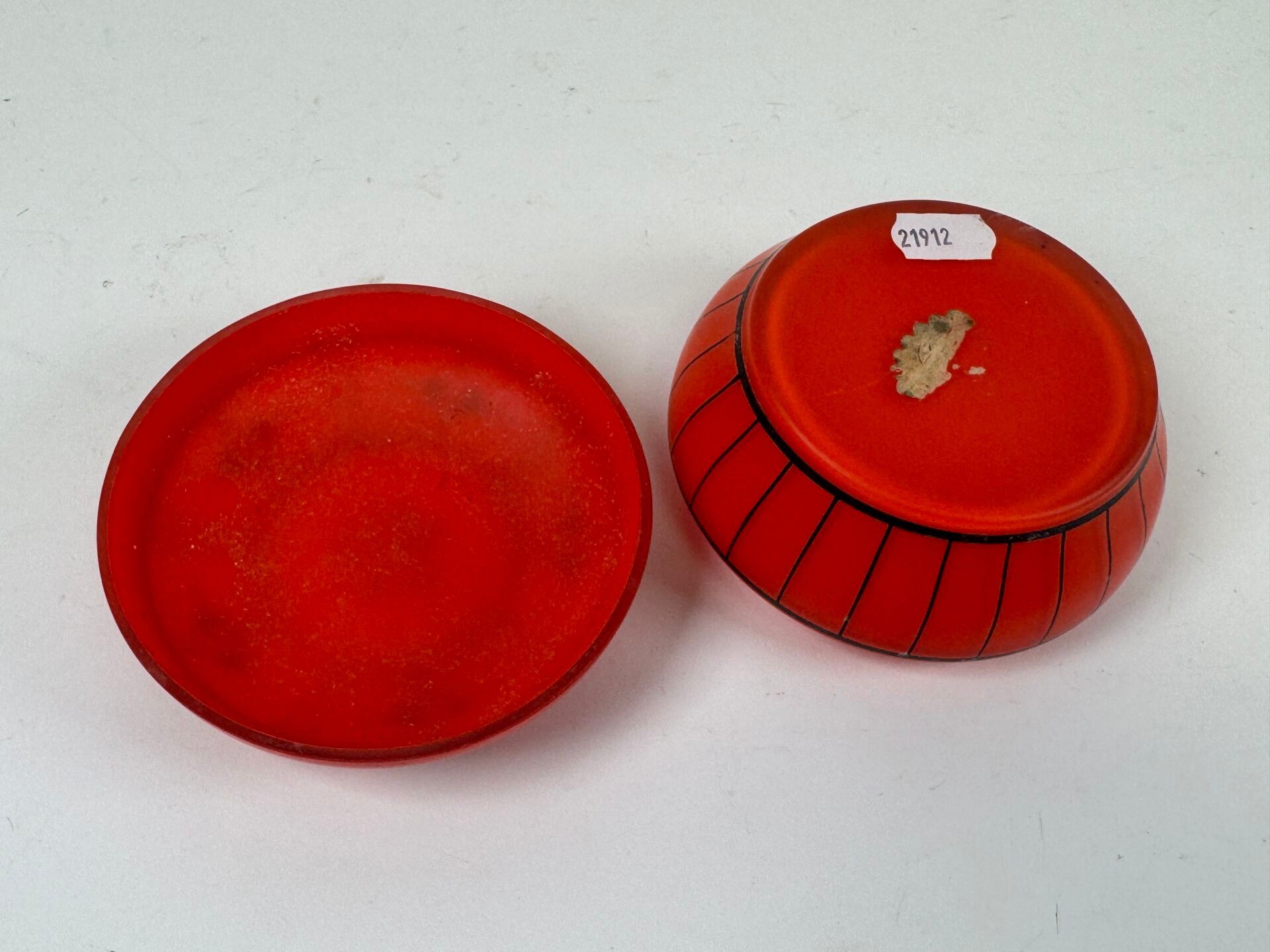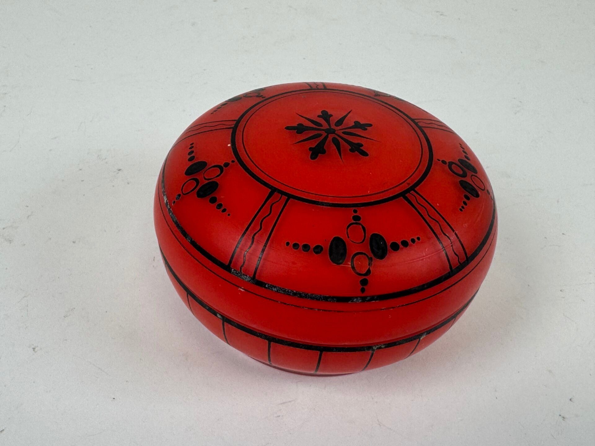 Small glass bonbonnière with an orange background and enhanced and painted stylised motifs.