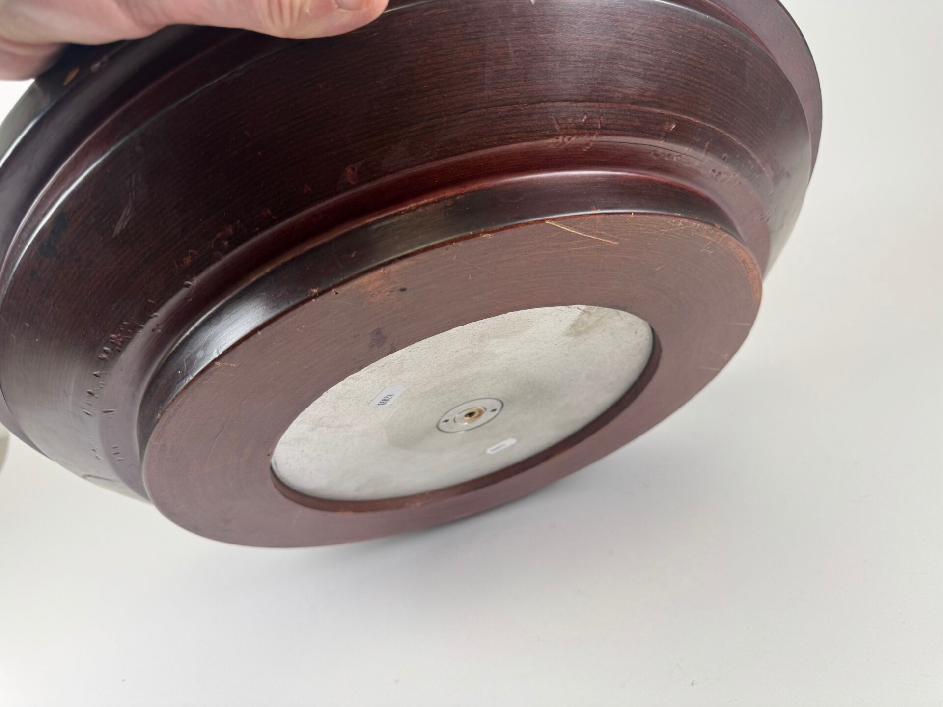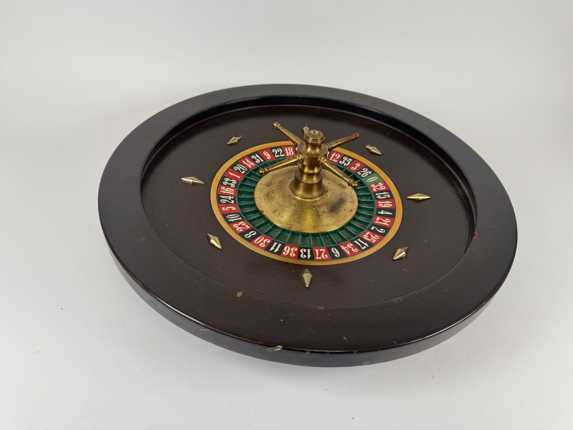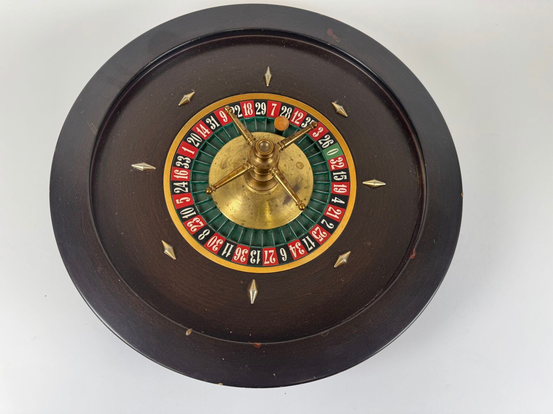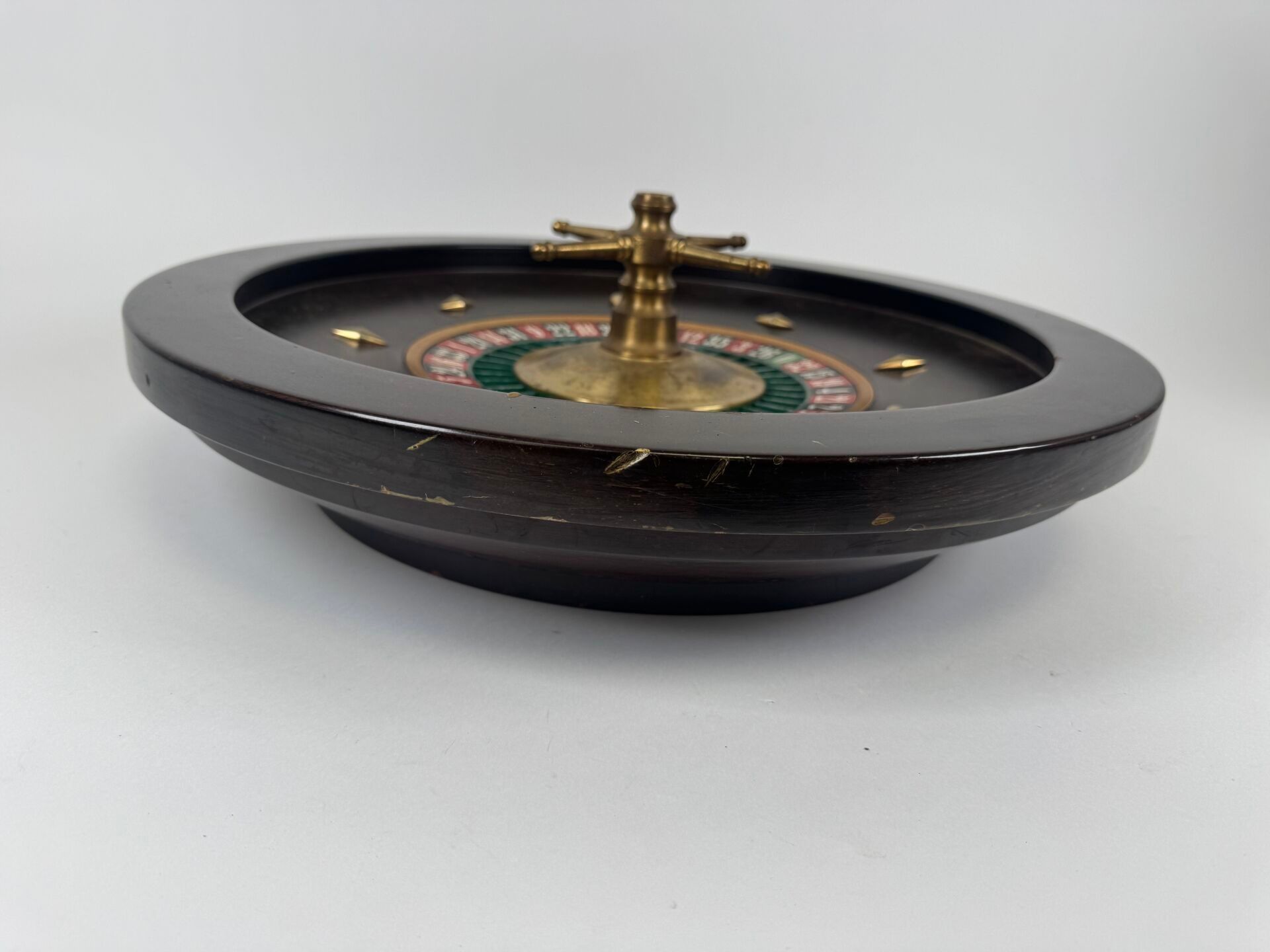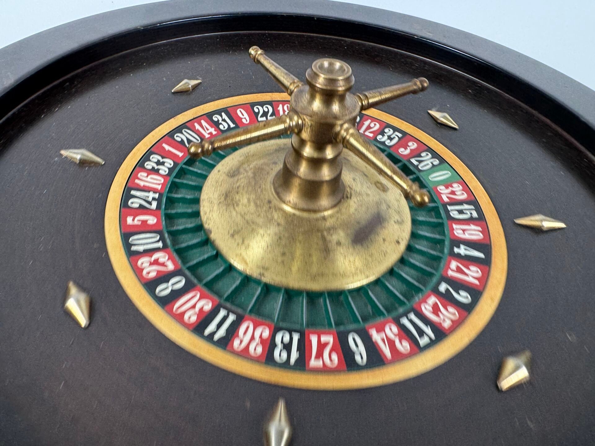 Casino roulette wheel in wood and brass.