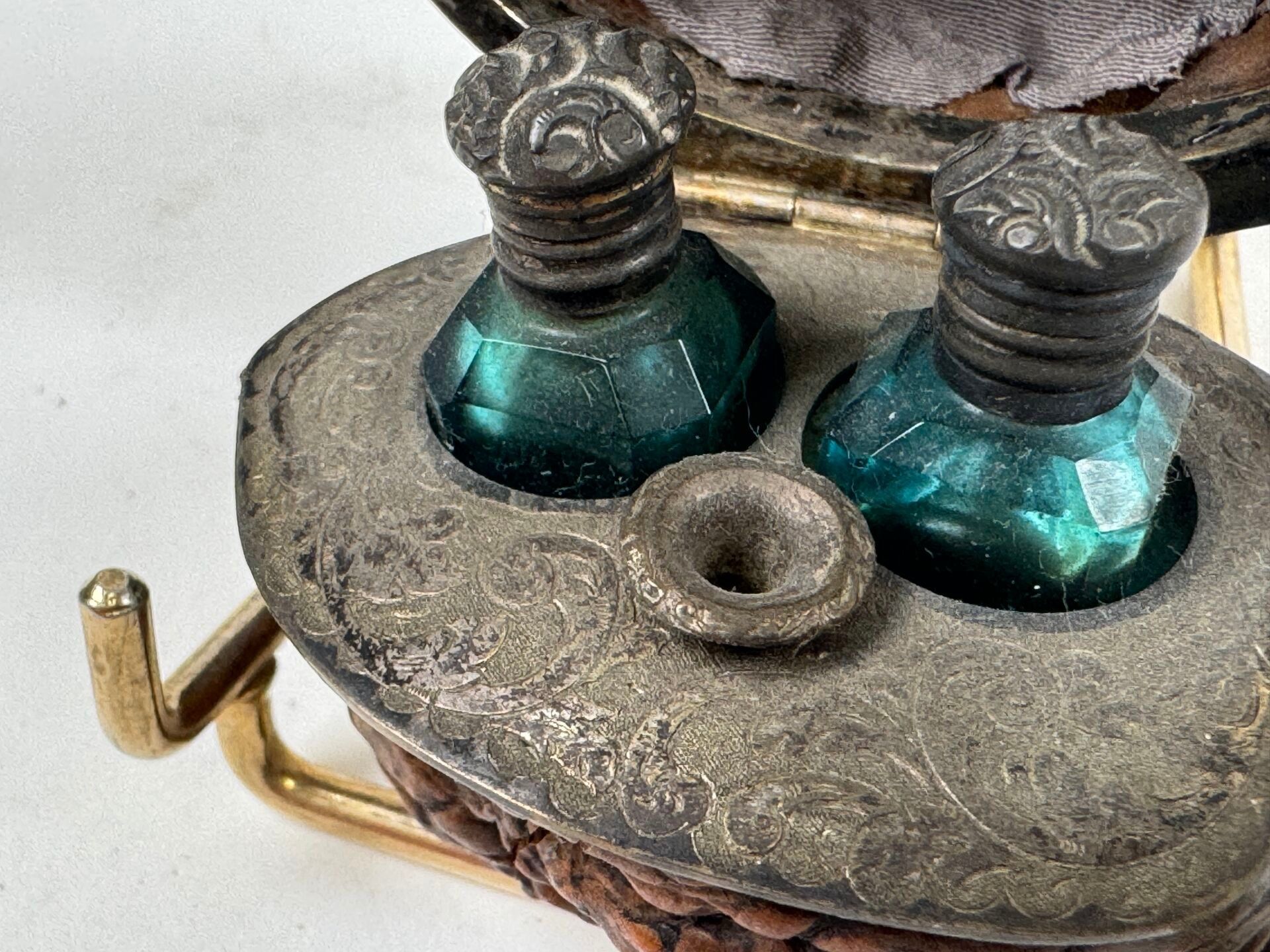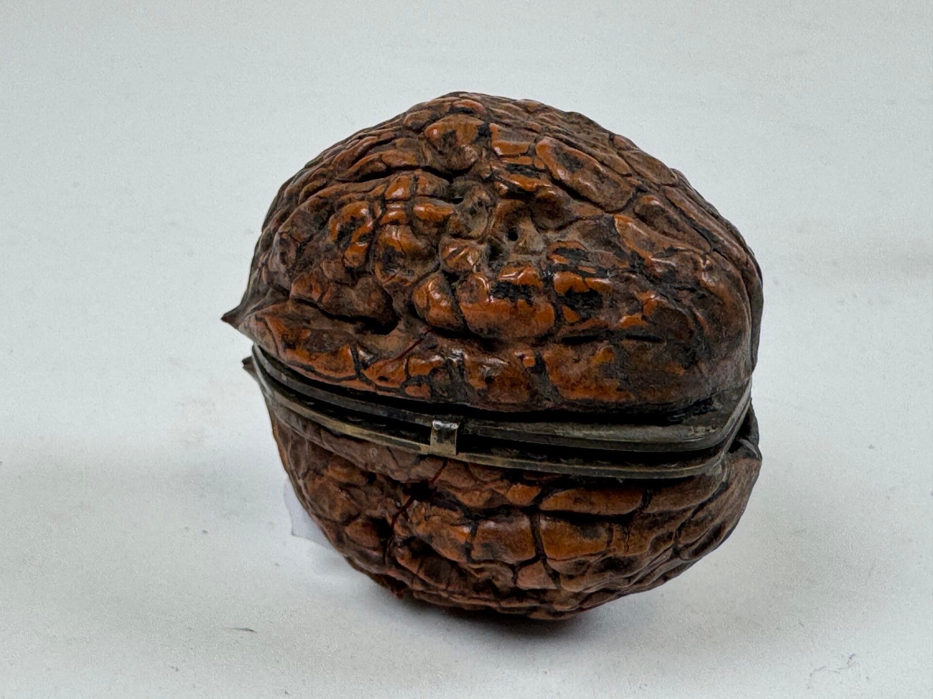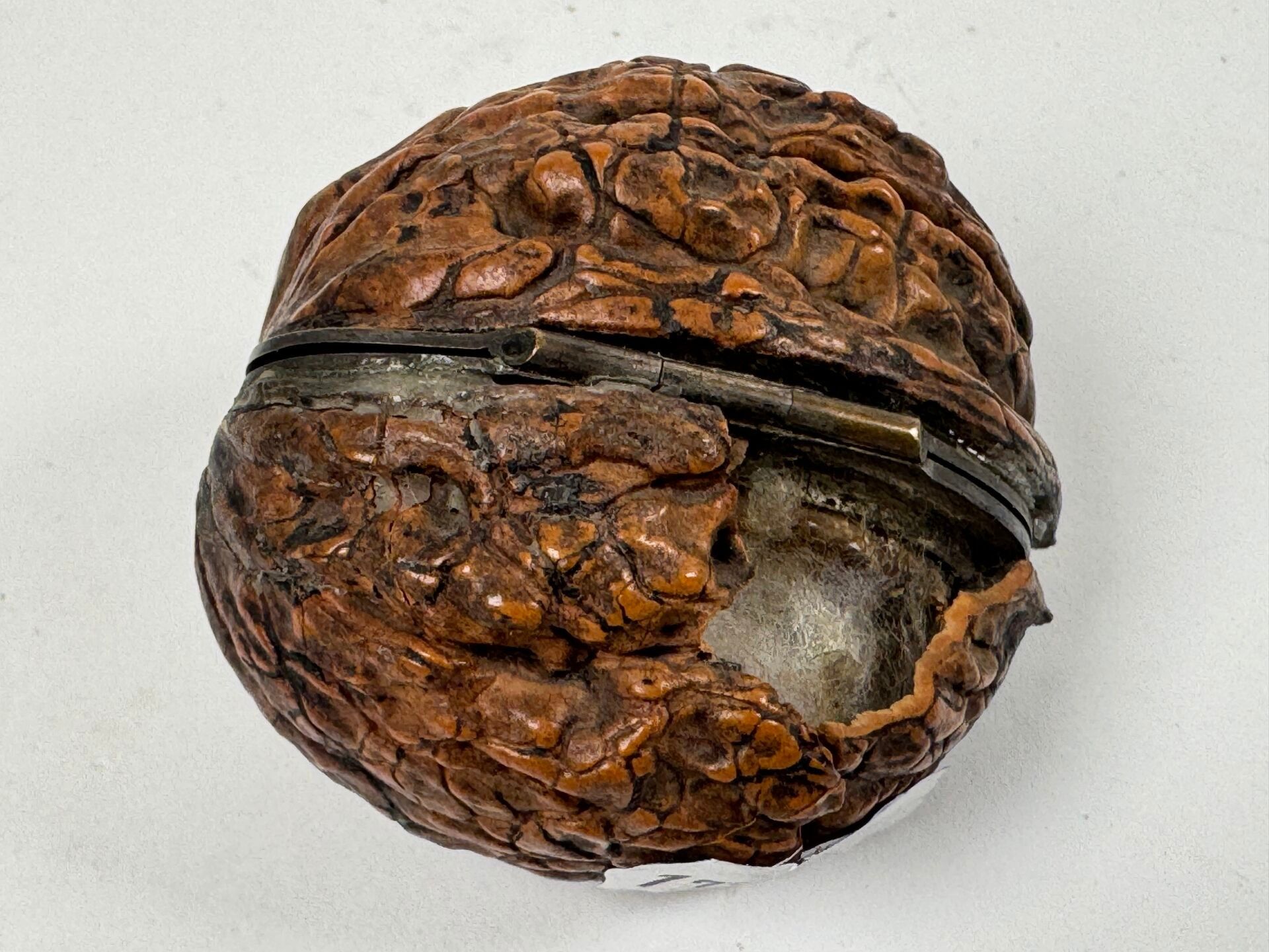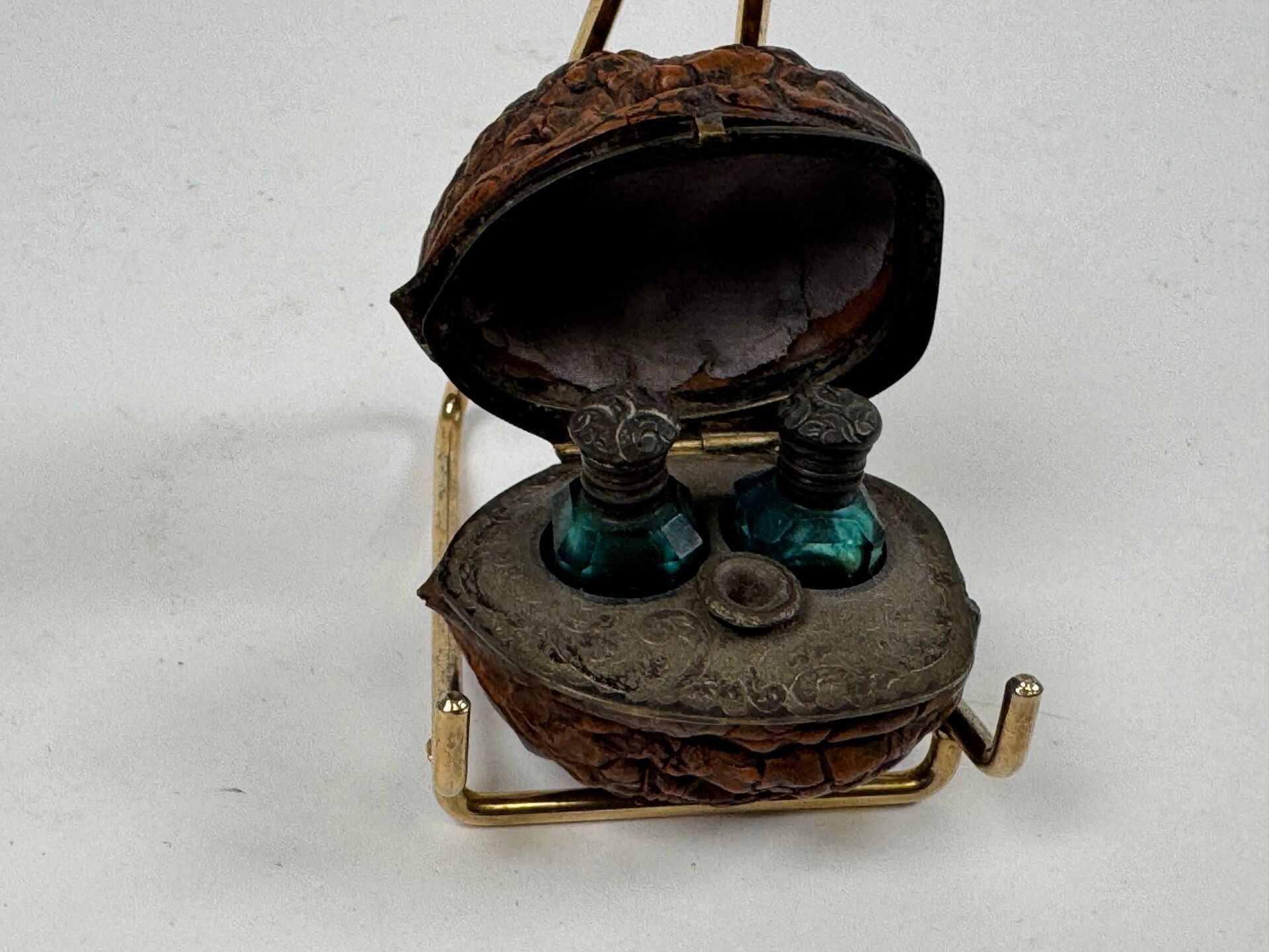 Small trompe l'oeil Corozo nut revealing two scent bottles, the mounting probably in chased silver.