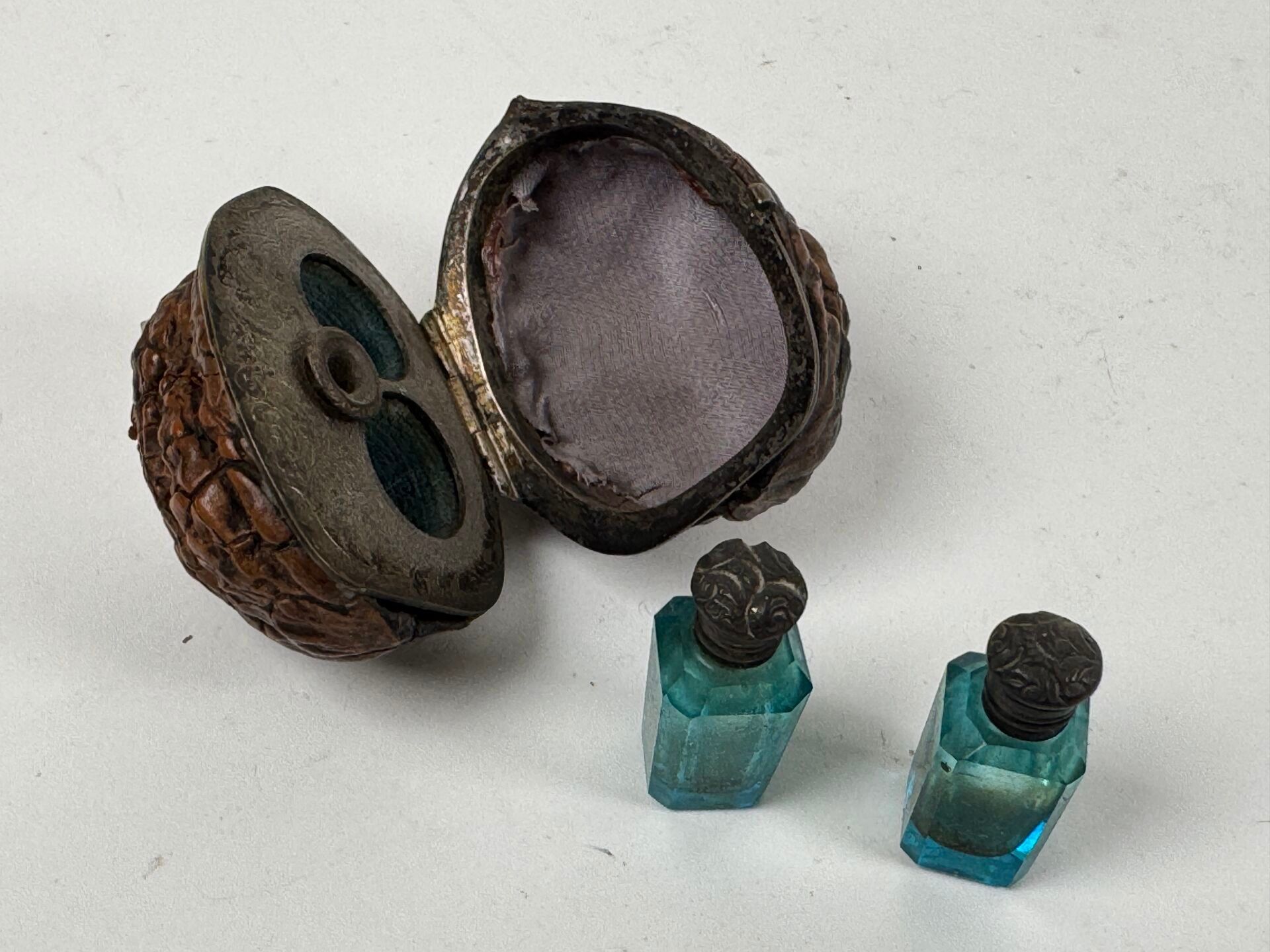 Small trompe l'oeil Corozo nut revealing two scent bottles, …