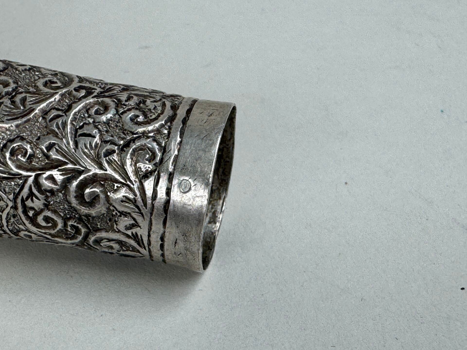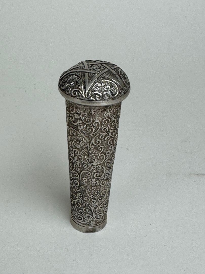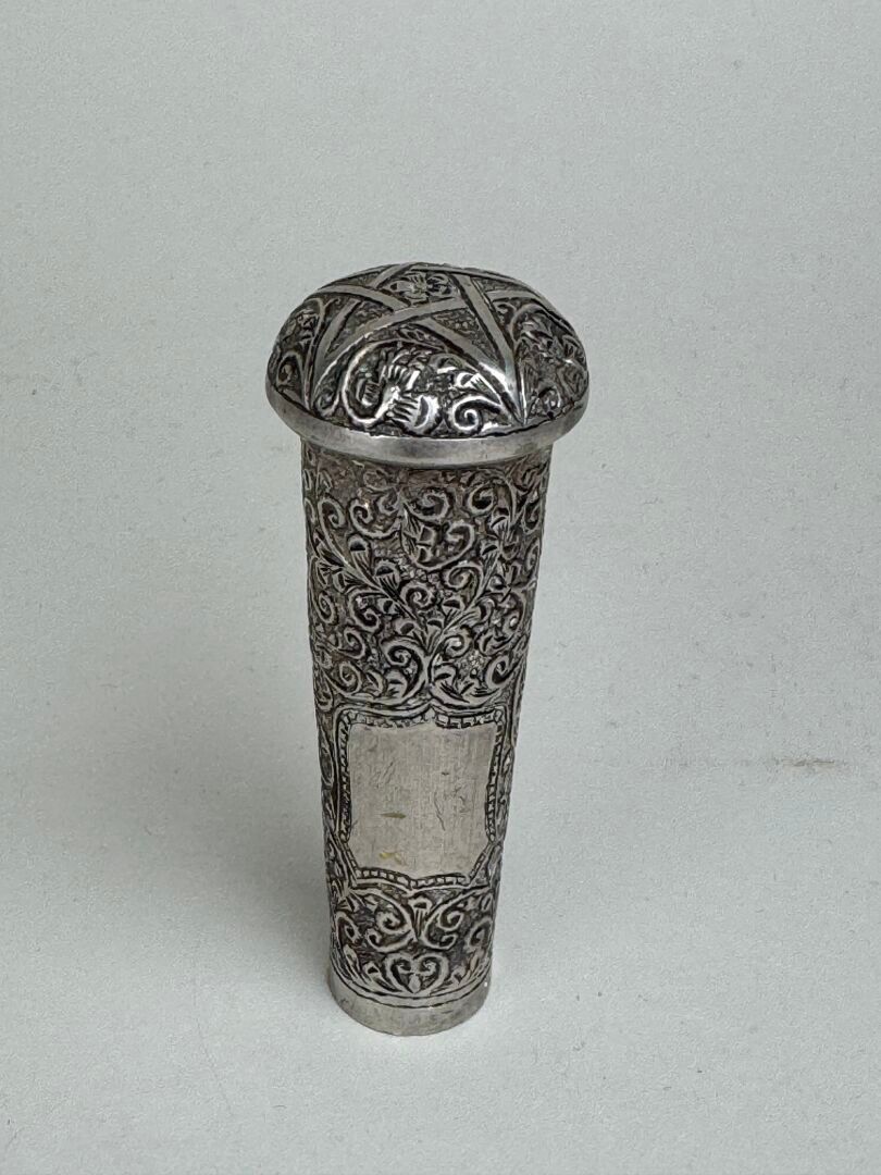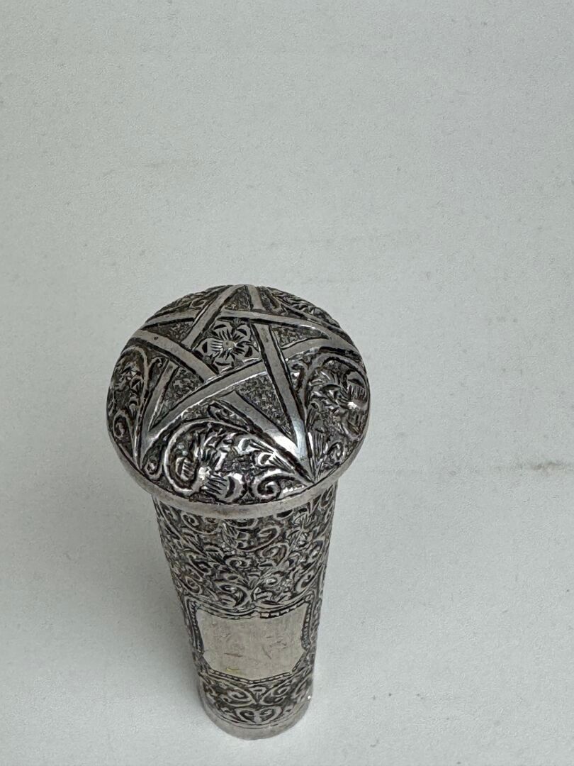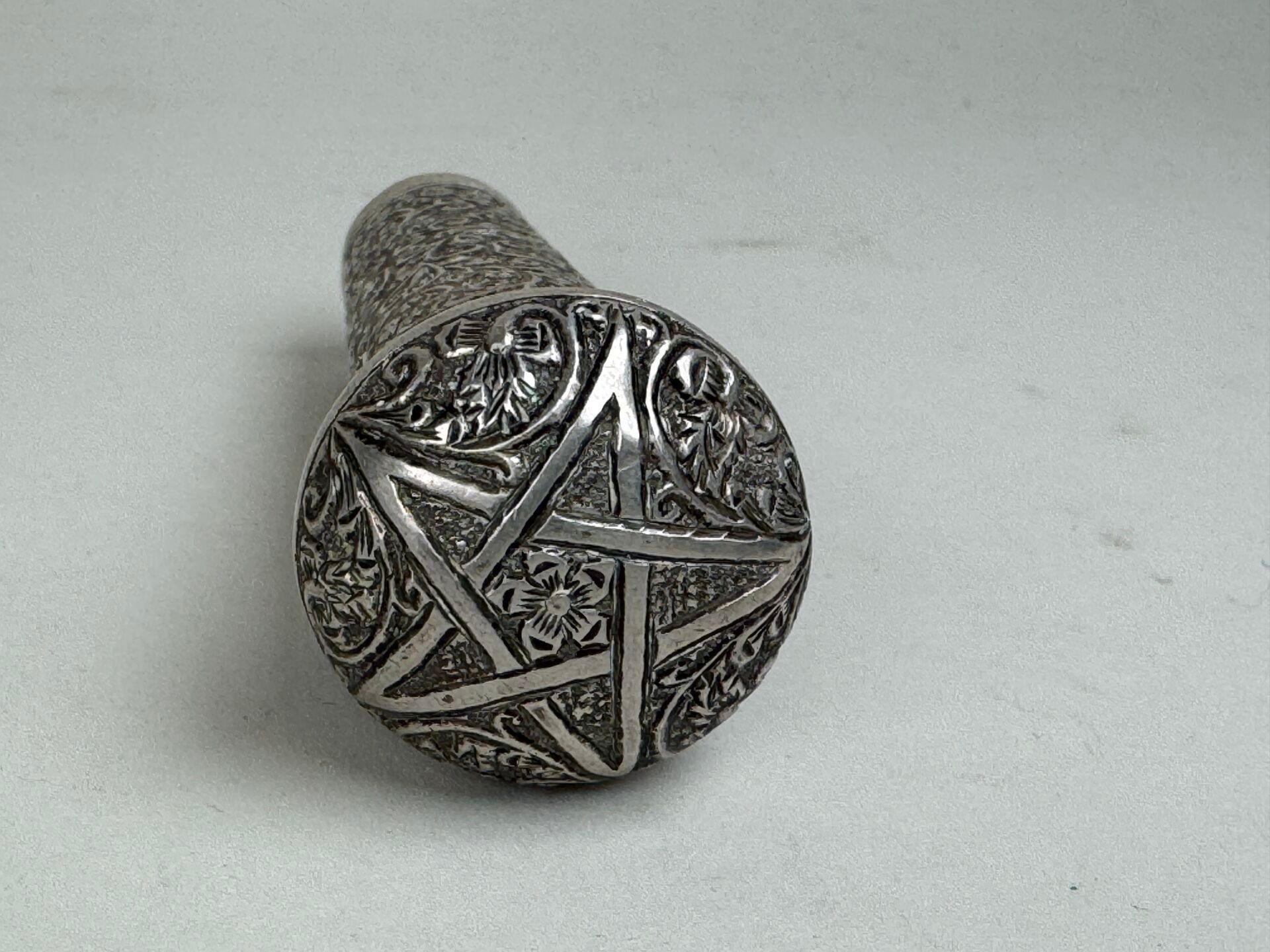 Chased silver cane knob, probably Freemasonic (?), decorated with foliate foliage, surmounted by a 5-pointed star.