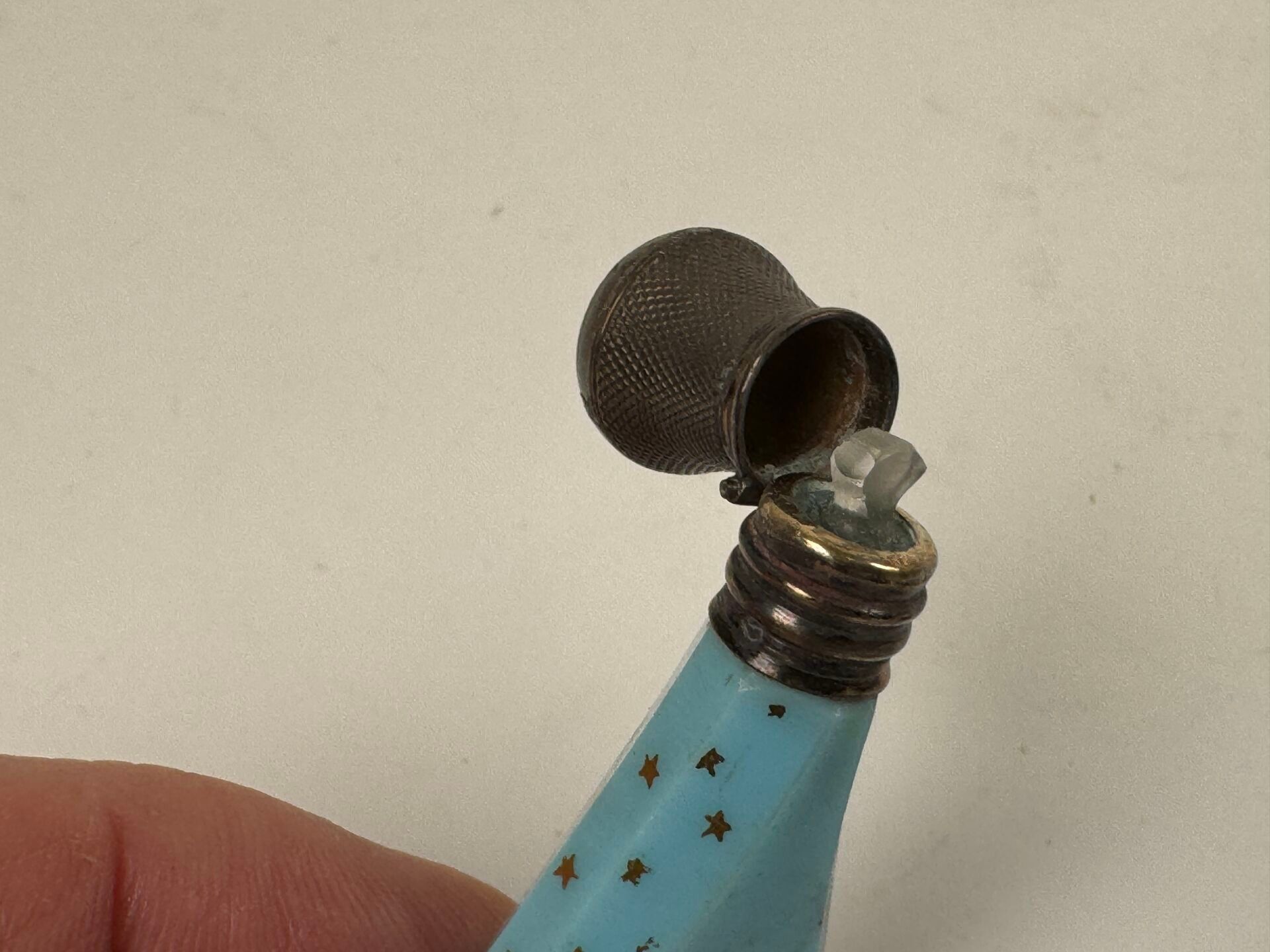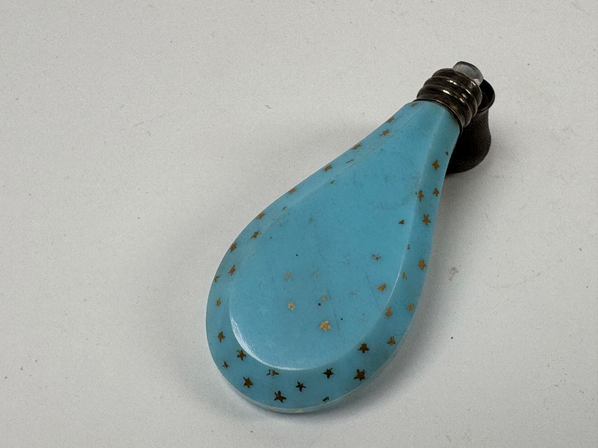 A small blue opaline salt bottle with a 950/1000 silver stopper, decorated with gold stars.