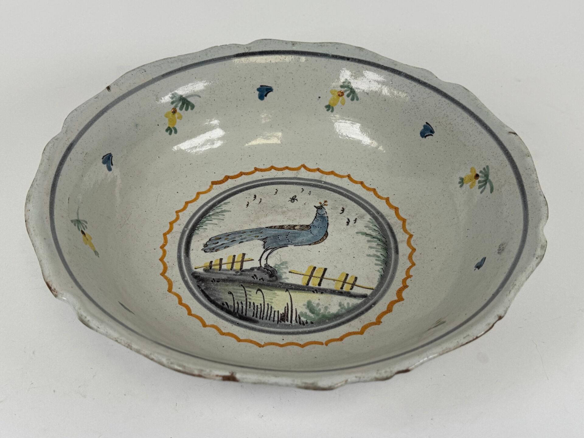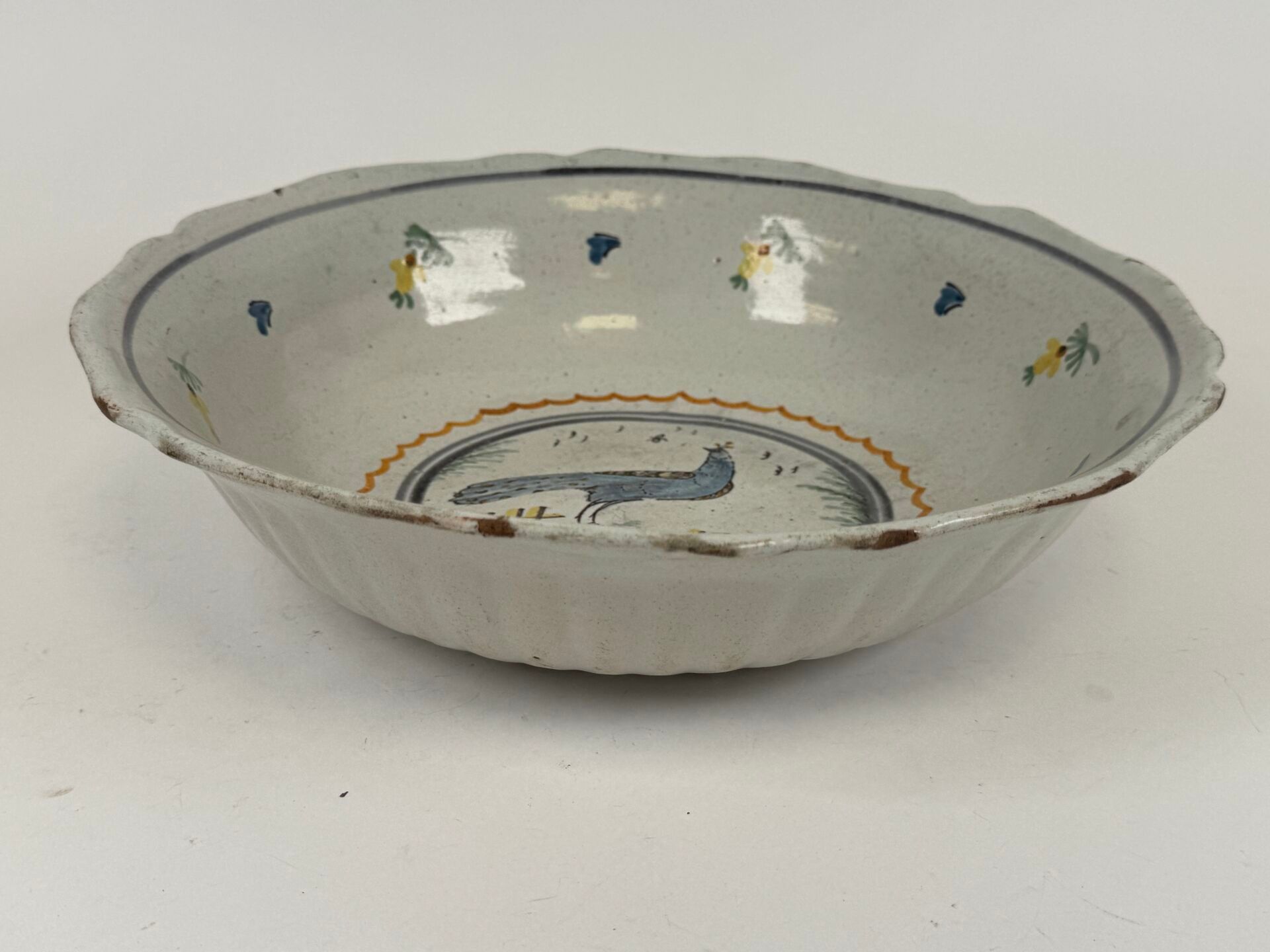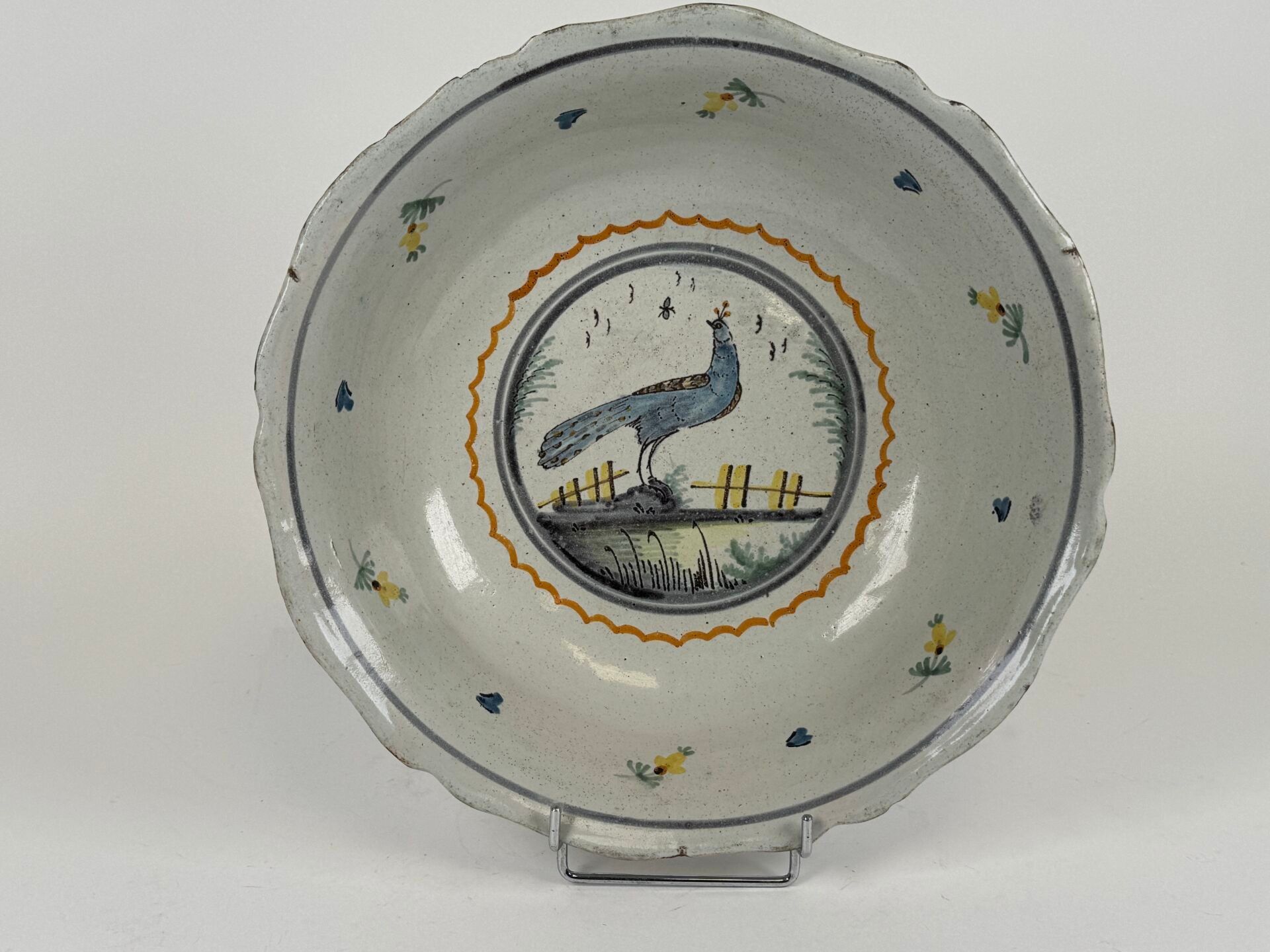 A polychrome earthenware salad bowl with a peacock in the centre.