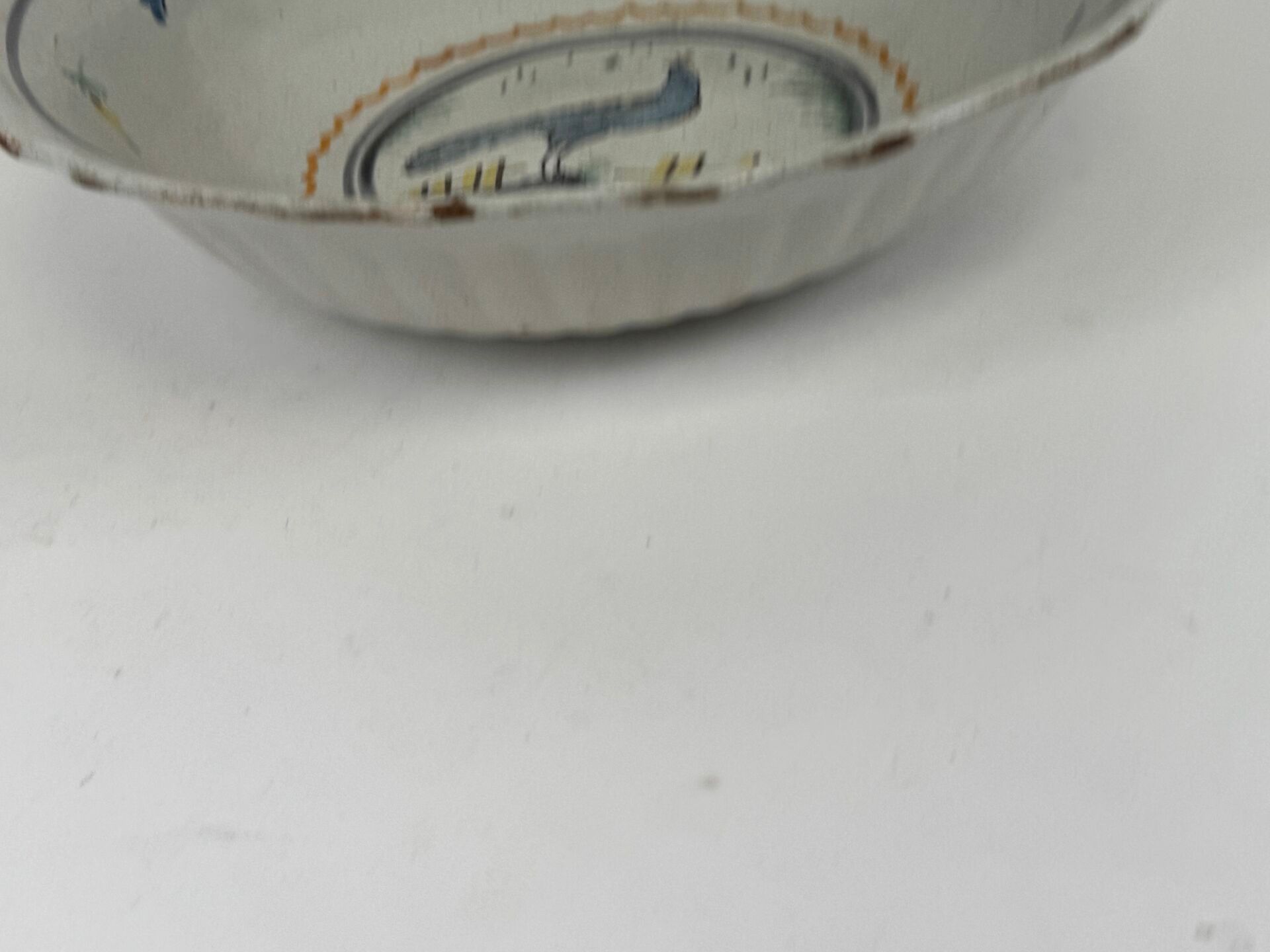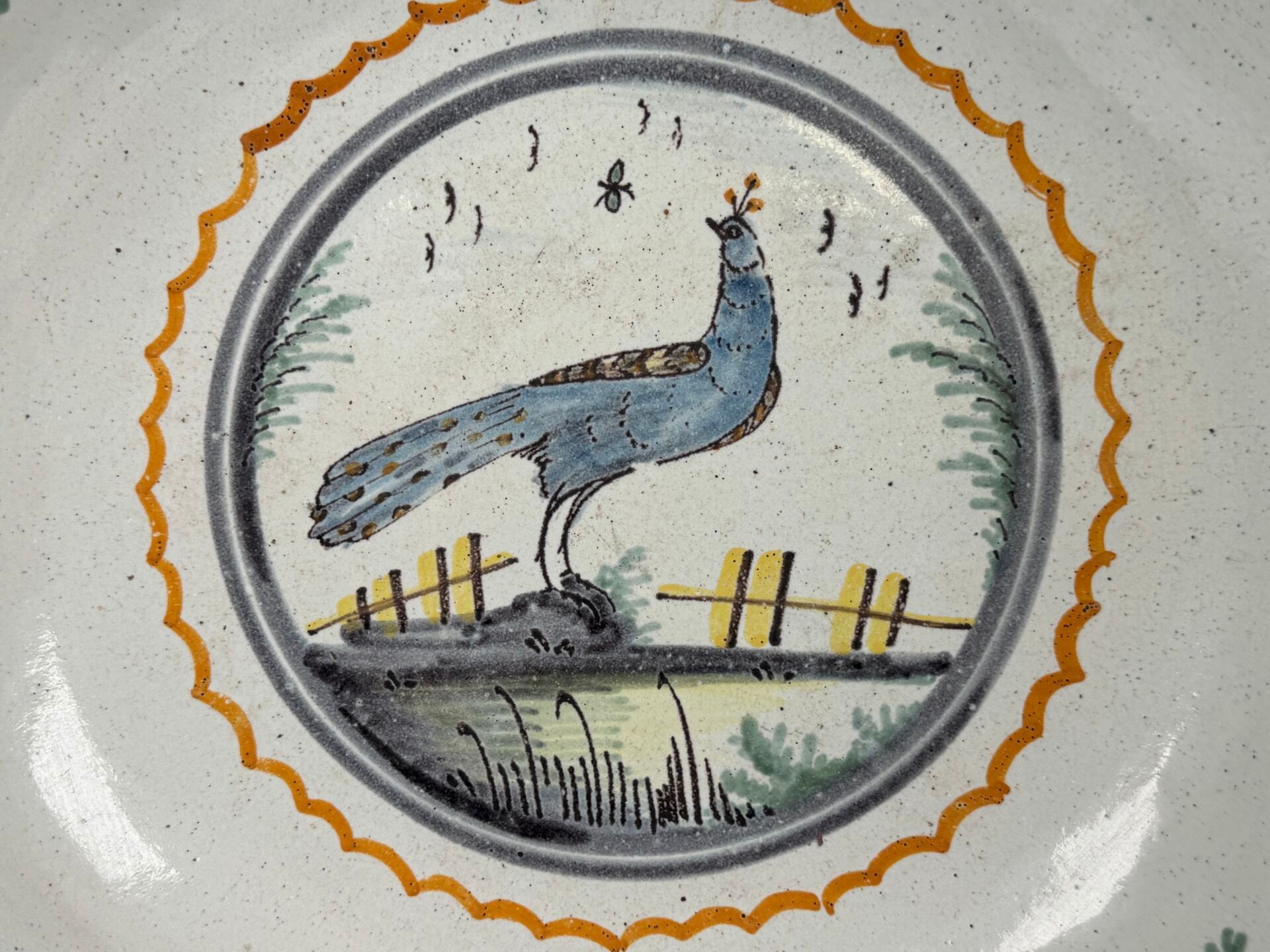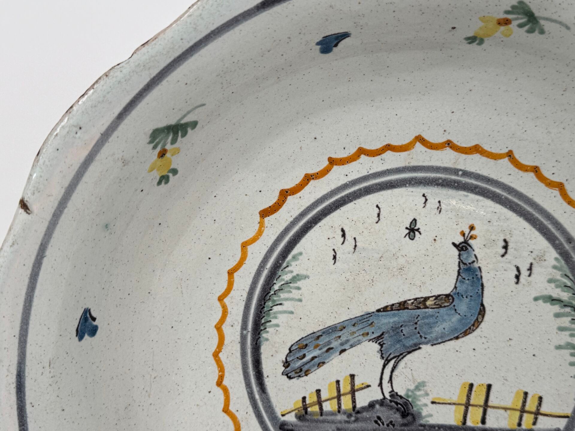 A polychrome earthenware salad bowl with a peacock in the centre.