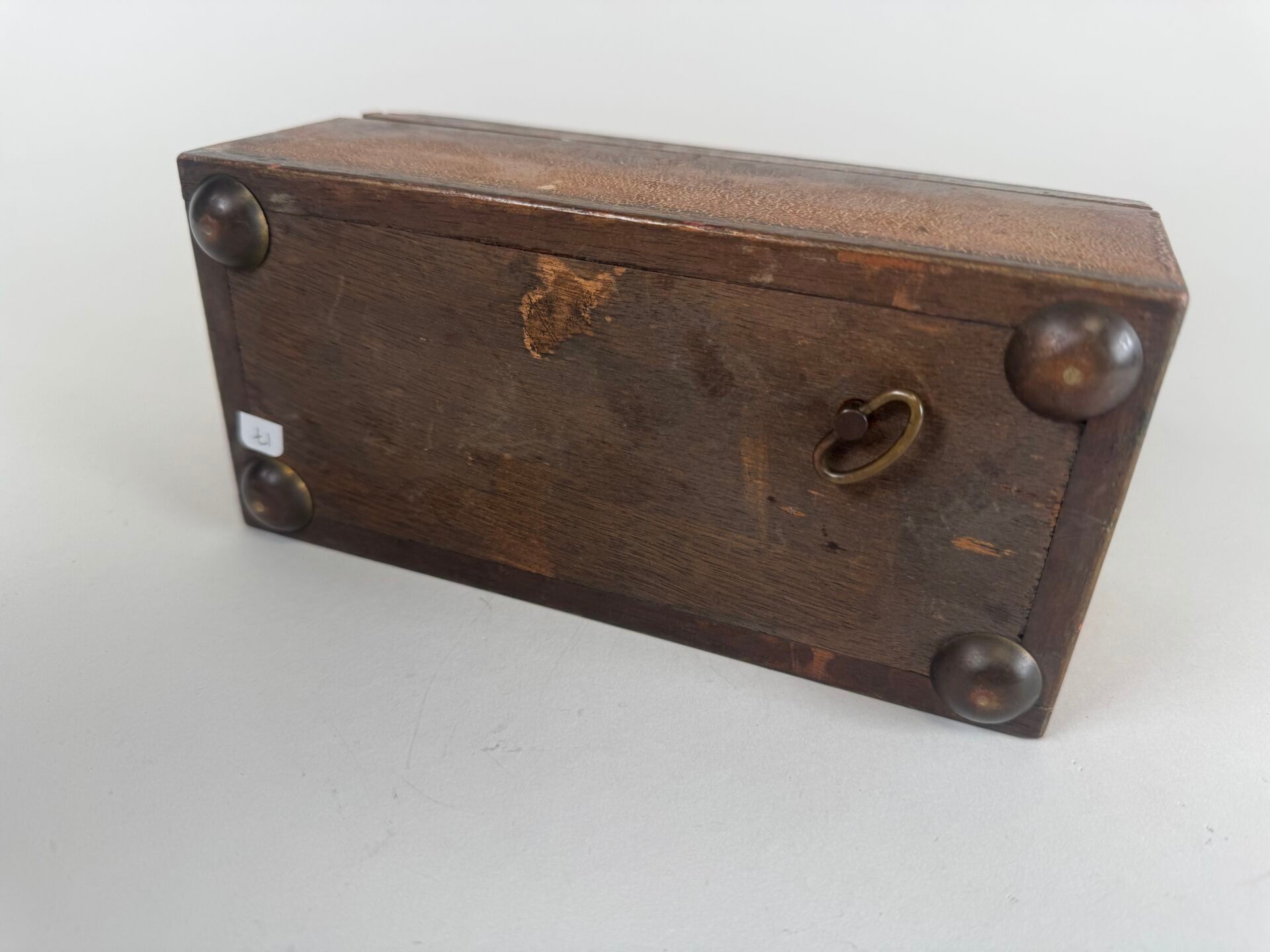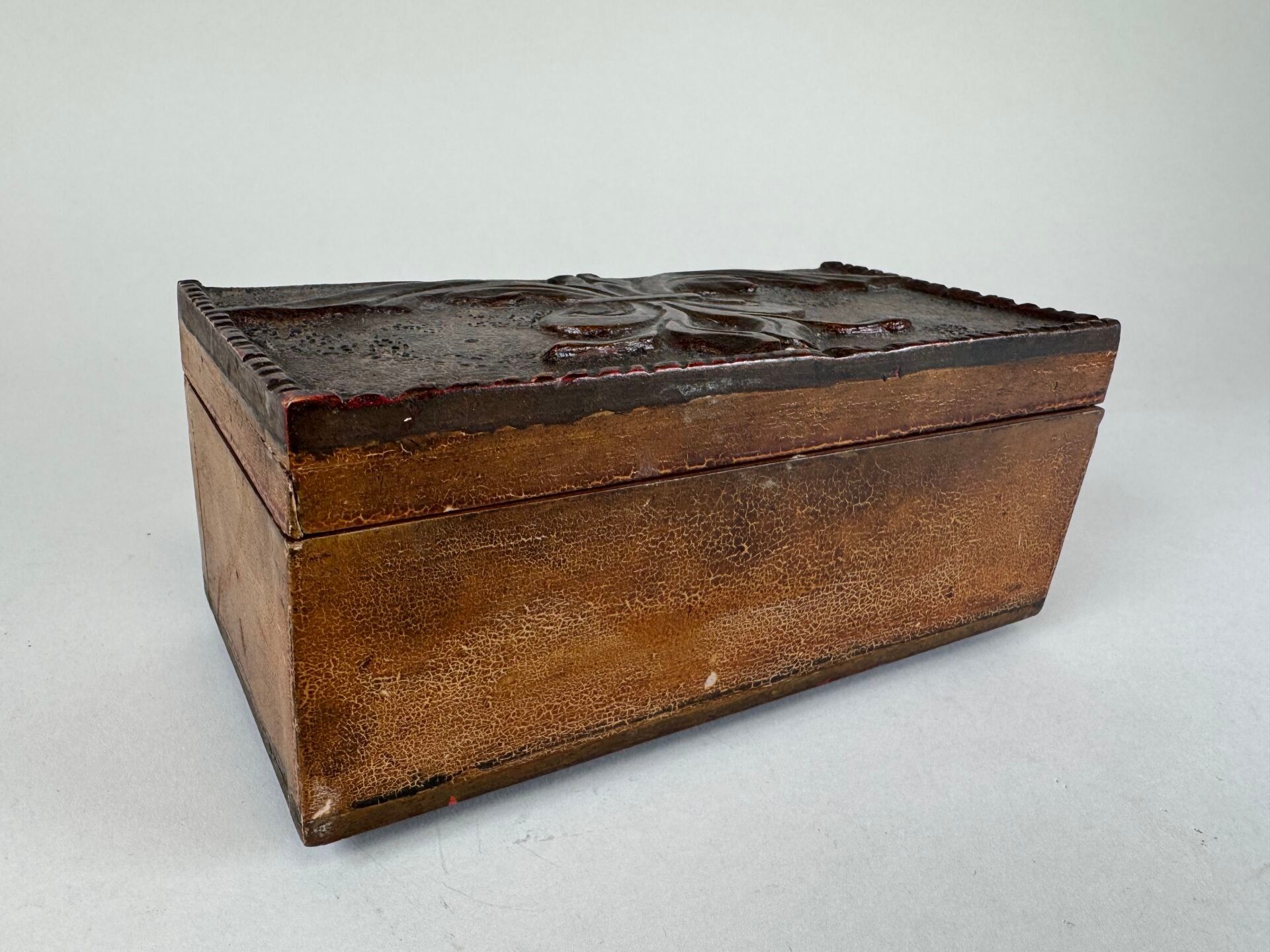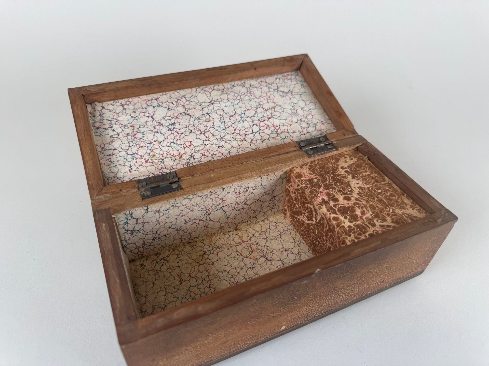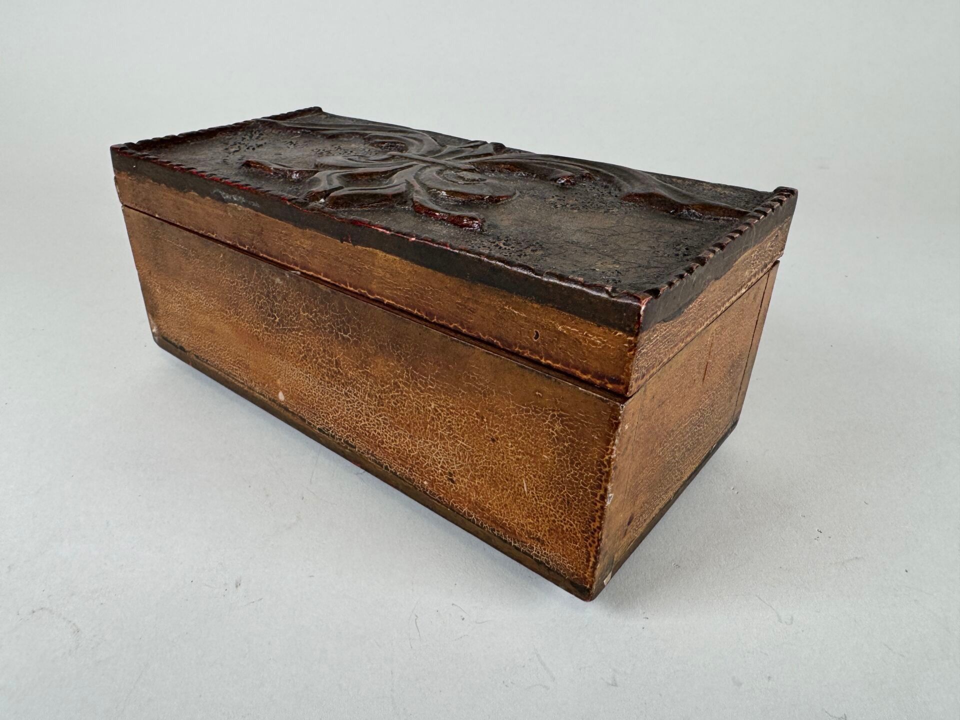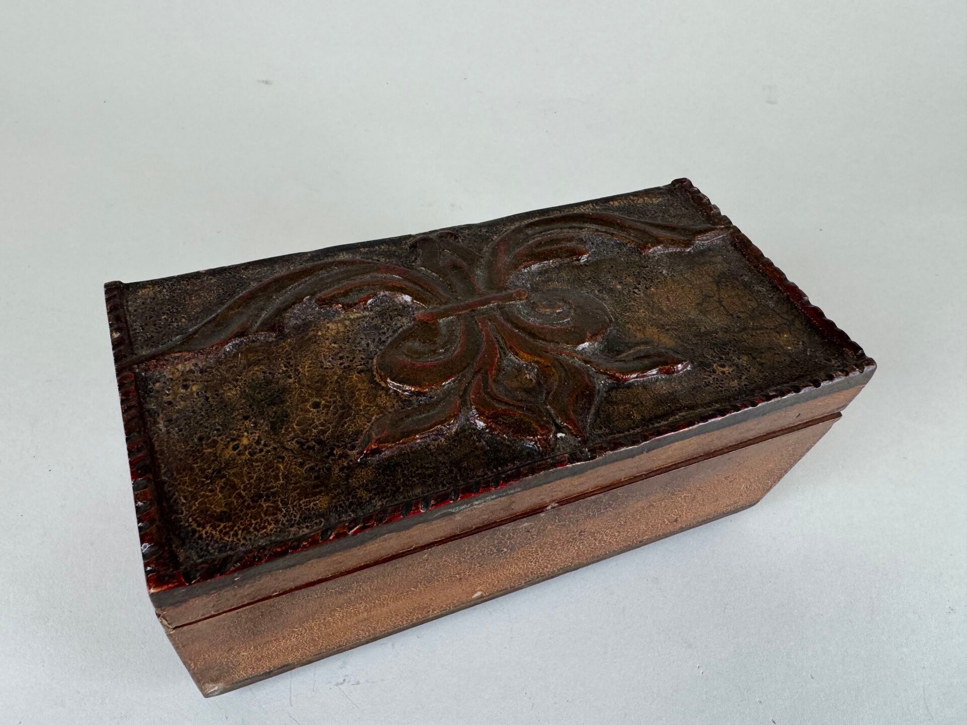 Rectangular music box in carved wood, the lid decorated with a stylised fleur-de-lys.
