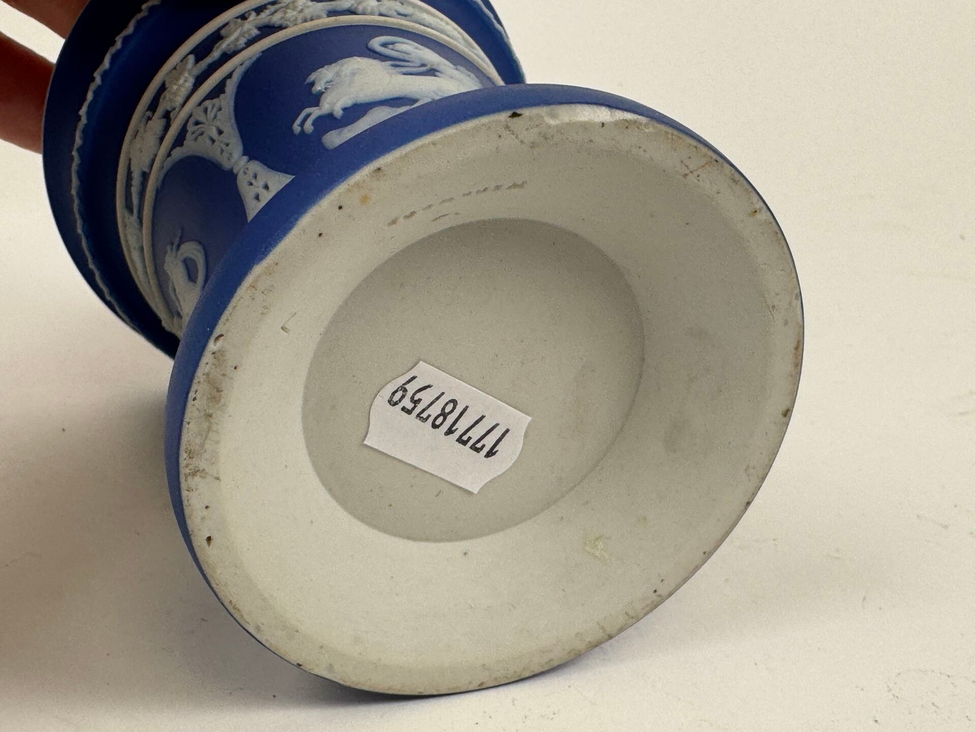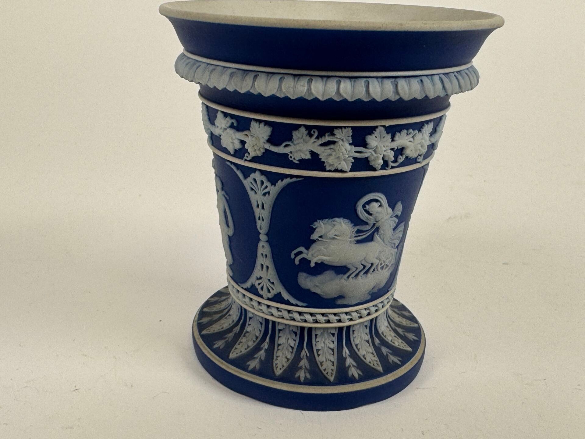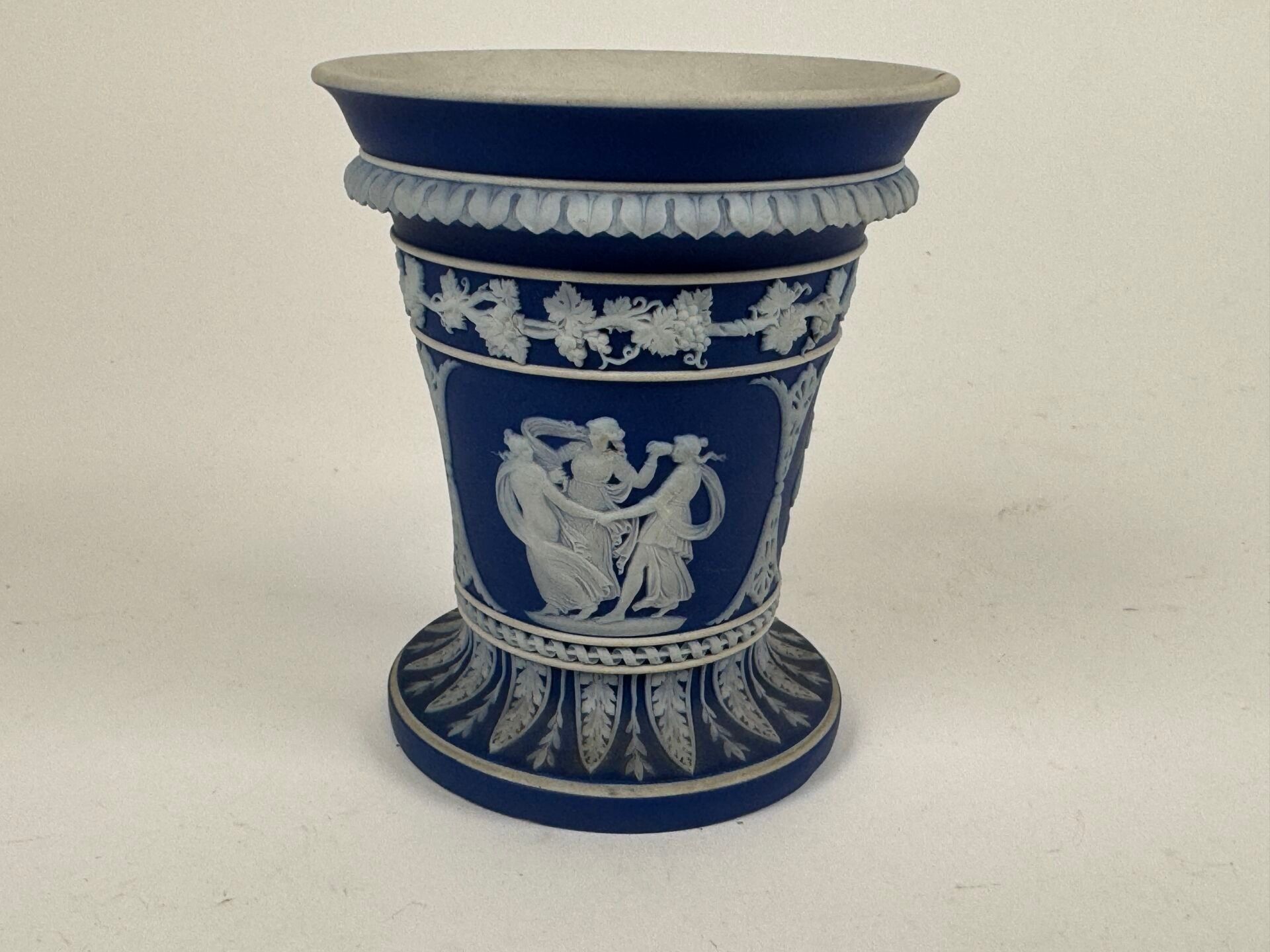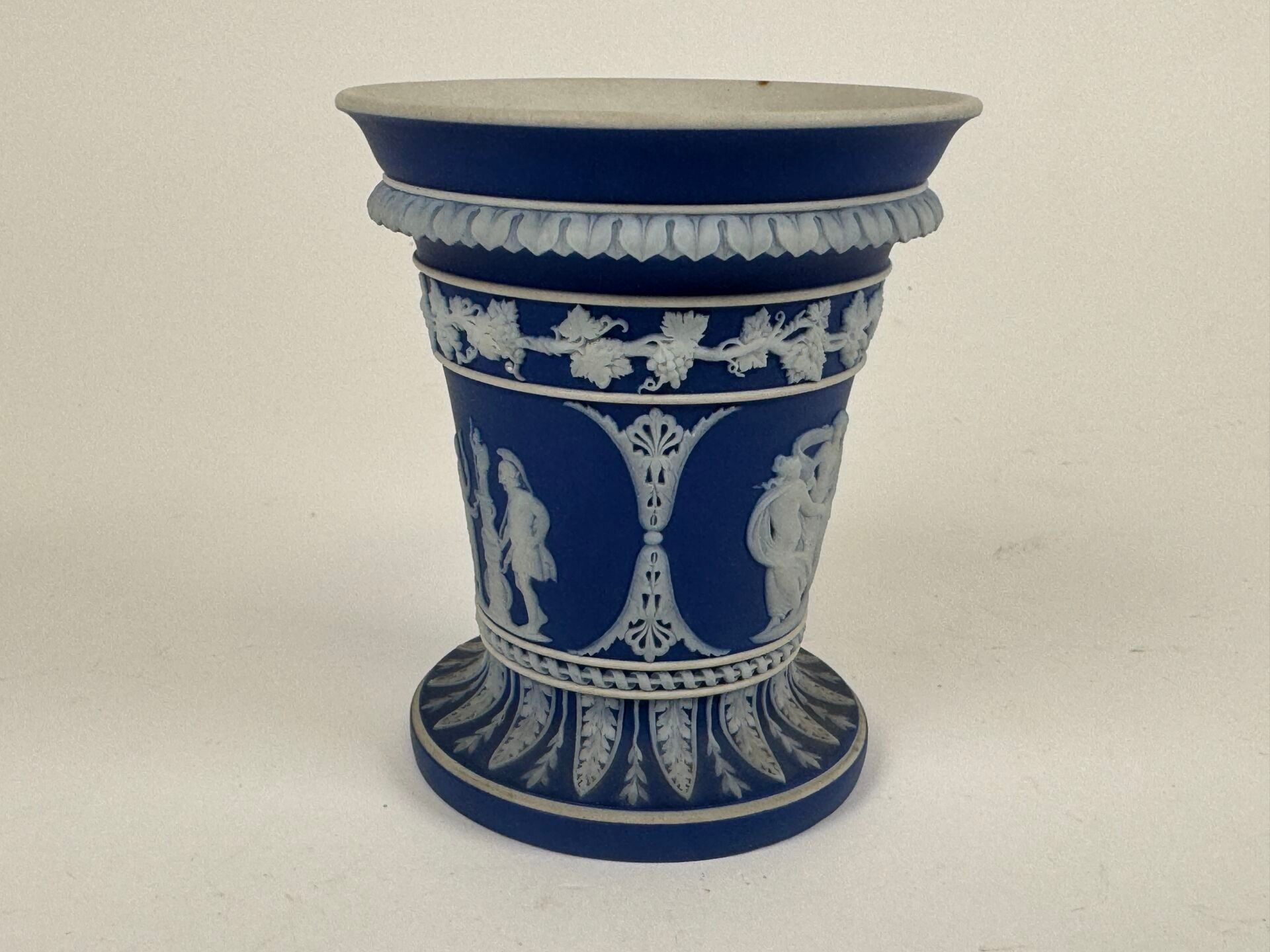 WEDGWOOD. A small biscuit porcelain vase on a blue ground de…
