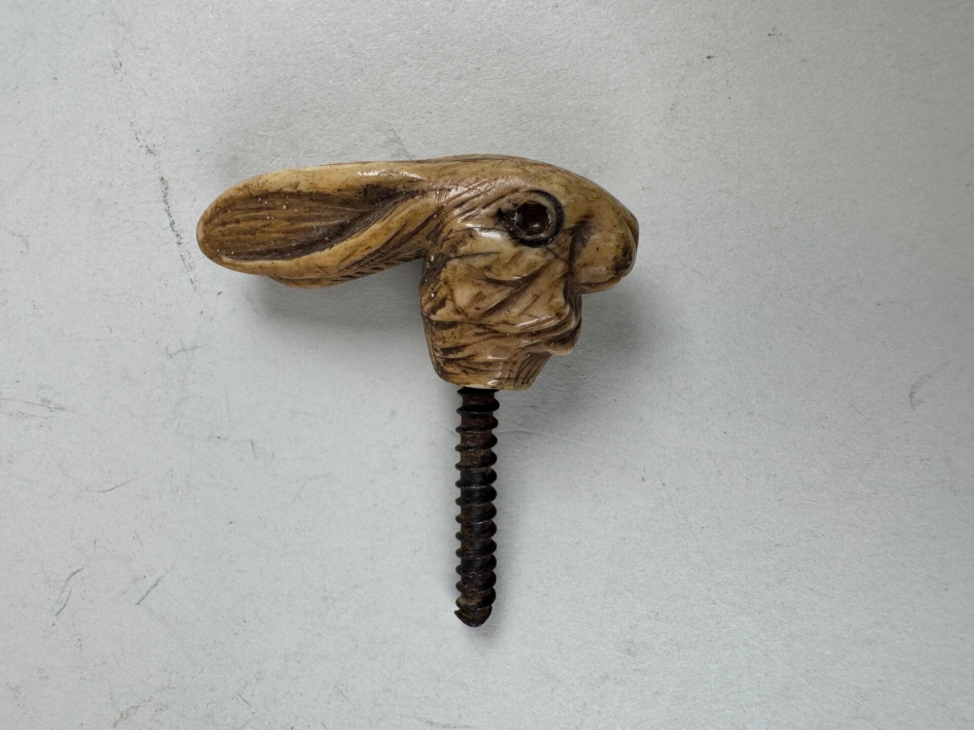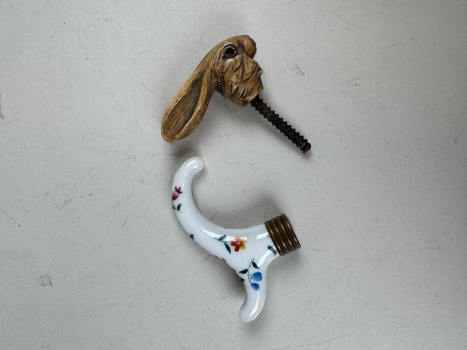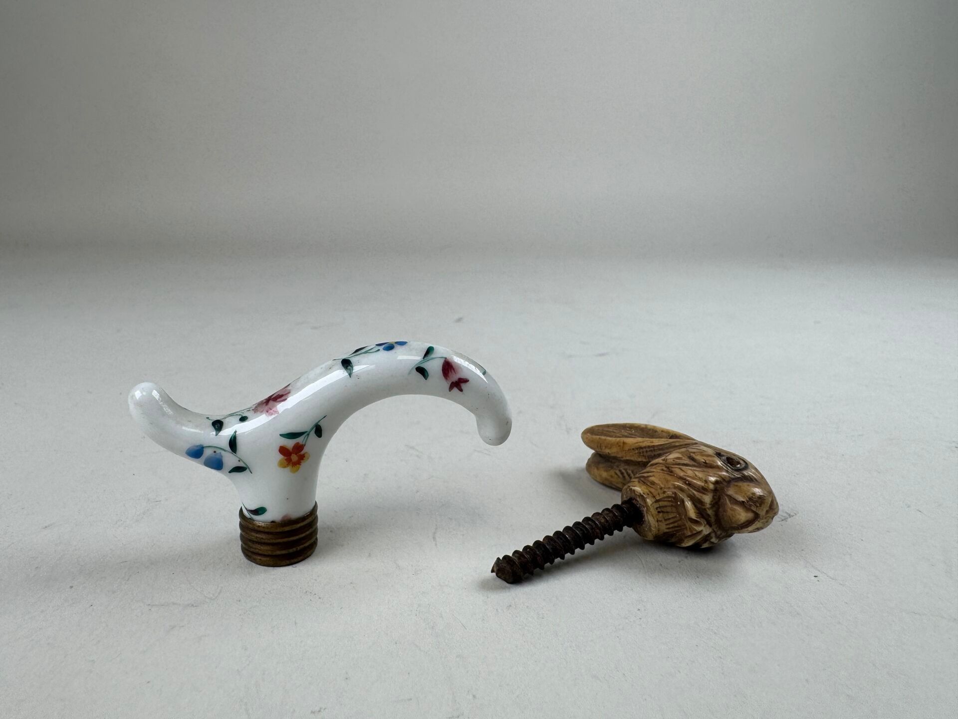 Two cane or whip knobs, one in polychrome porcelain decorated with flowers, the second in ivory with a rabbit's head (5 x 4.5 cm).