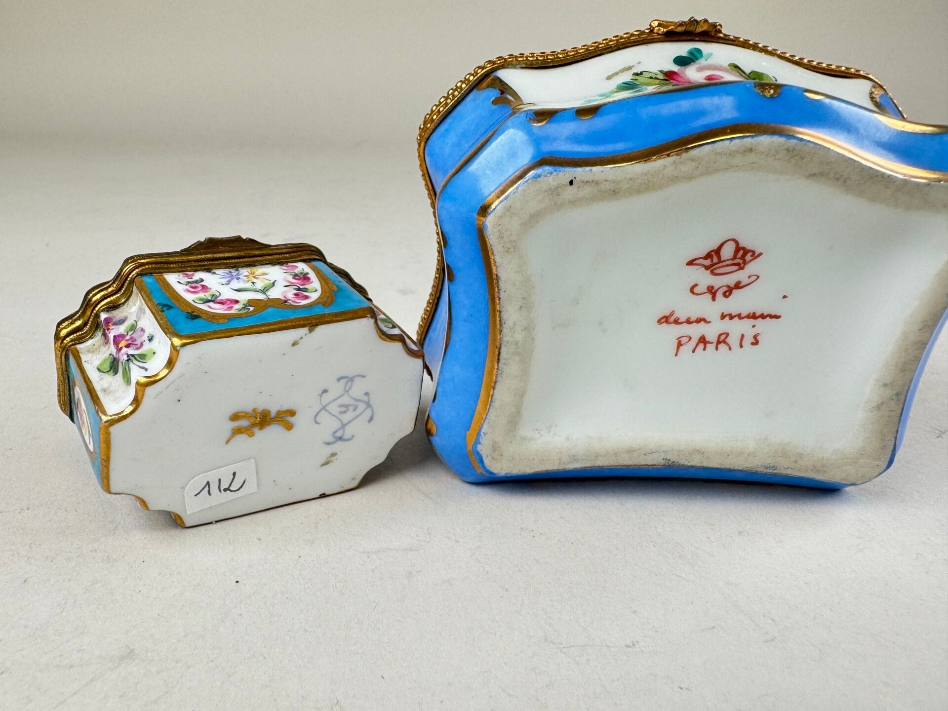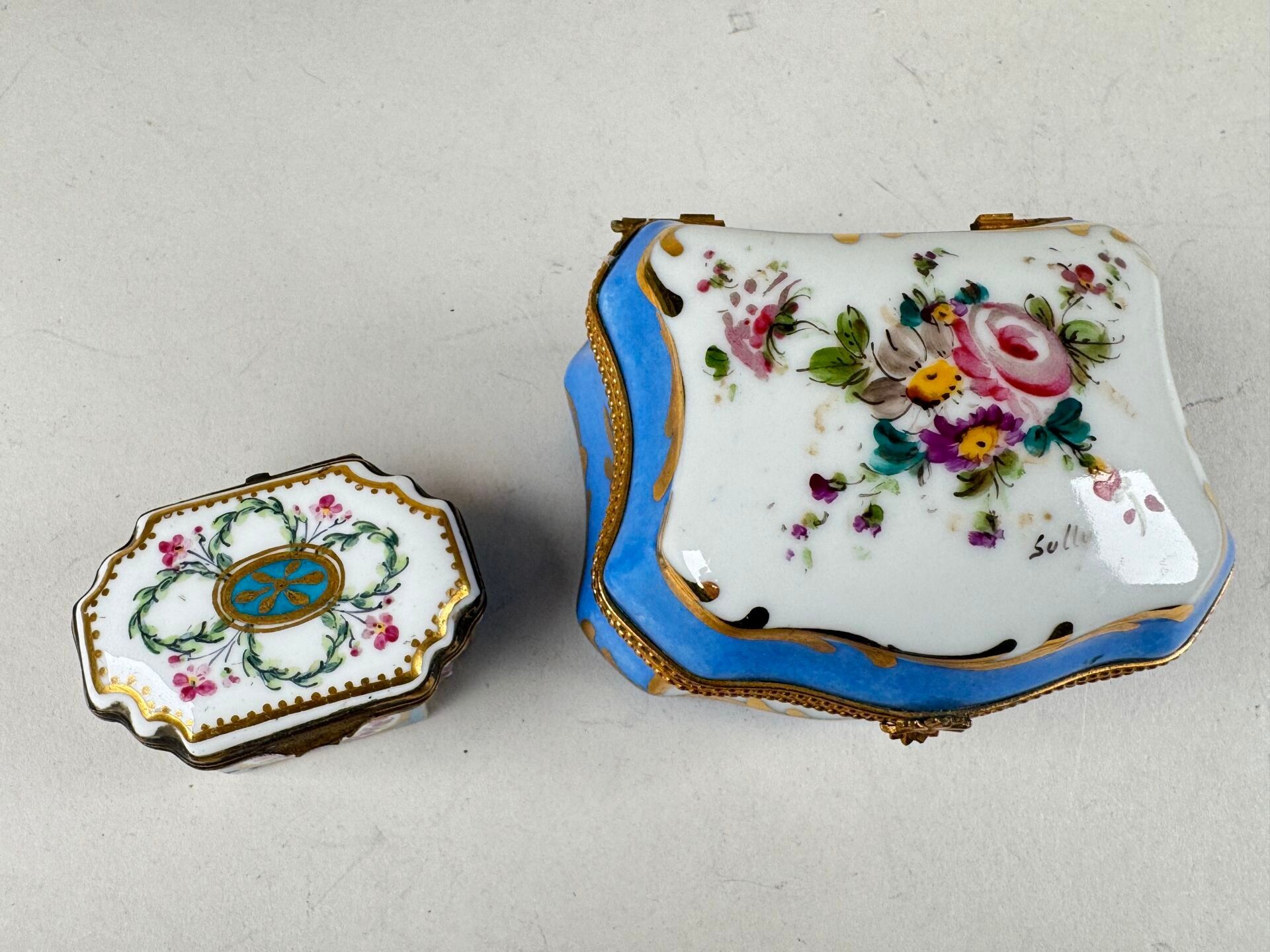 Two small polychrome and gold porcelain pillboxes with ename…
