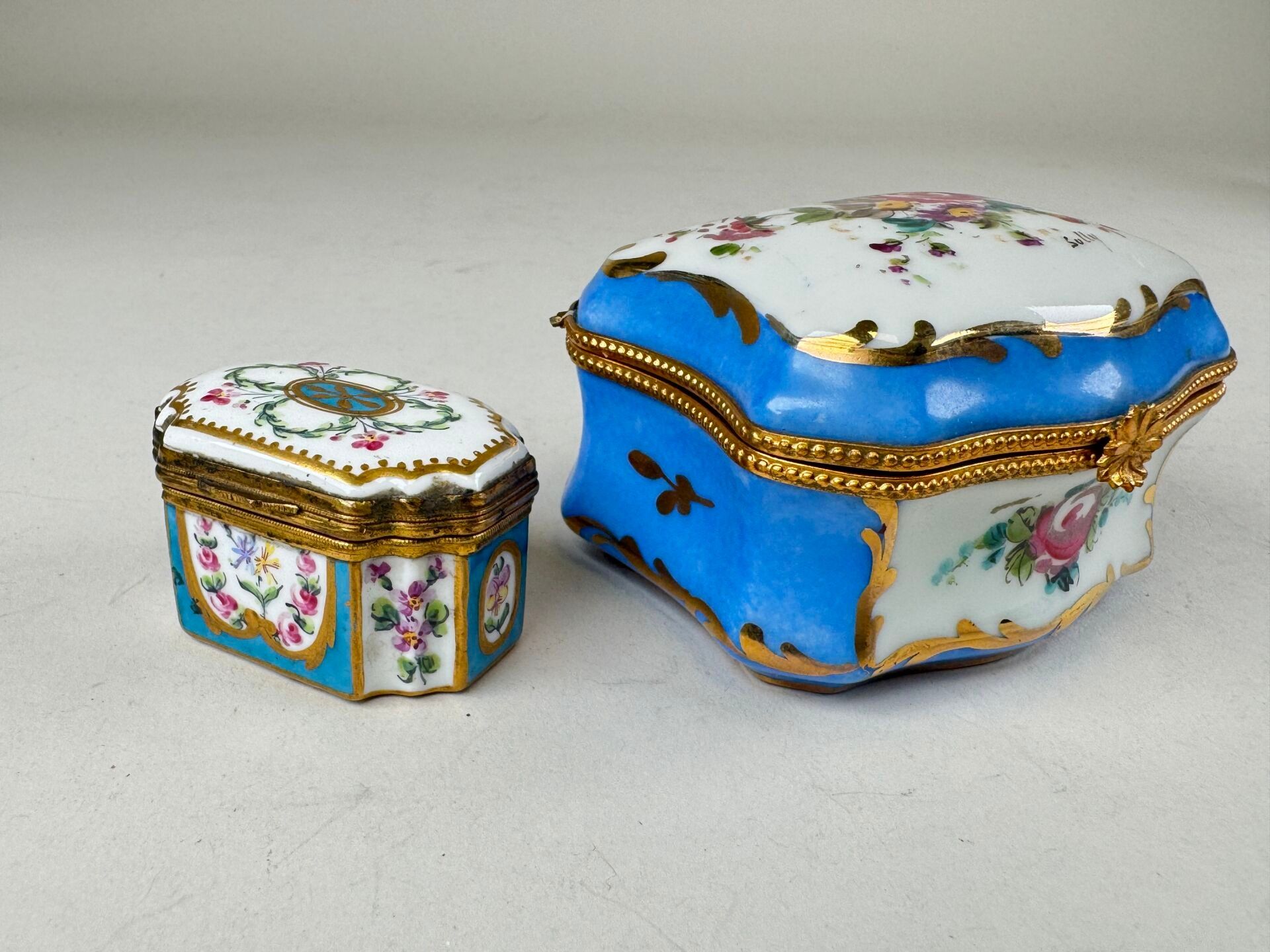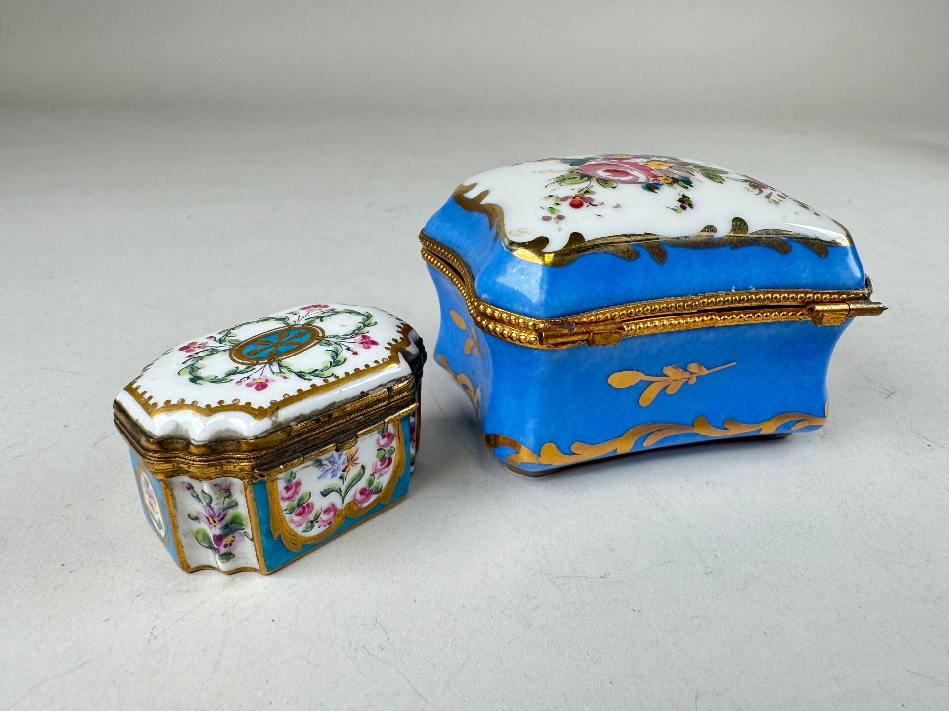 Two small polychrome and gold porcelain pillboxes with enamelled flower decoration, the brass mounts.