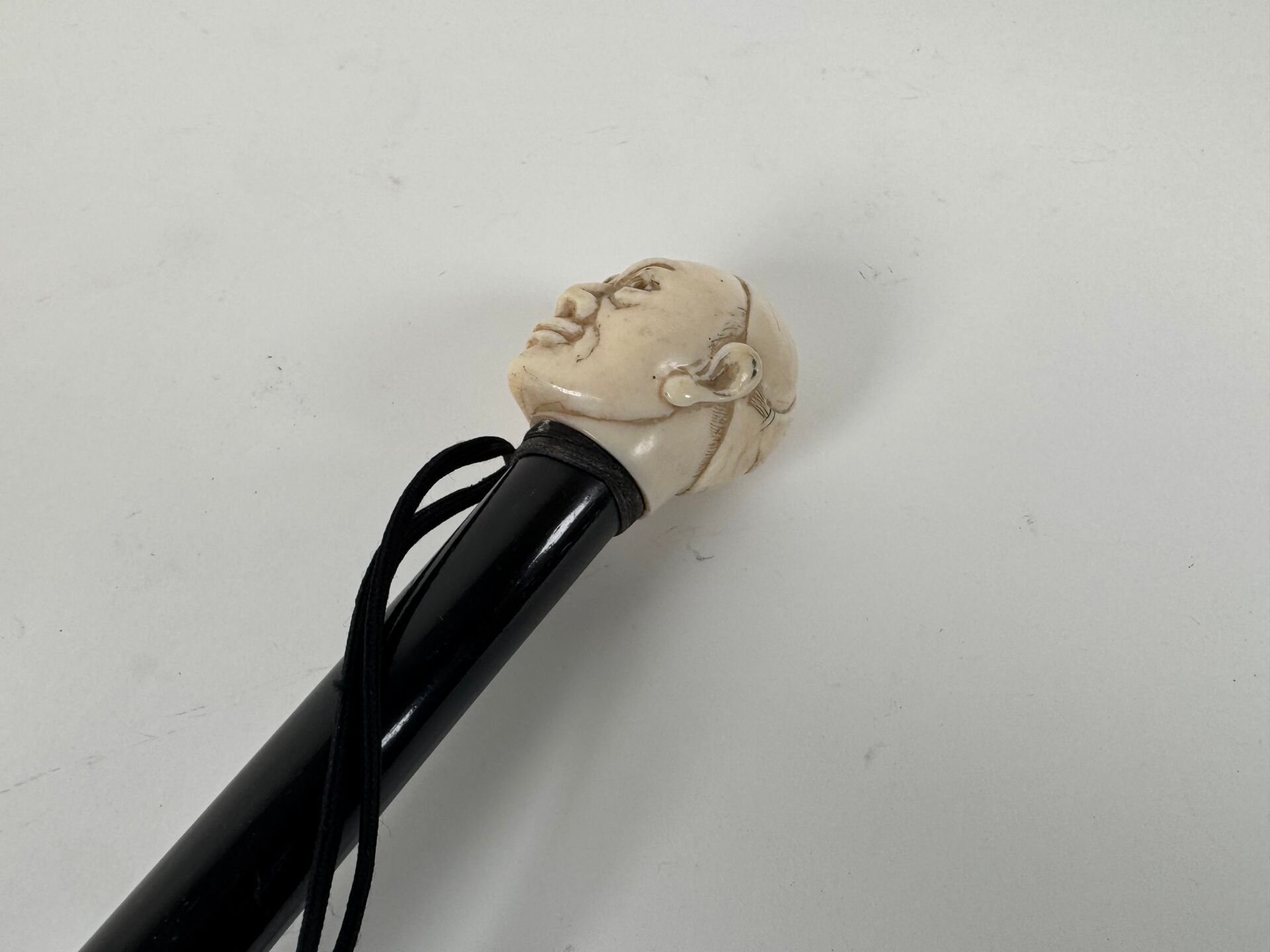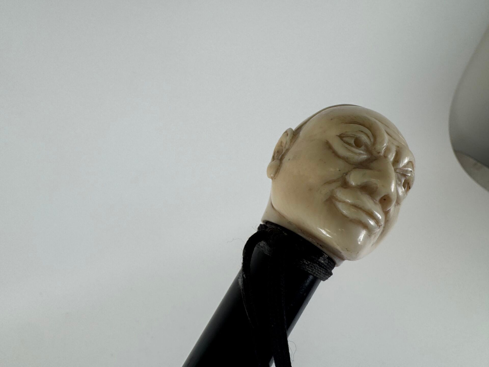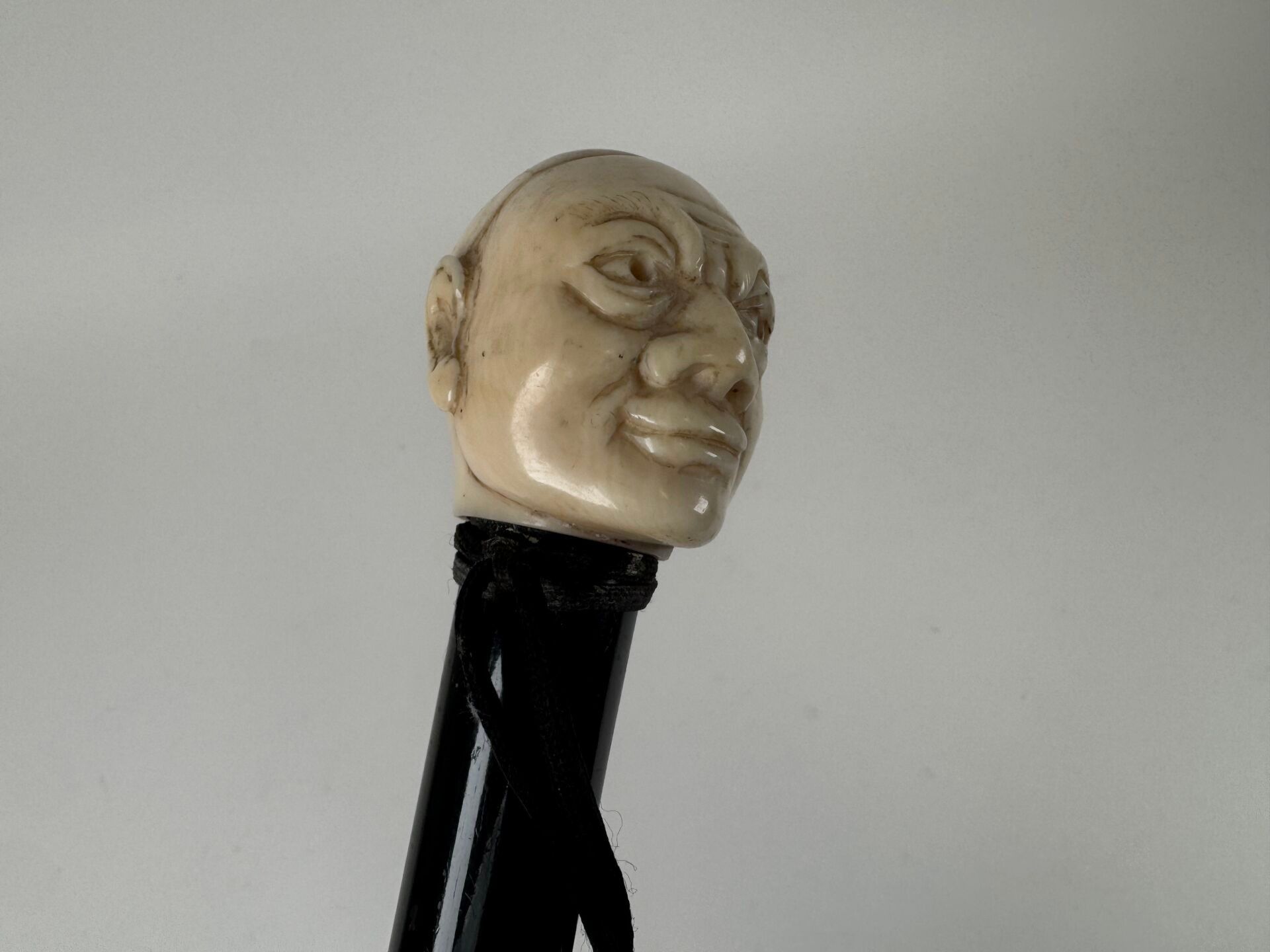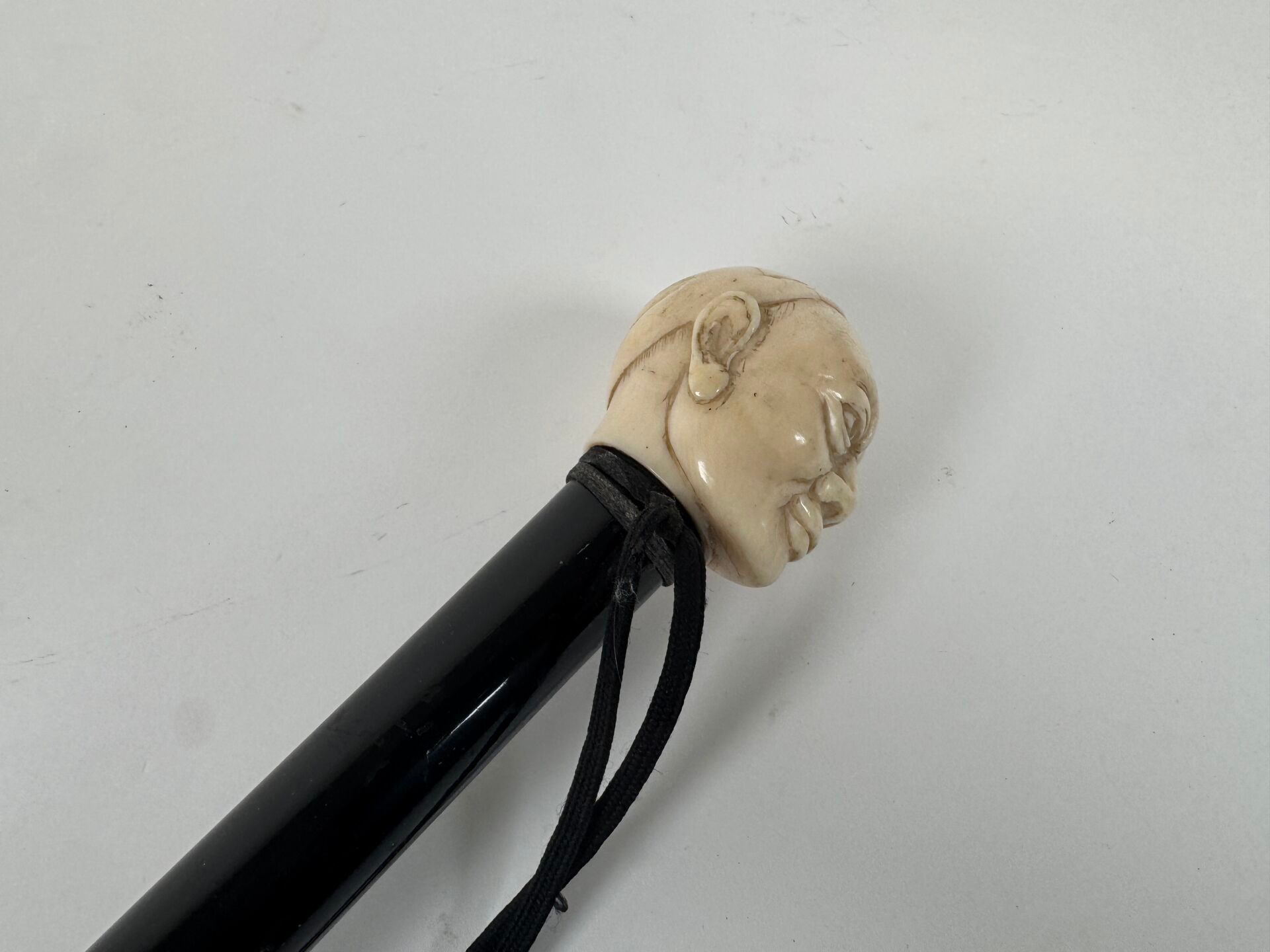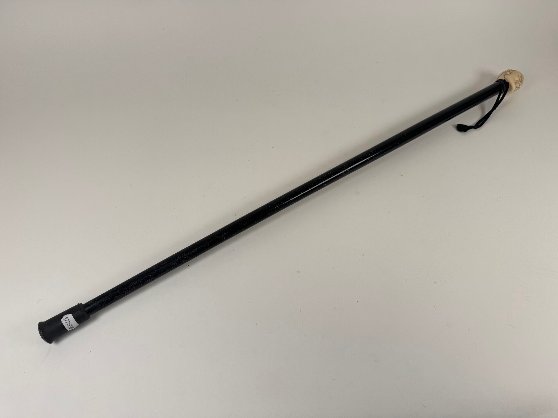 Blackened wooden cane with a carved ivory knob decorated with a face.