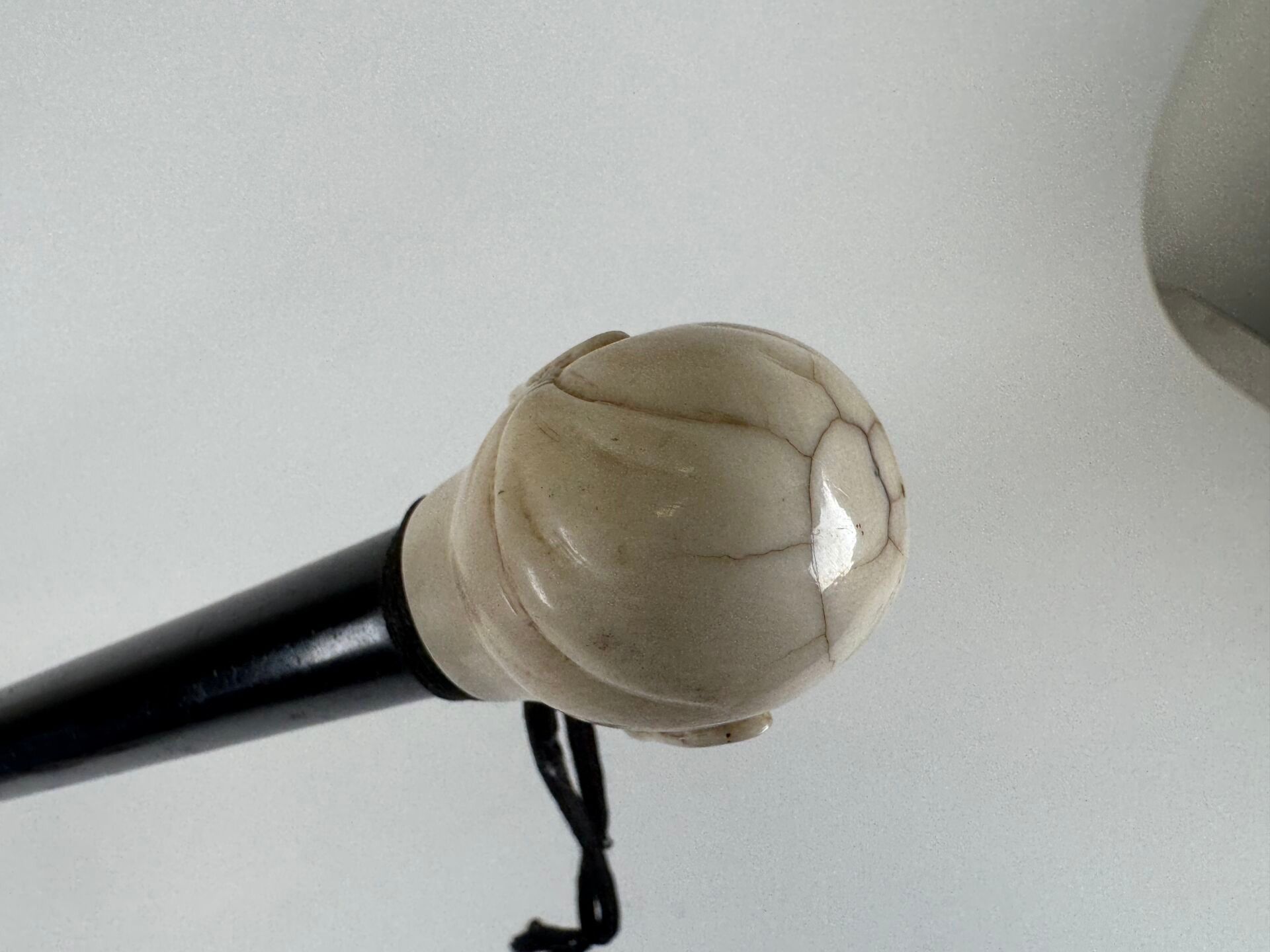 Blackened wooden cane with a carved ivory knob decorated wit…