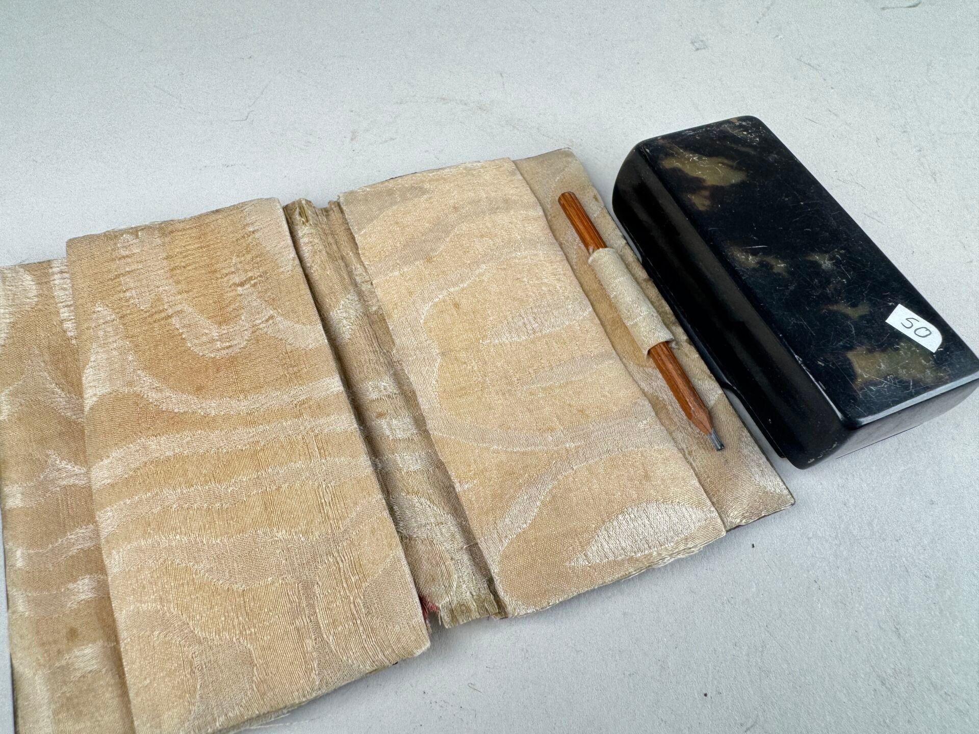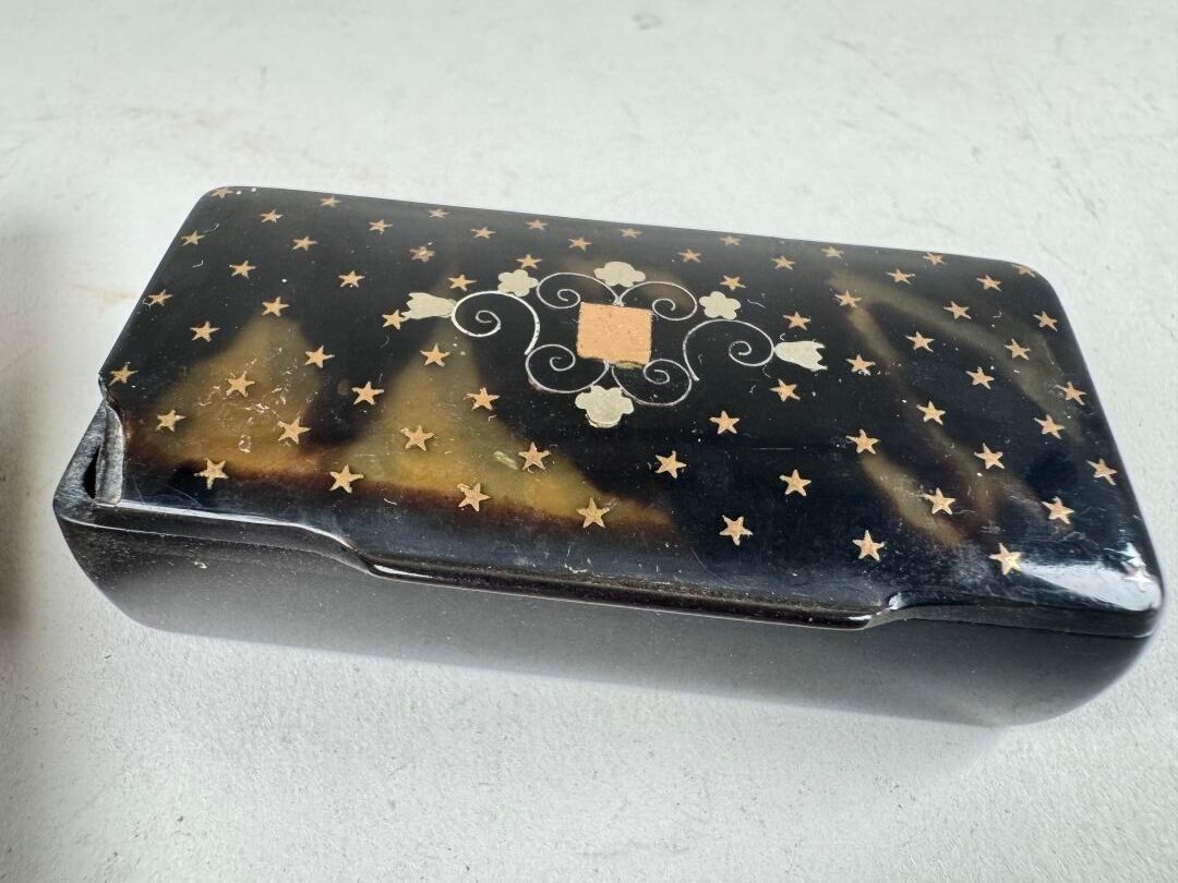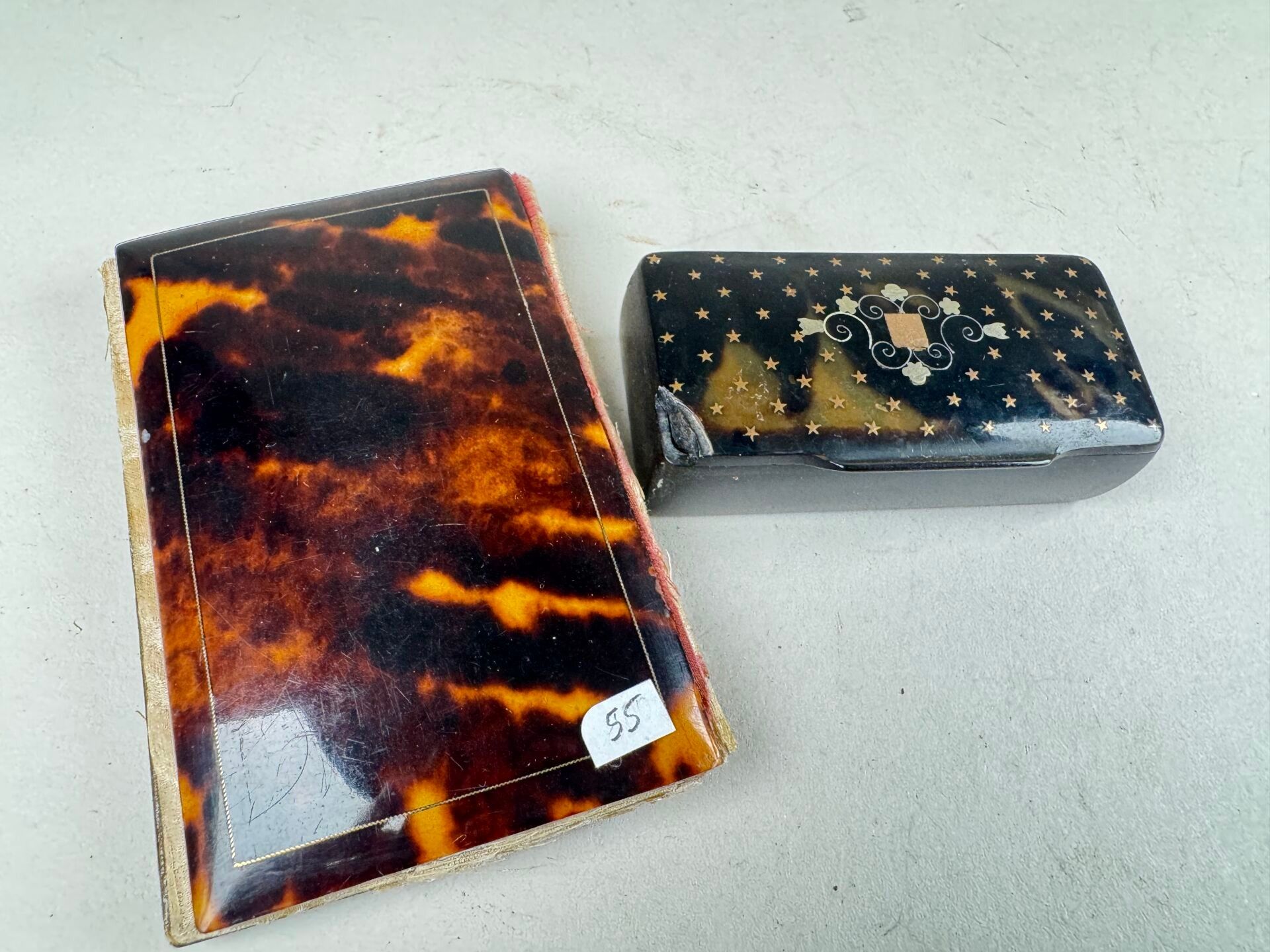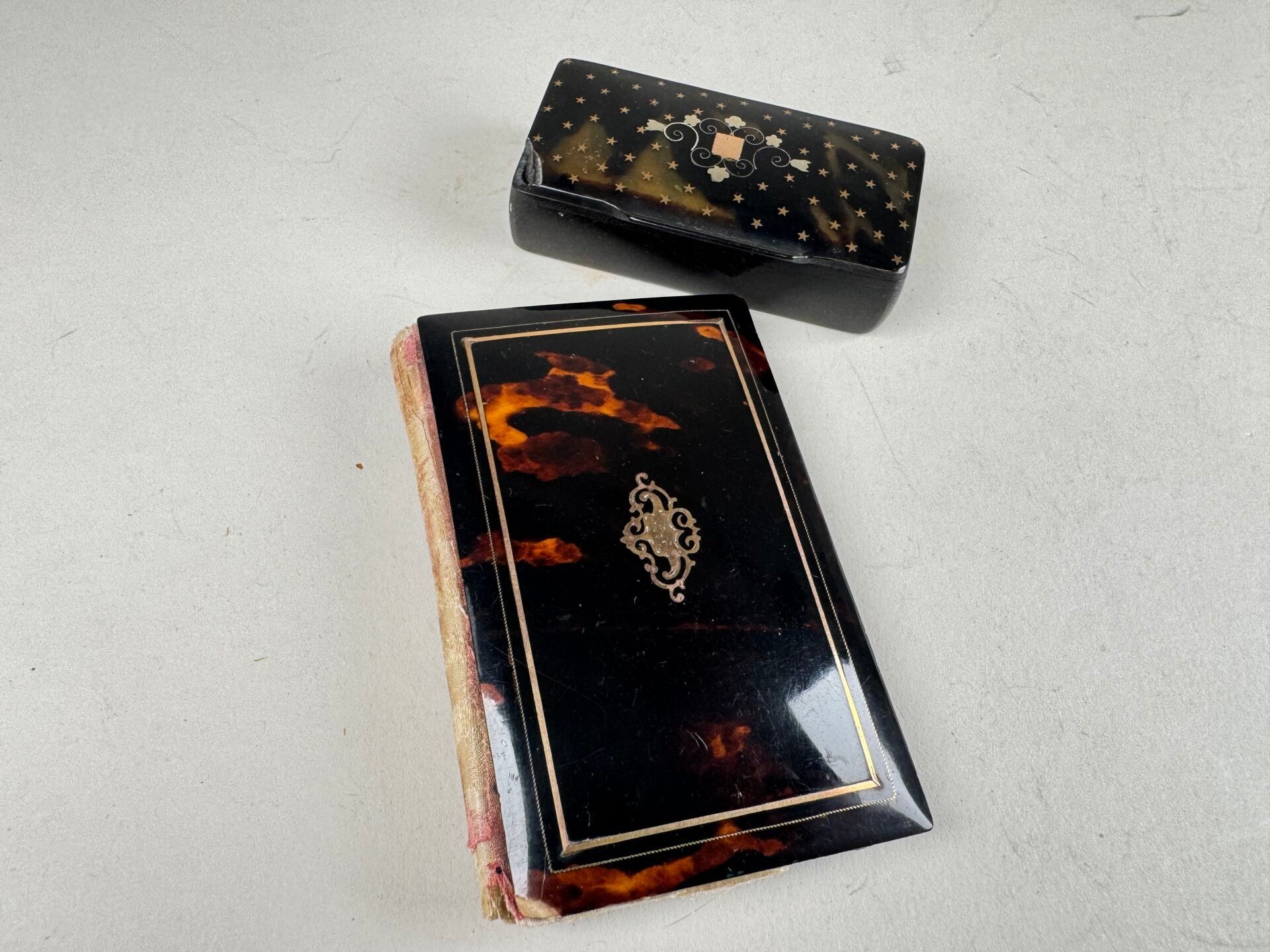 A tortoiseshell and horn set comprising a rectangular snuffbox decorated with stars and a coat of arms, and a dance card featuring foliate scrolls (9.5 x 6 cm).
