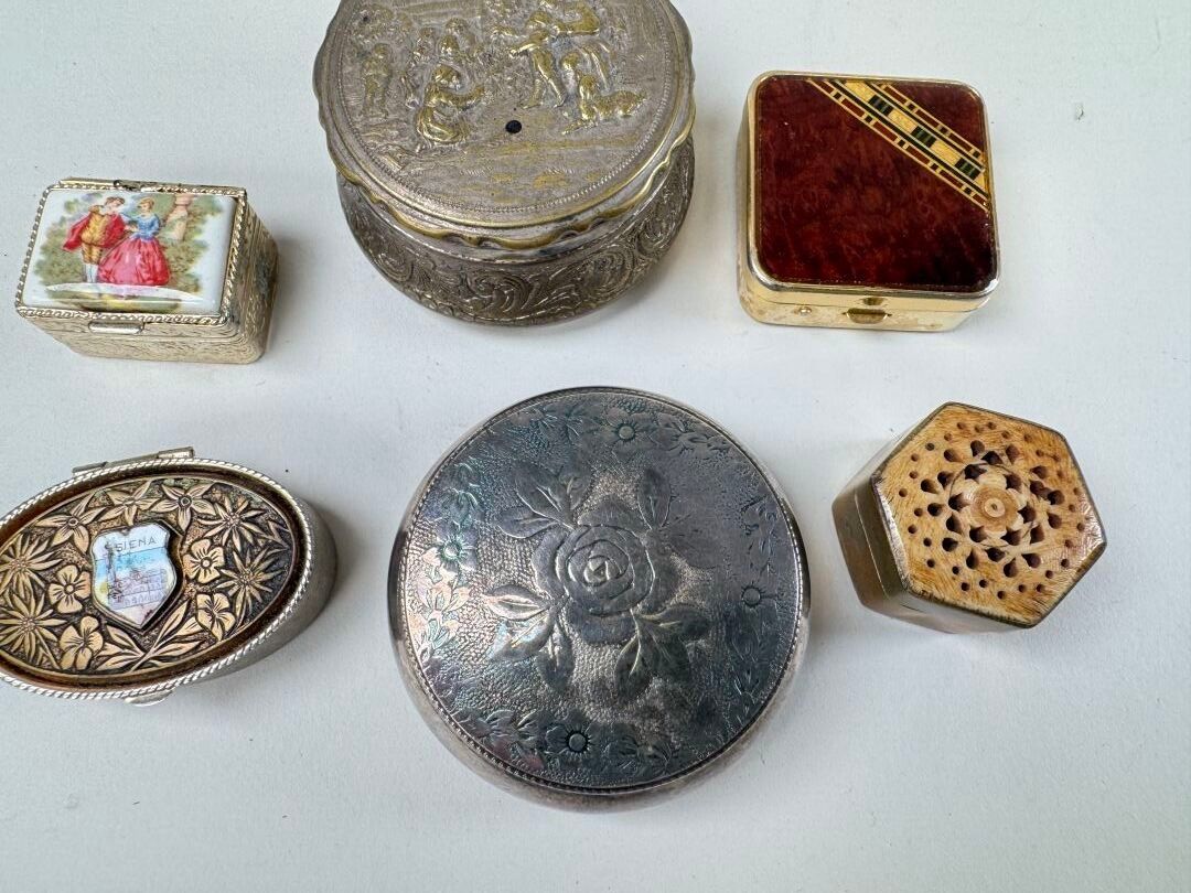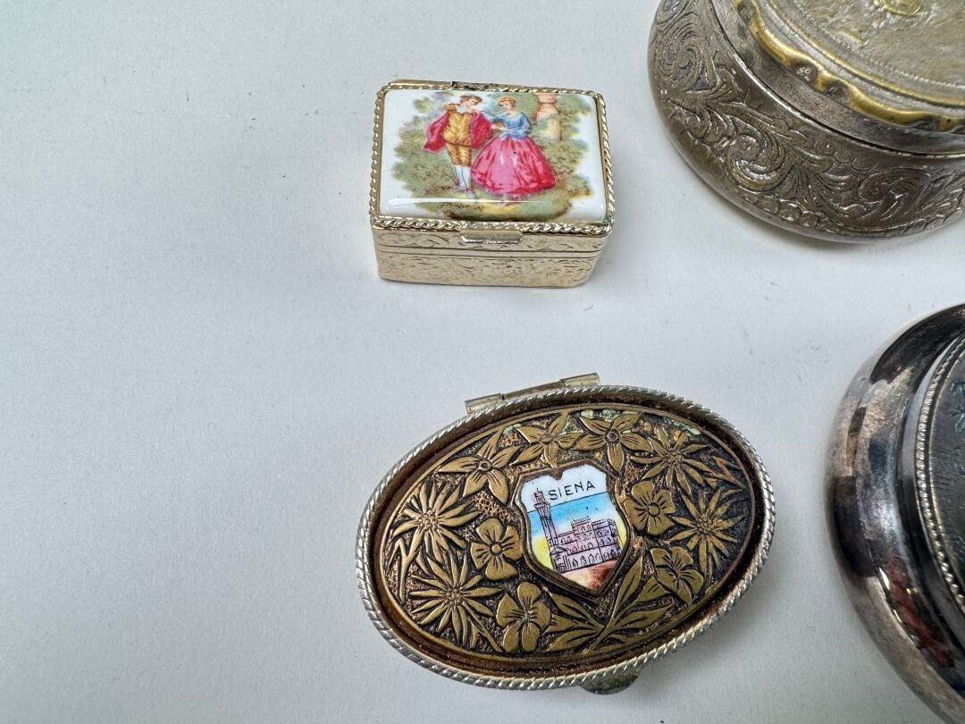 Six small metal boxes or pillboxes, gilded metal decorated w…