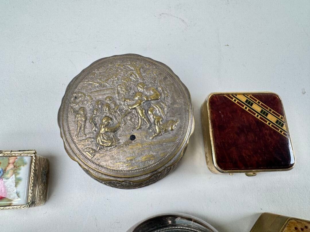 Six small metal boxes or pillboxes, gilded metal decorated with flowers and stylised motifs, one depicting a scene of a colin maillard (H. 3 cm and D. 6 cm).