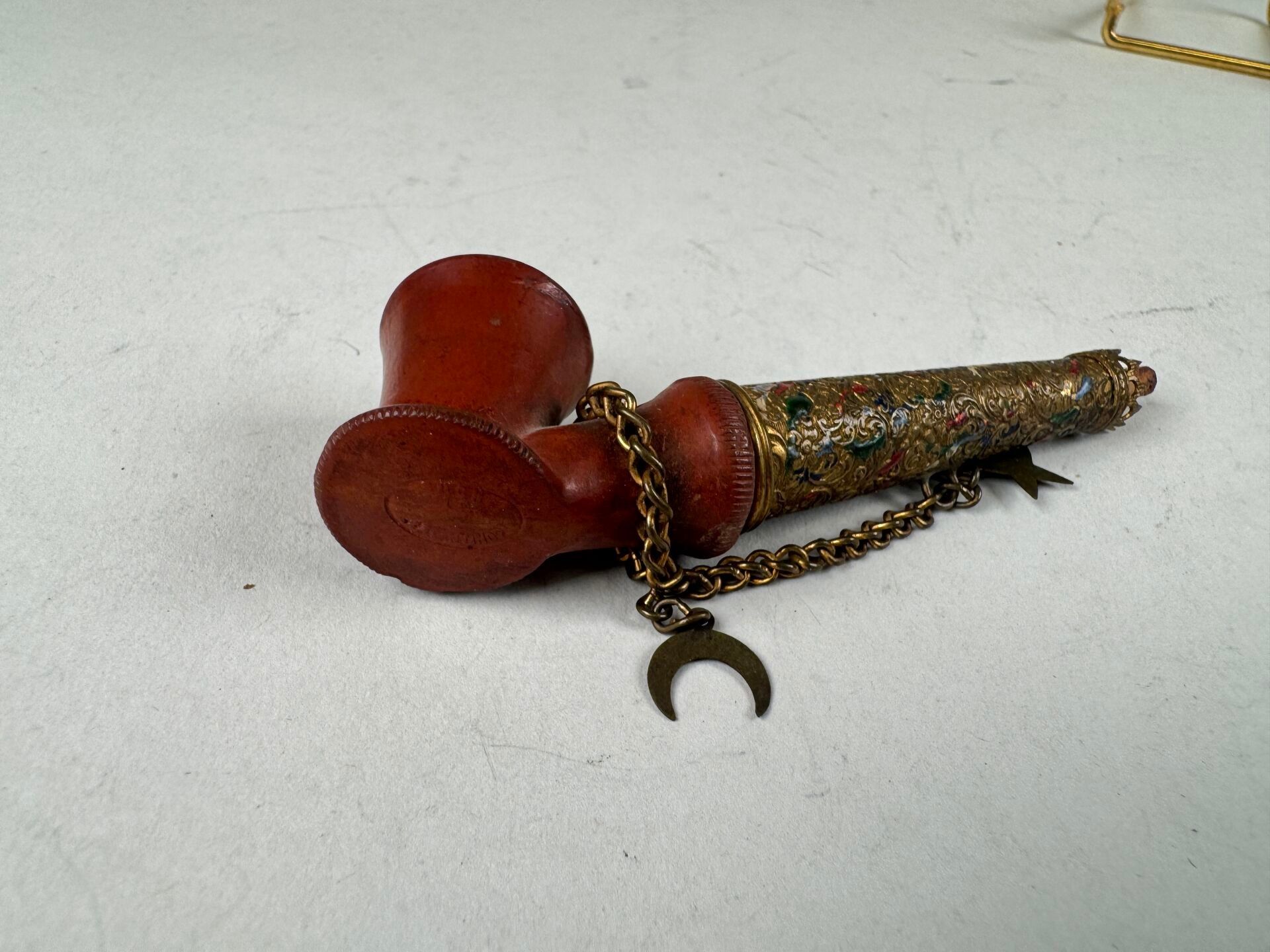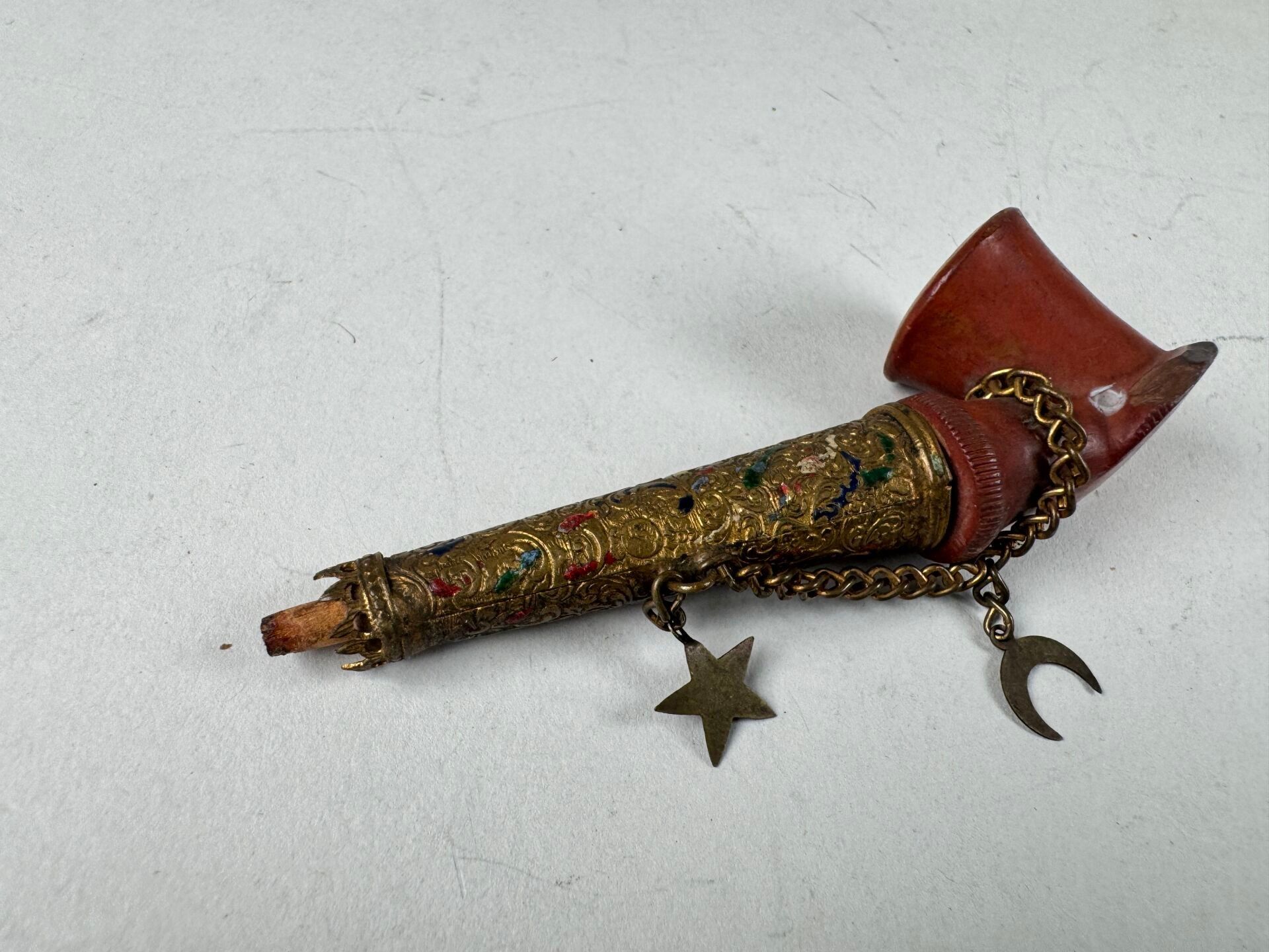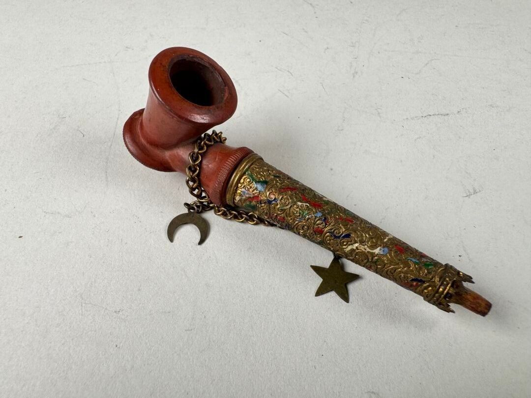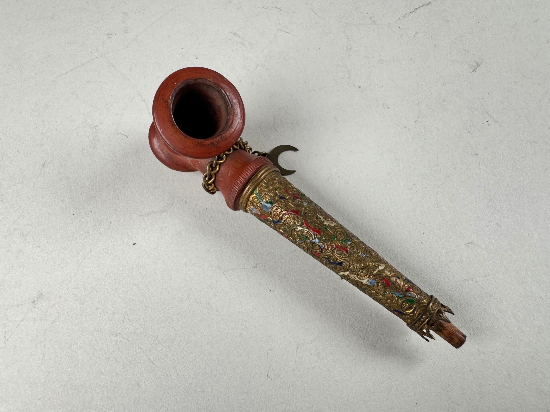 Small Ottoman pipe, red clay bowl, polychrome enamelled brass mouthpiece.