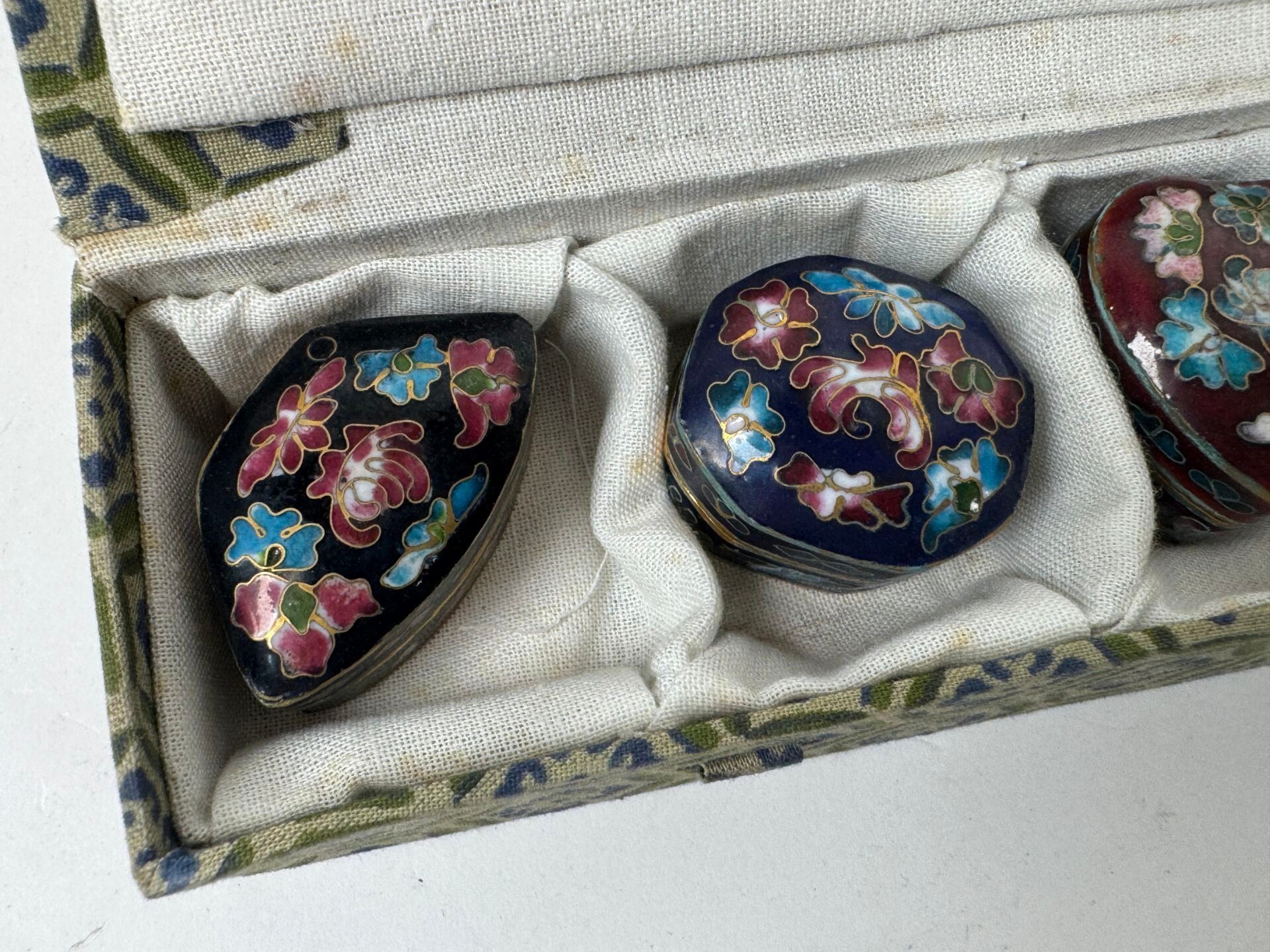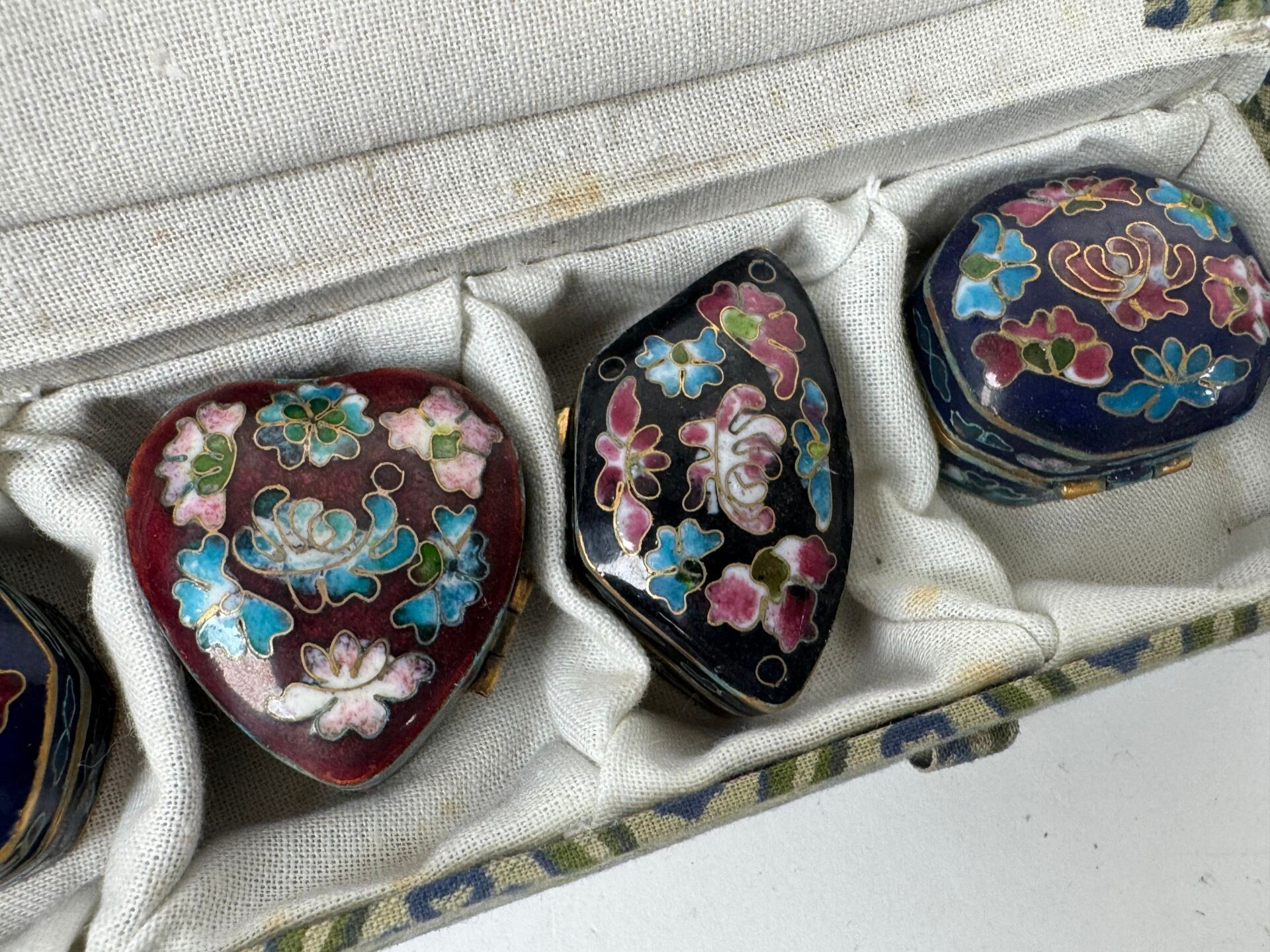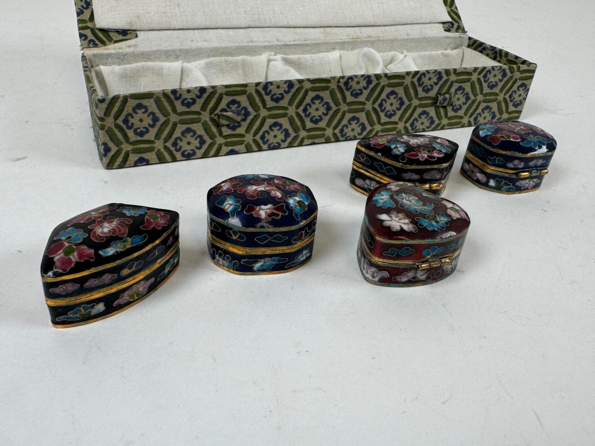 Set of 5 small pill boxes in copper and cloisonné enamels.