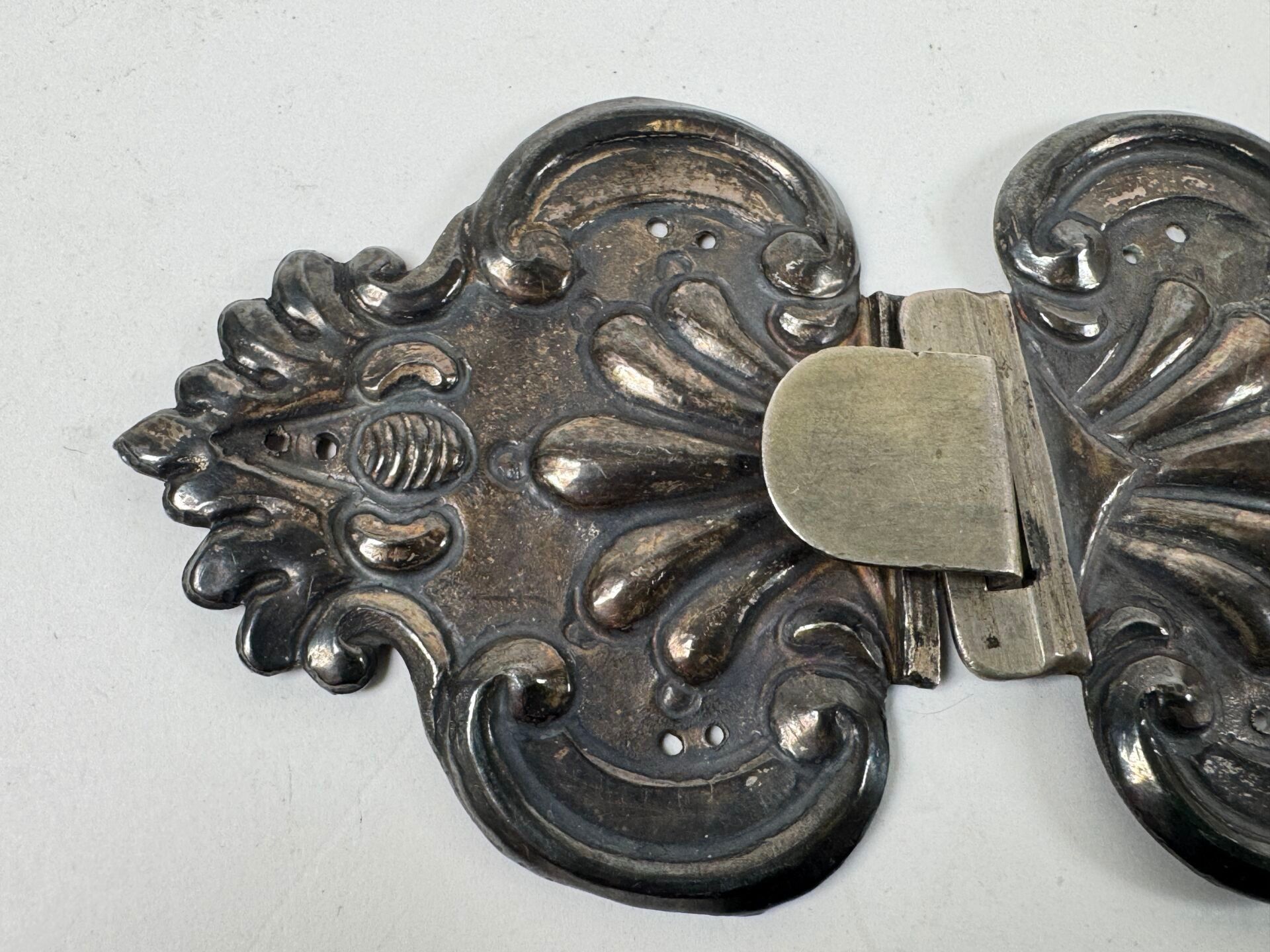 Cloak buckle and shoe buckle, one probably in silver with stylised shell decoration, the second in gilt metal (9.5 x 6.5 cm).