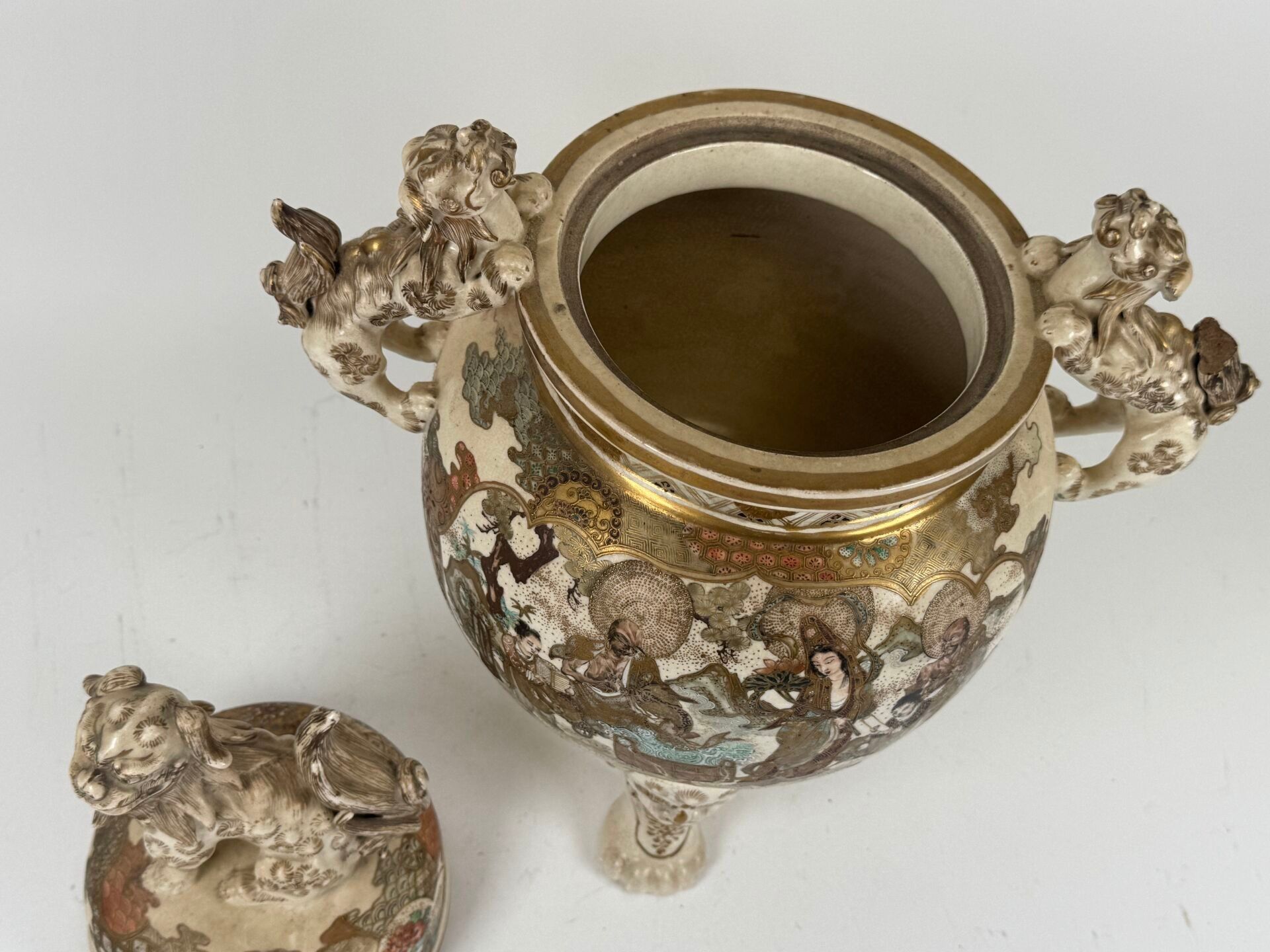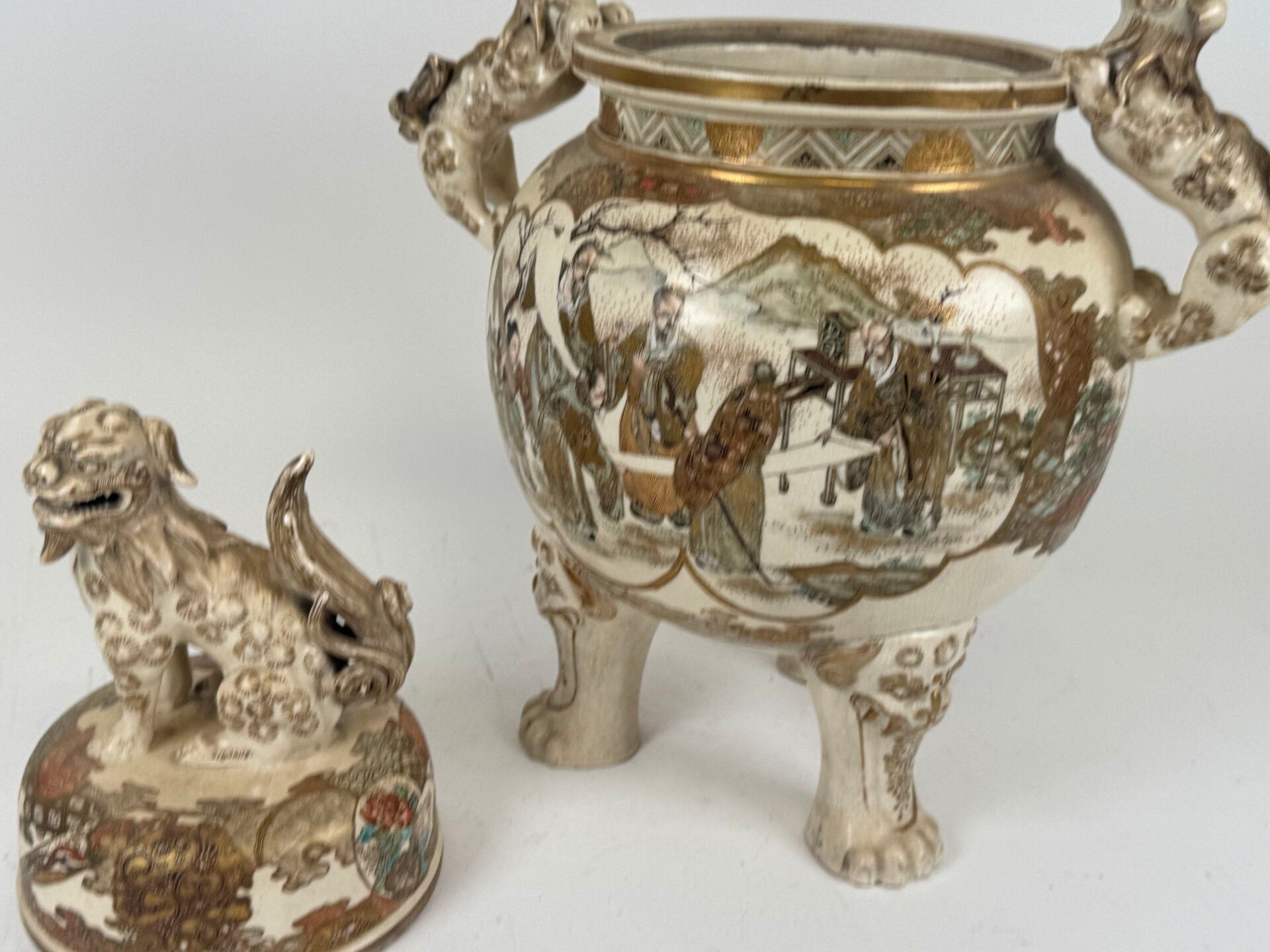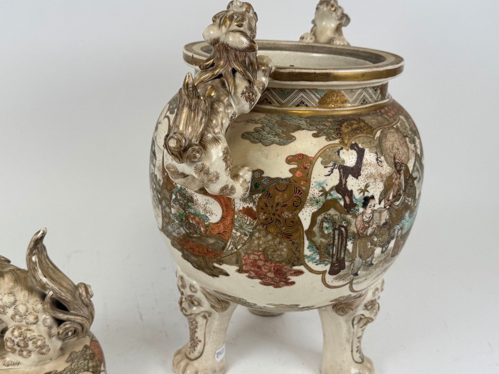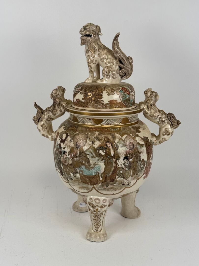 Glazed earthenware tripod covered pot with polychrome decoration and gold highlights of animated scenes. The handles and fretel depict Fö dogs.