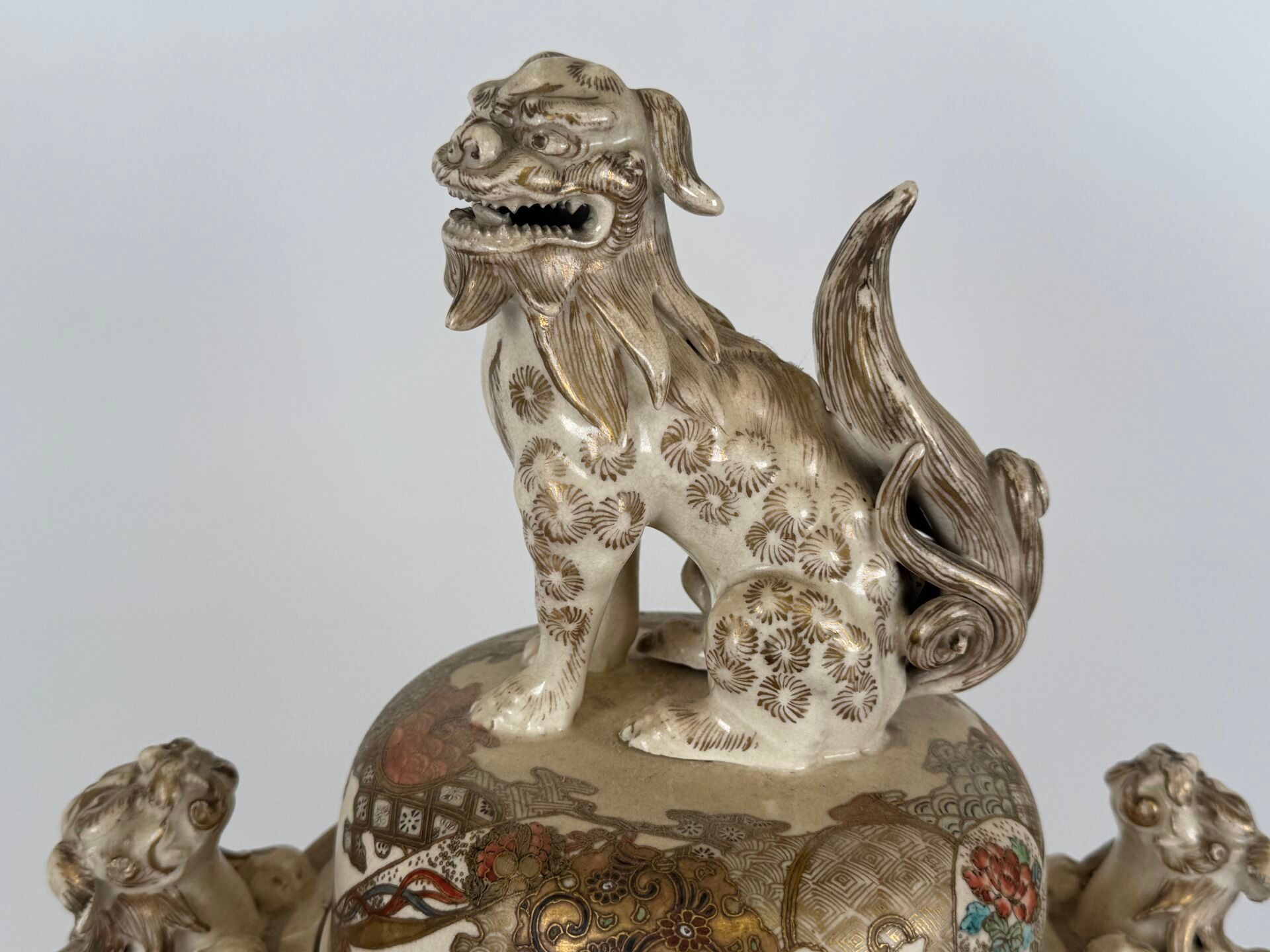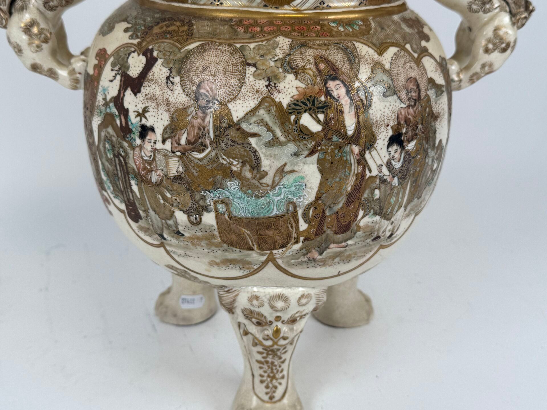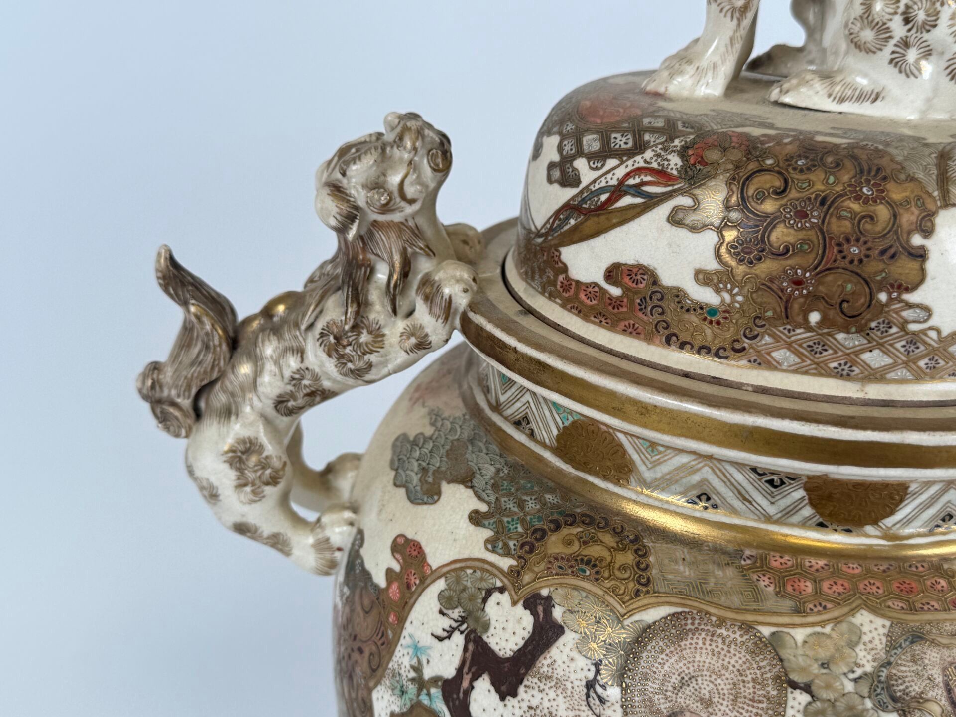 Glazed earthenware tripod covered pot with polychrome decoration and gold highlights of animated scenes. The handles and fretel depict Fö dogs.