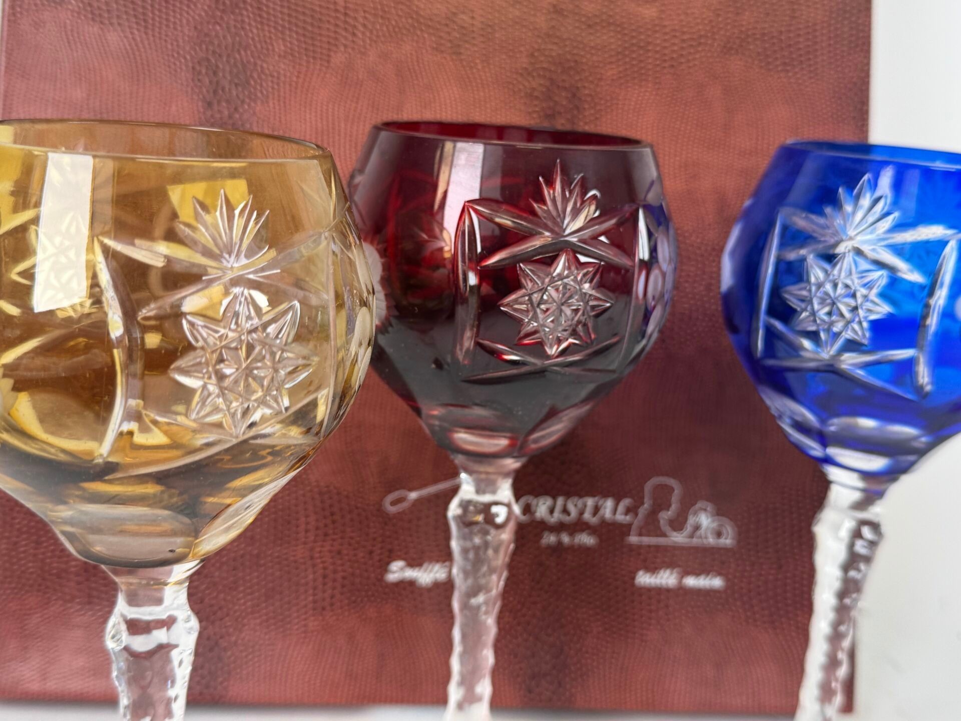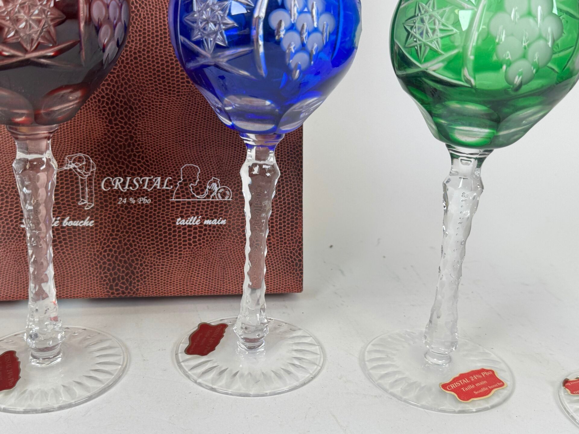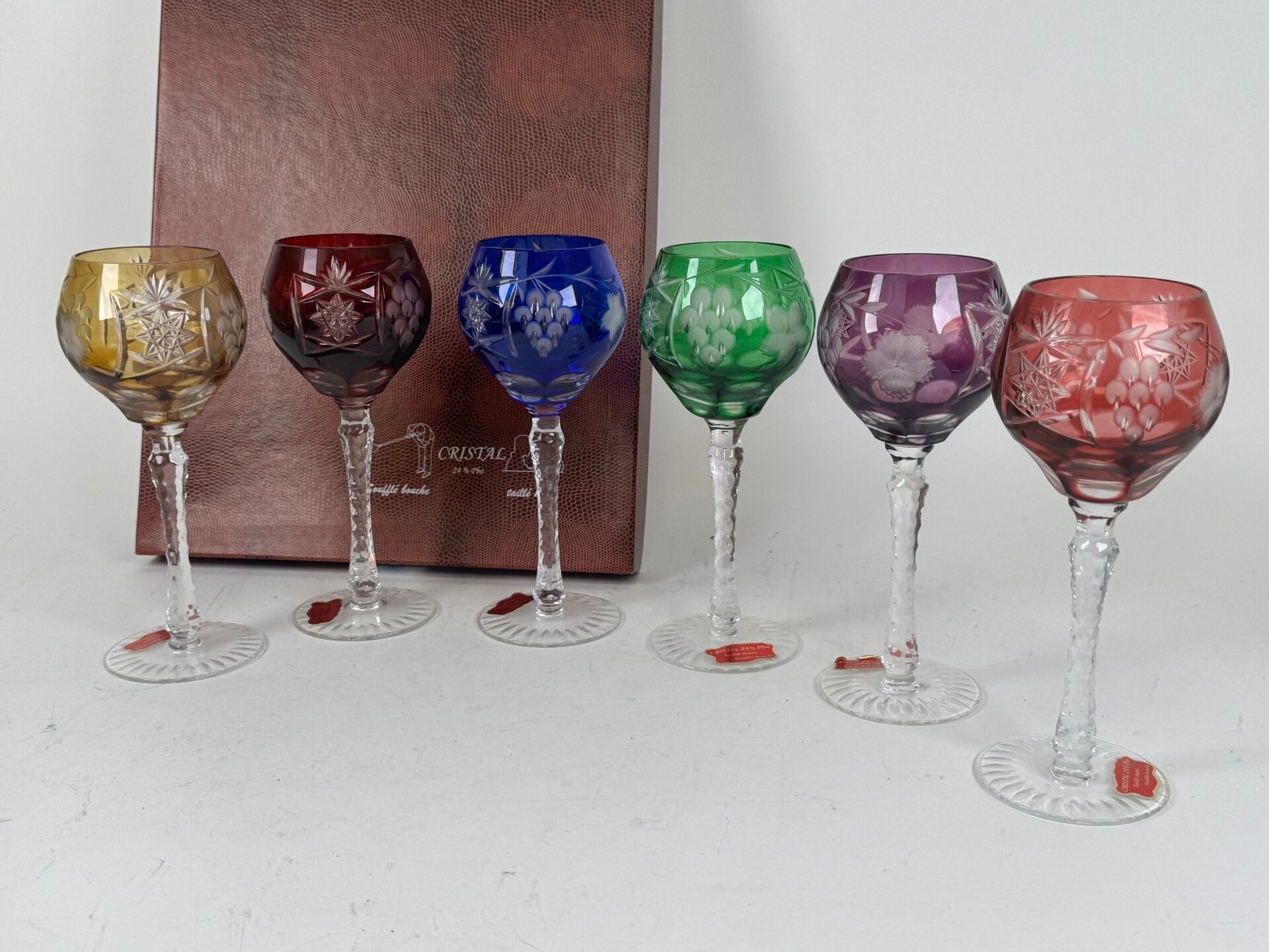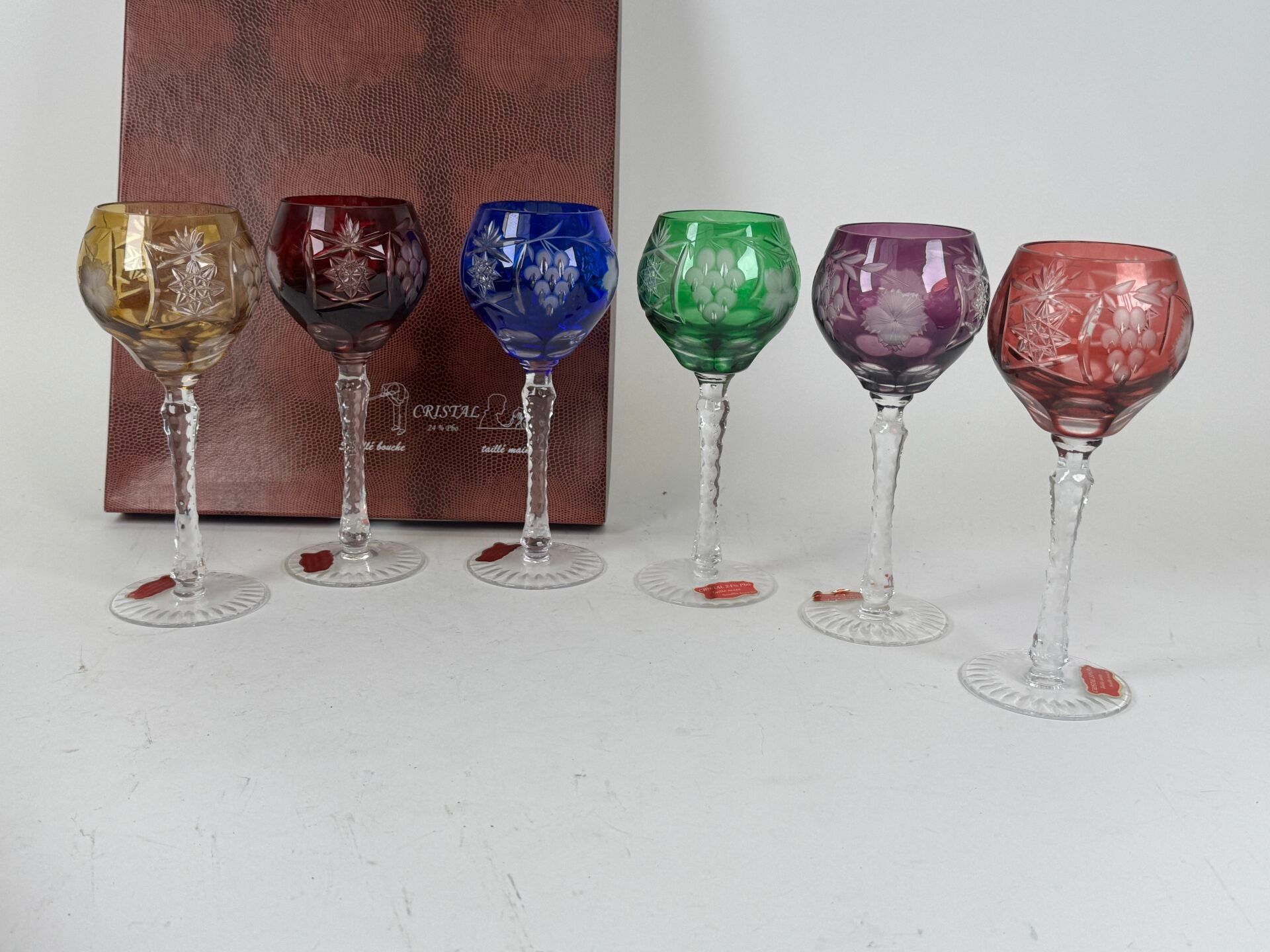 Set of 6 coloured and blown crystal glasses with engraved de…