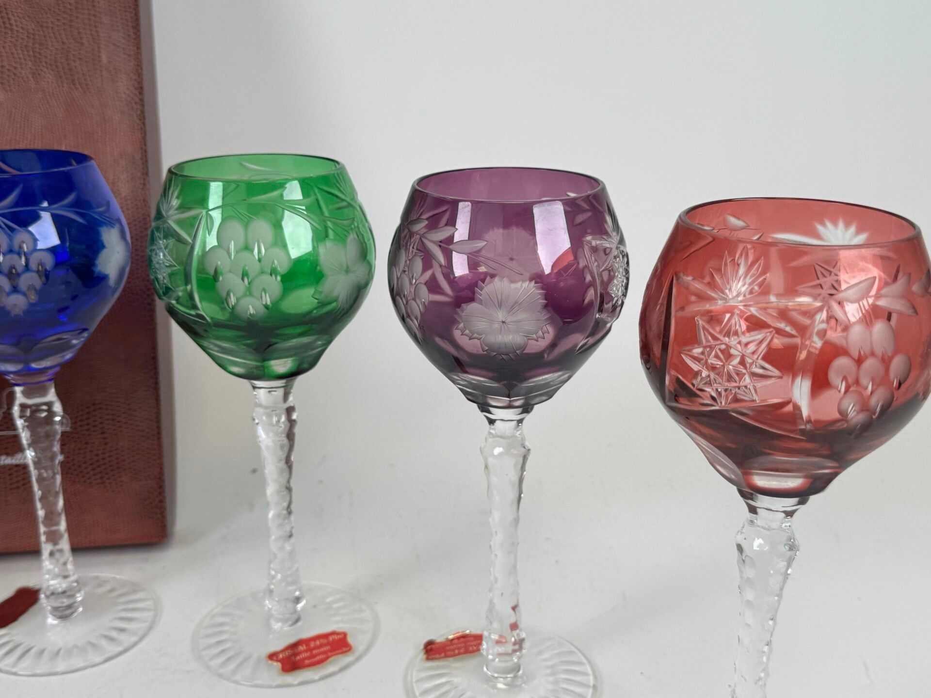 Set of 6 coloured and blown crystal glasses with engraved decoration of stylised motifs.