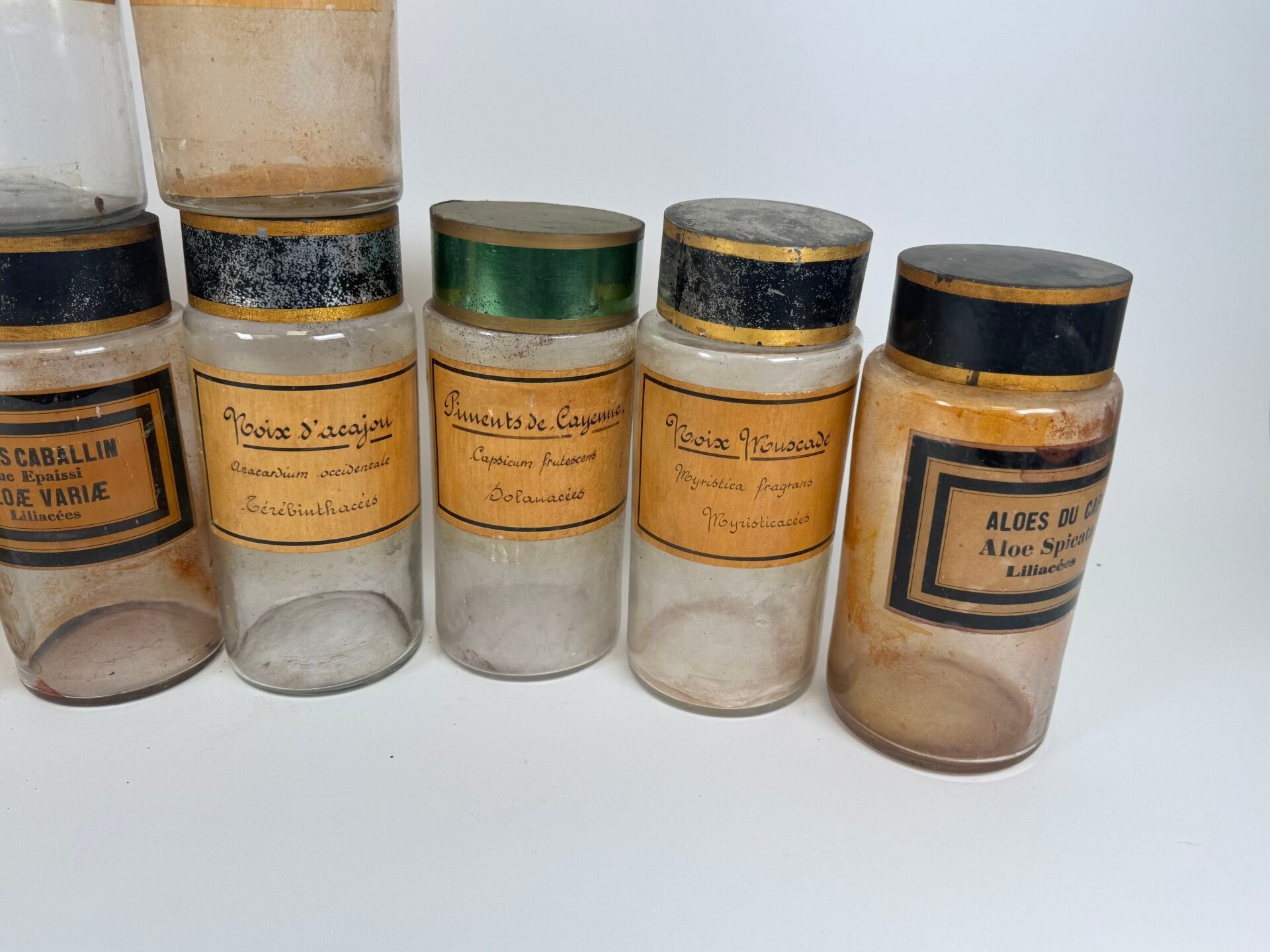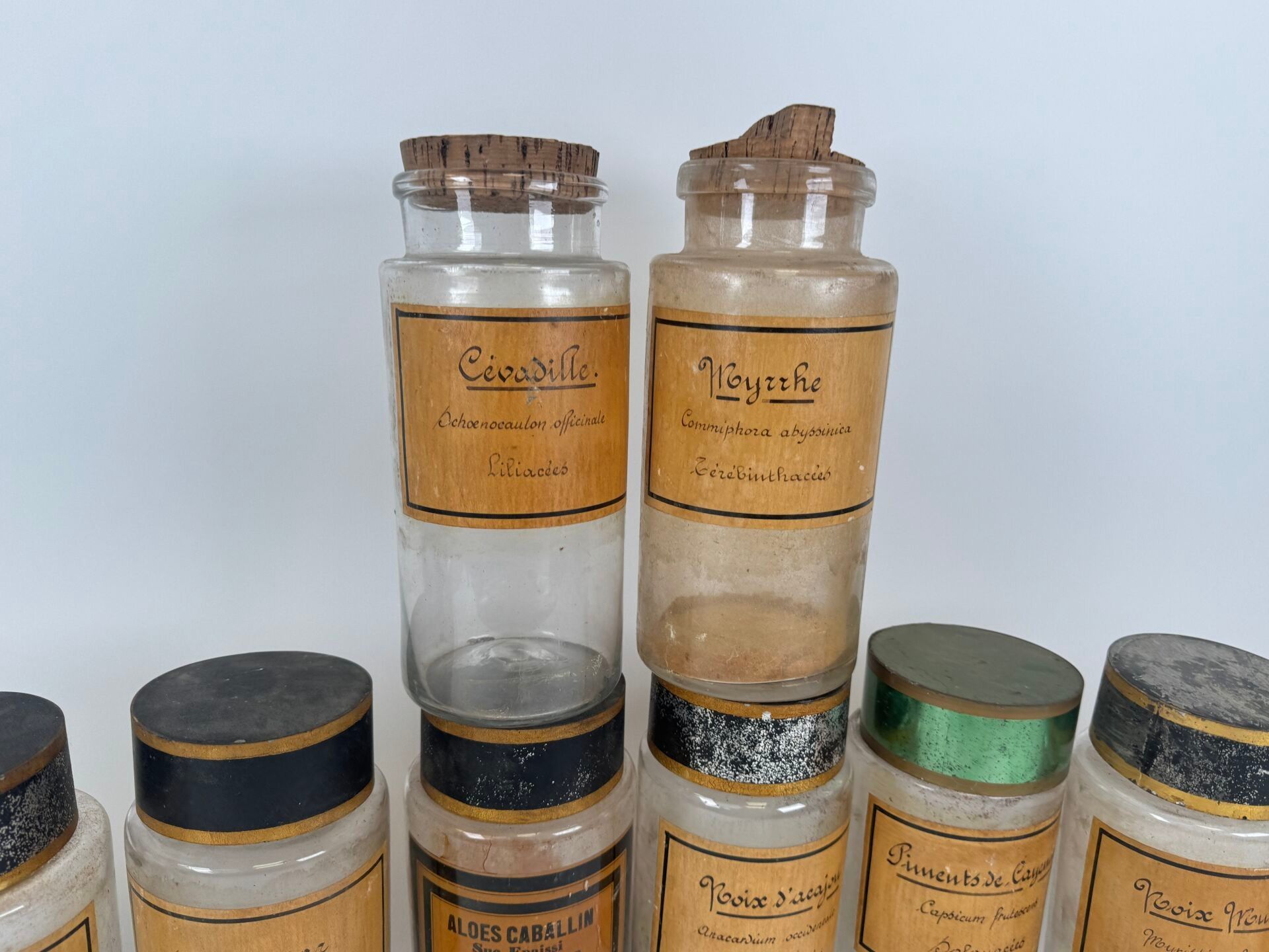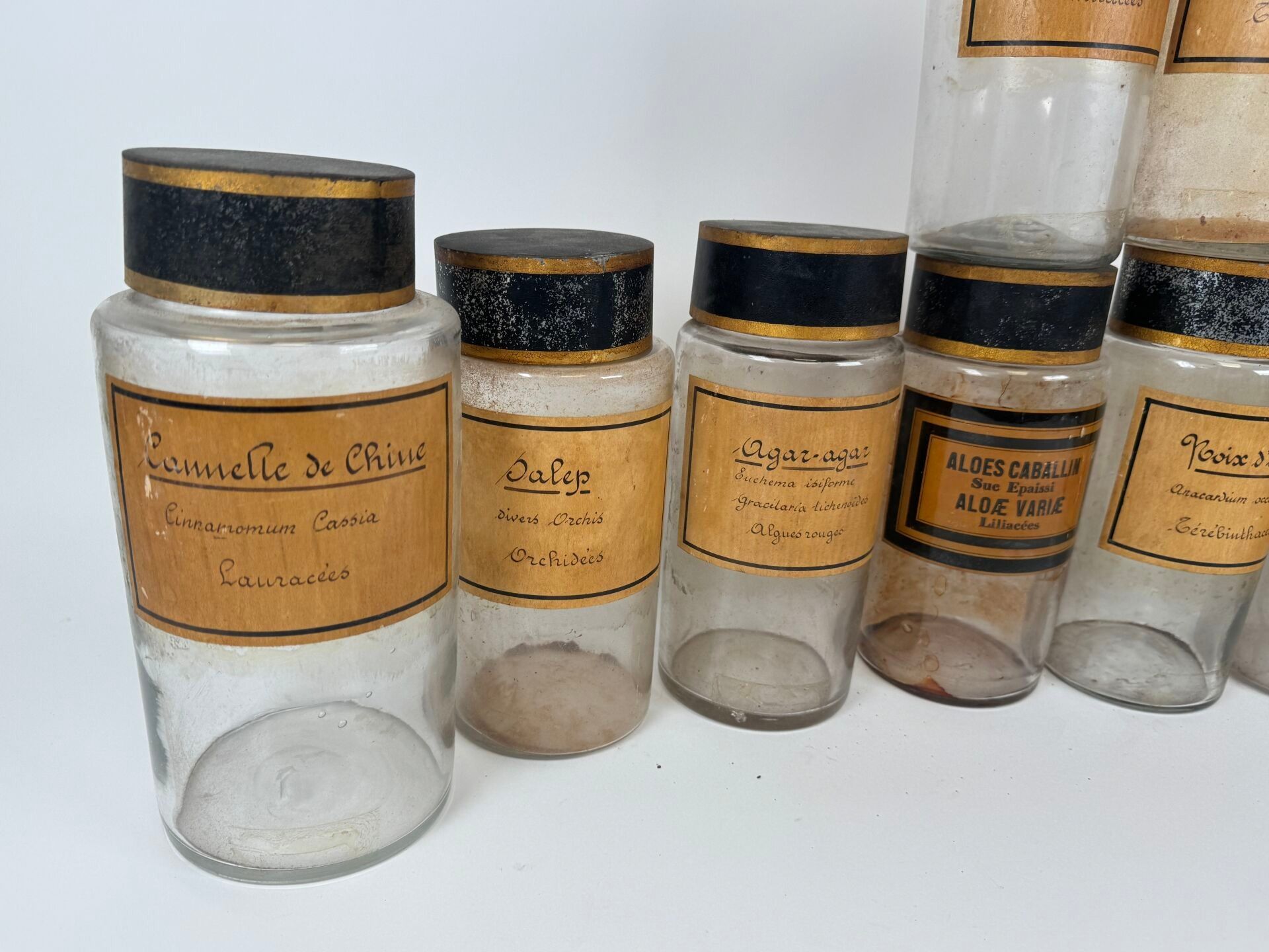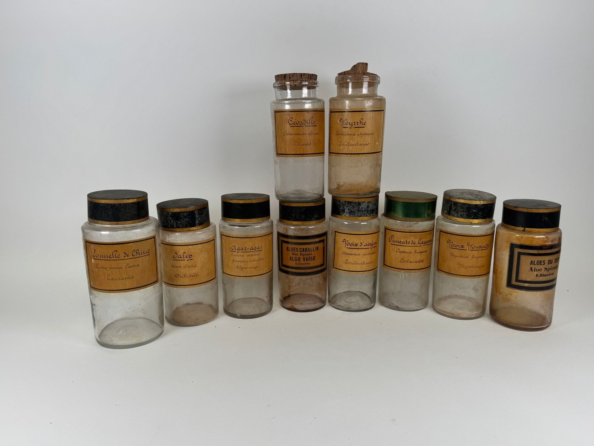 Collection of 10 glass medicine jars with sheet metal and cork stoppers.