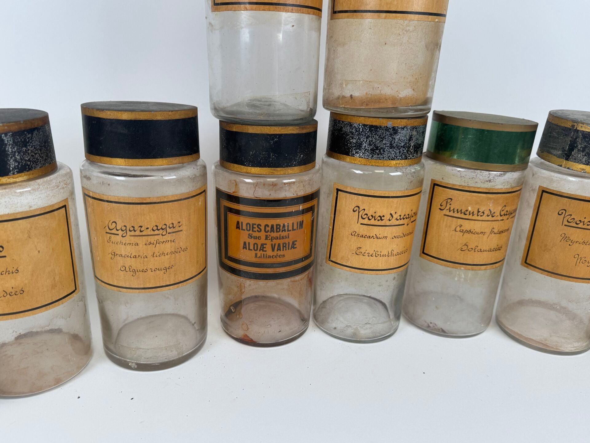 Collection of 10 glass medicine jars with sheet metal and co…