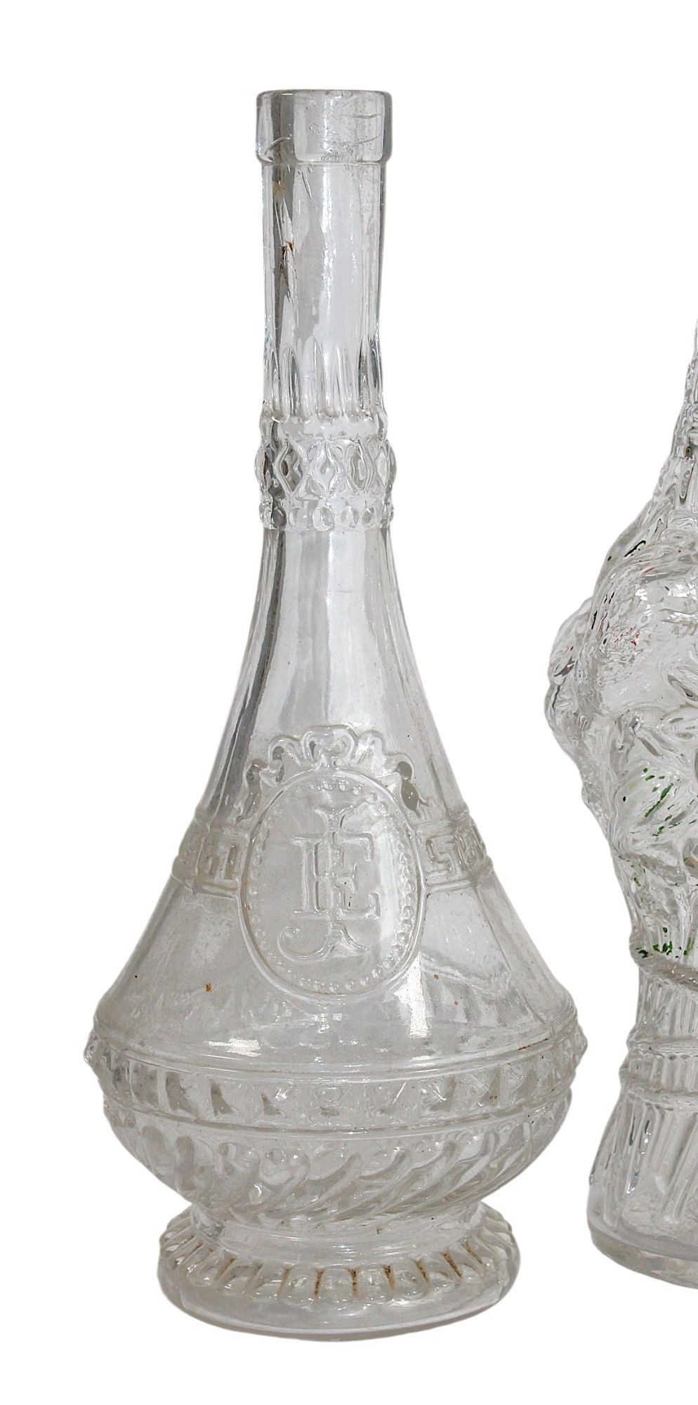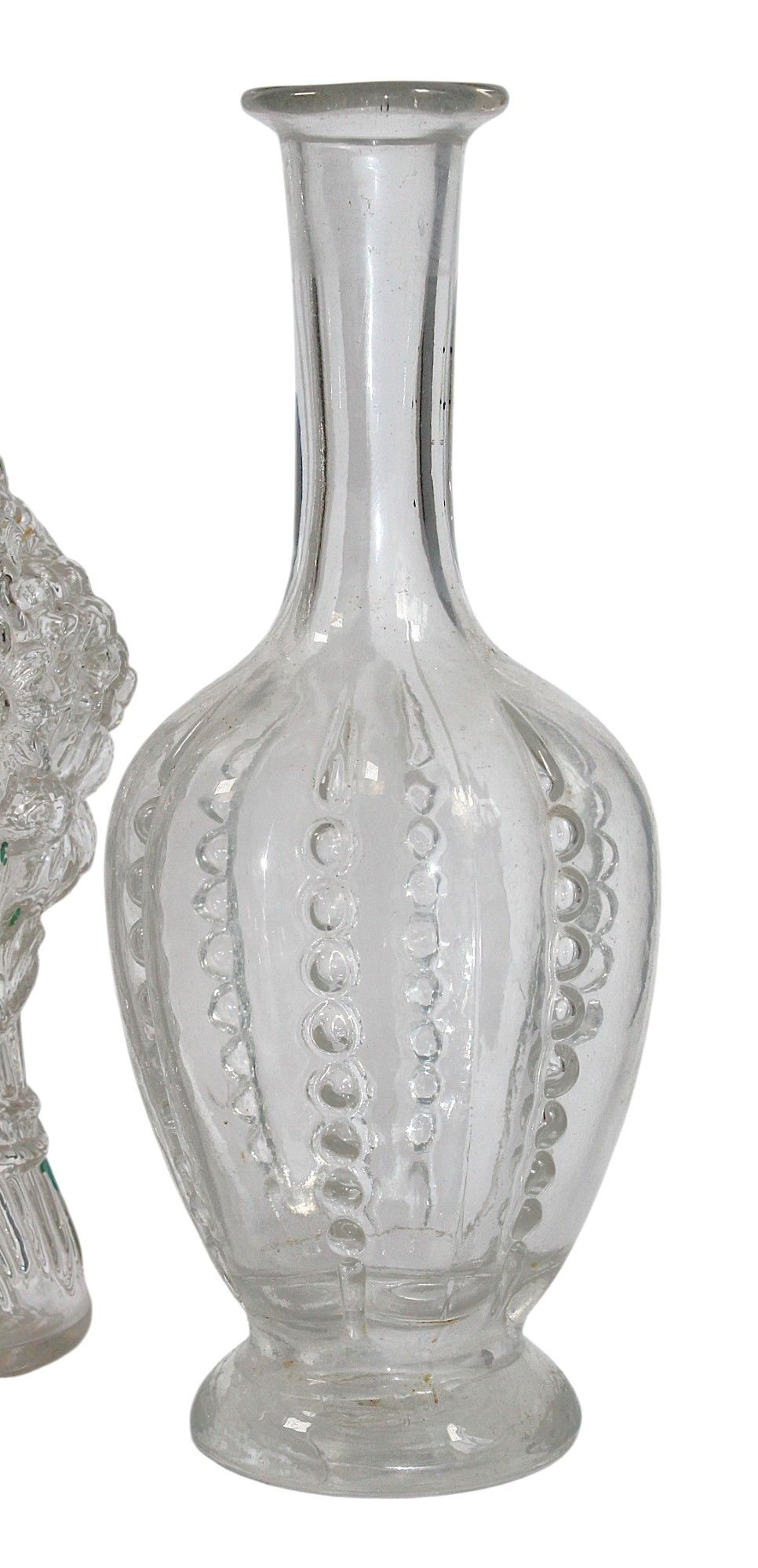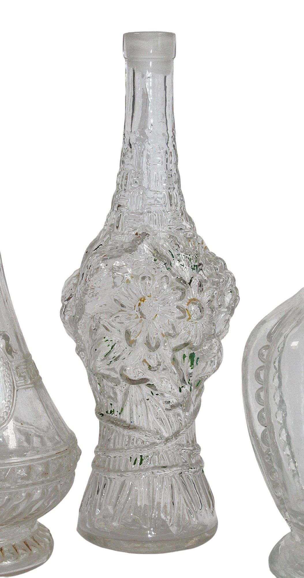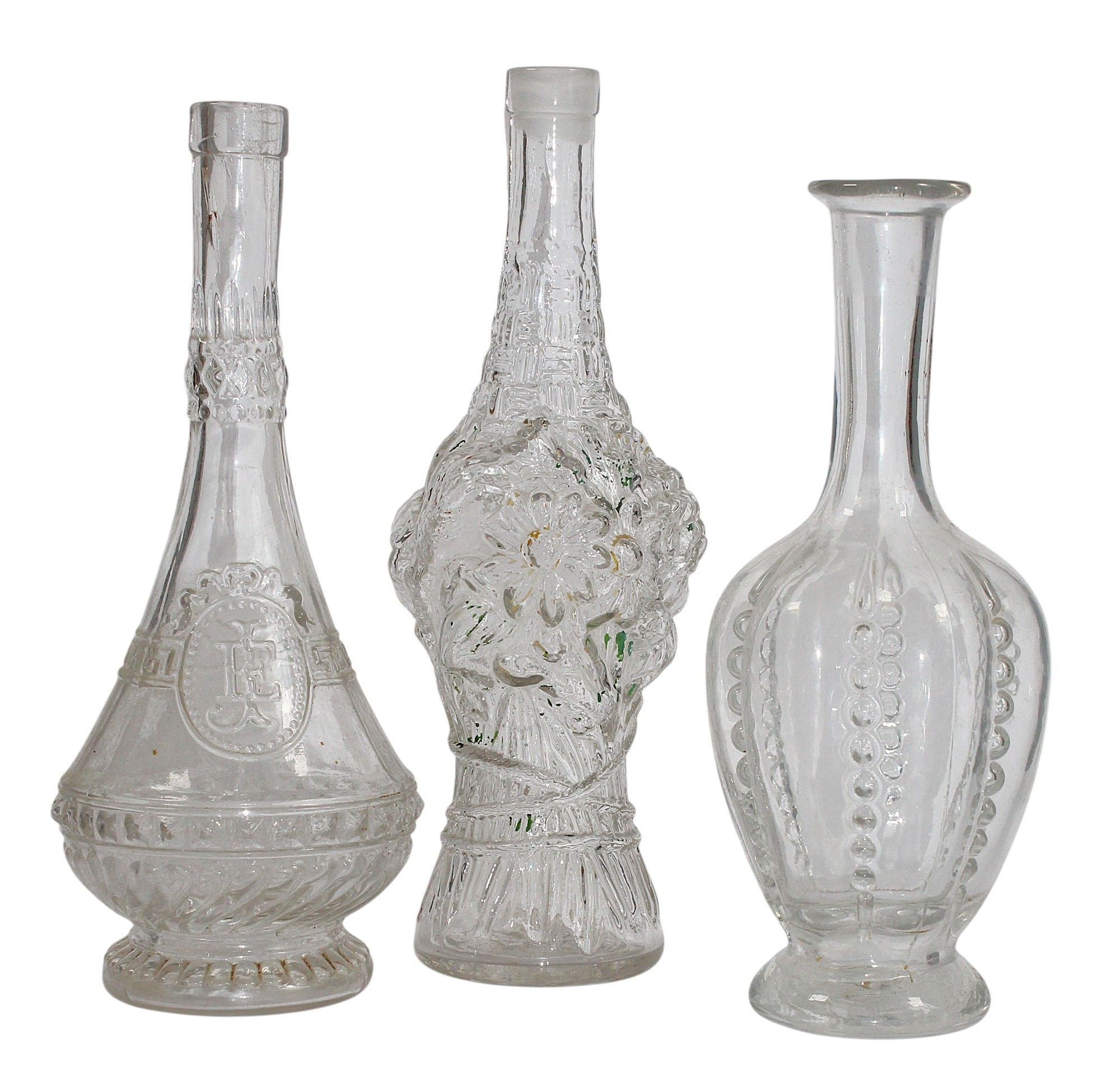 LEGRAS, glassworks of Saint Denis, late 19th century, early 20th century, attributed to - Three blown glass BOTTLES, moulded in the shape of a bouquet of flowers and miscellaneous, heights: 27 and 24 cm. Without stoppers.