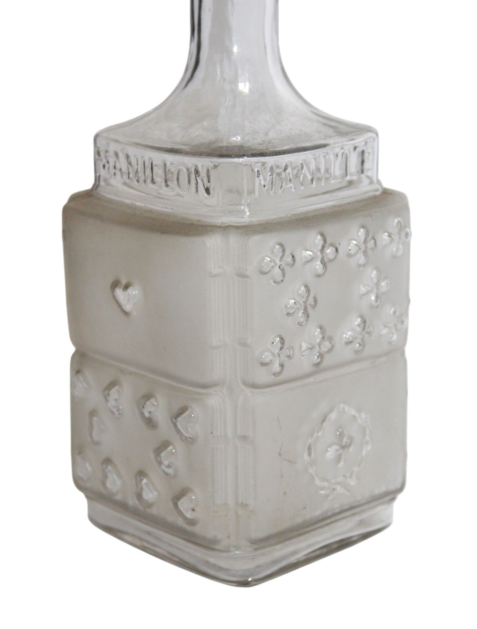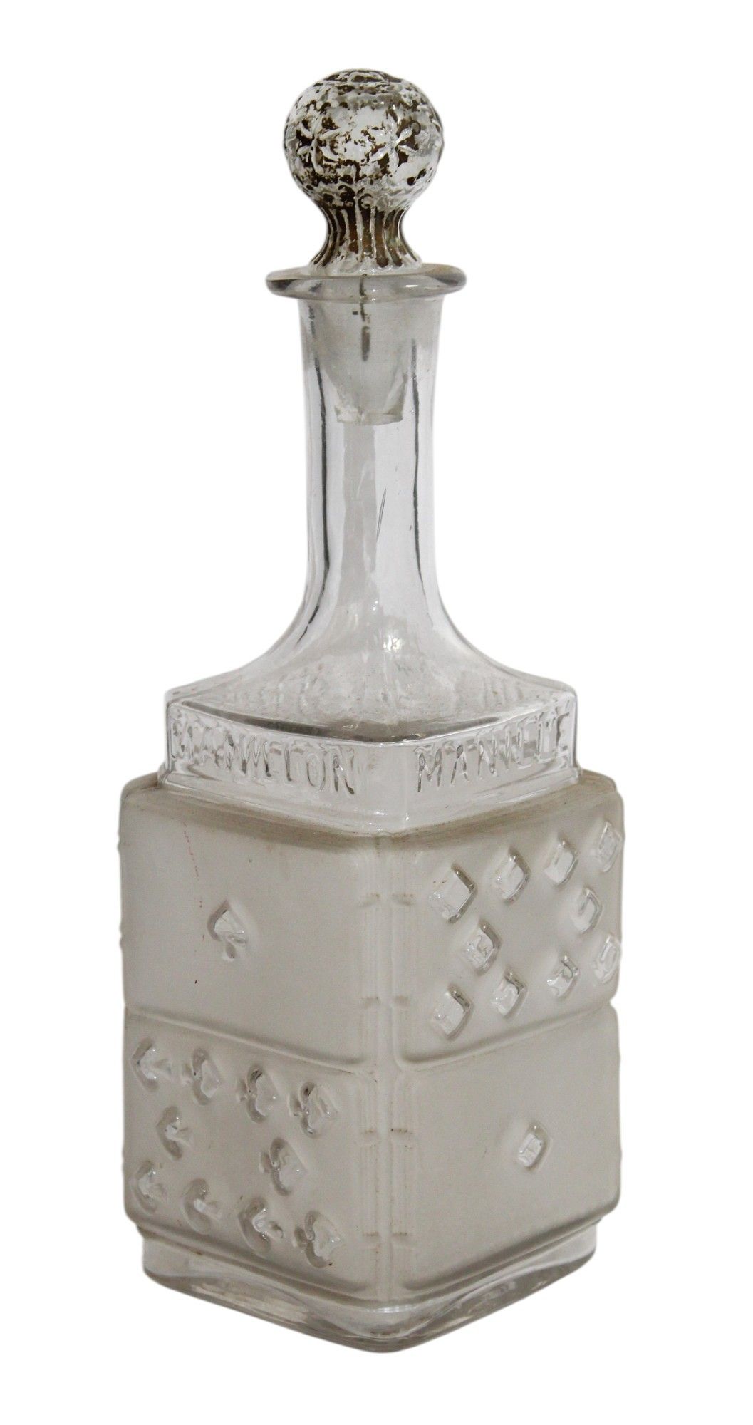 LEGRAS, Saint Denis glassworks, late 19th century, early 20th century, attributed to - A blown, moulded and/or frosted glass BOTTLE with playing card decoration on the theme of the manilla or manillon, 24 cm high. The stopper has been removed (?).