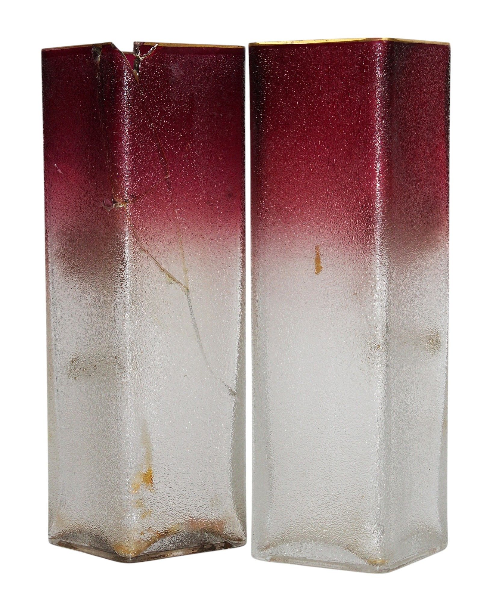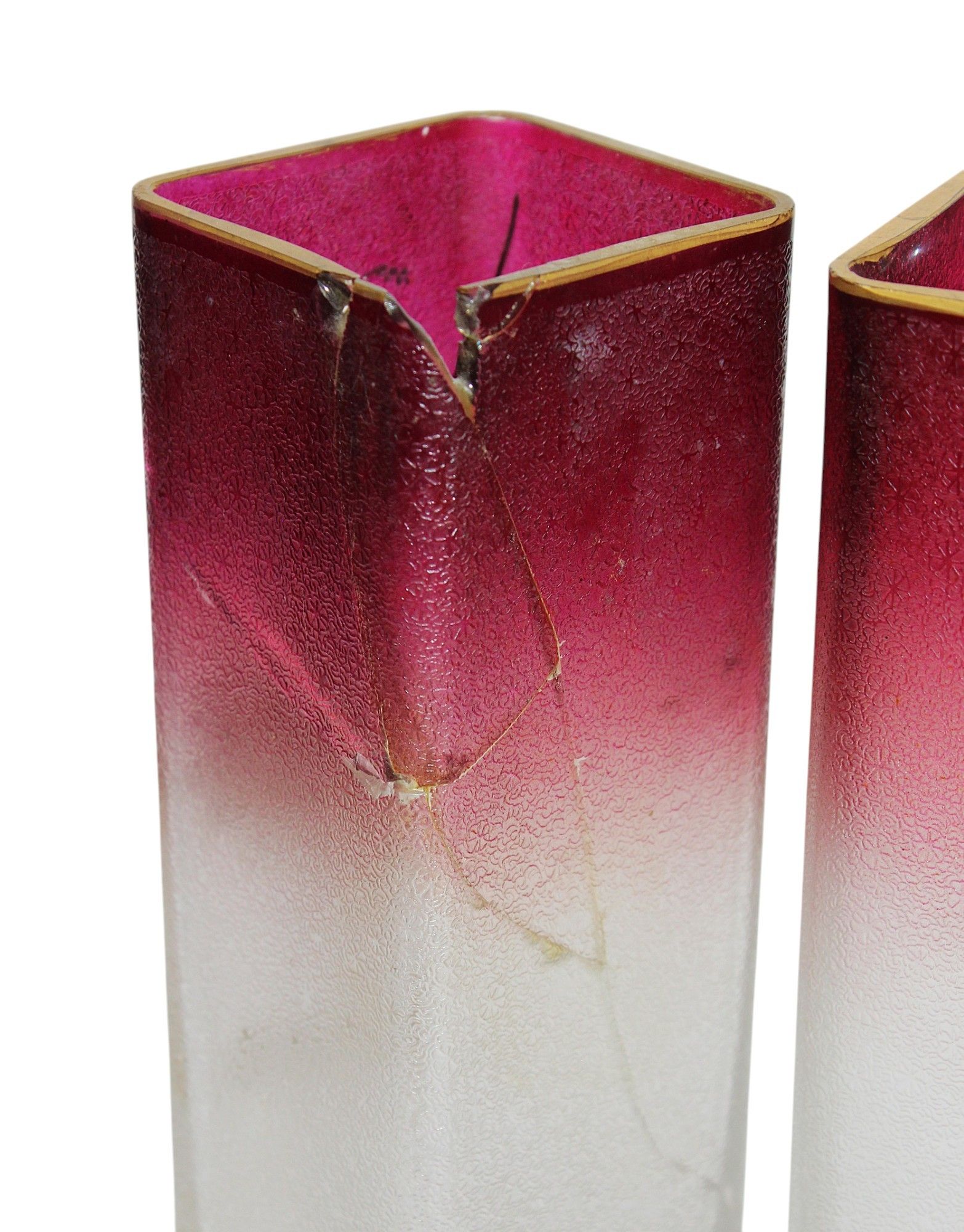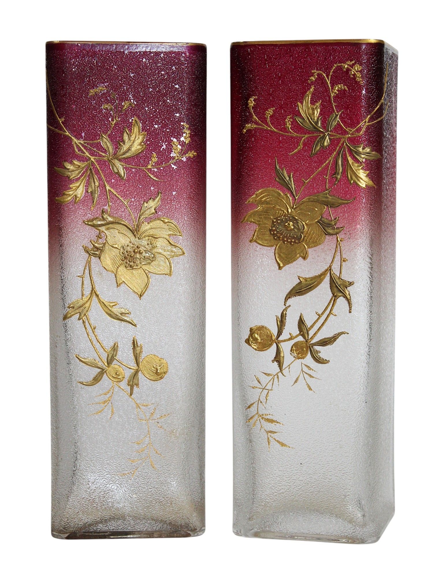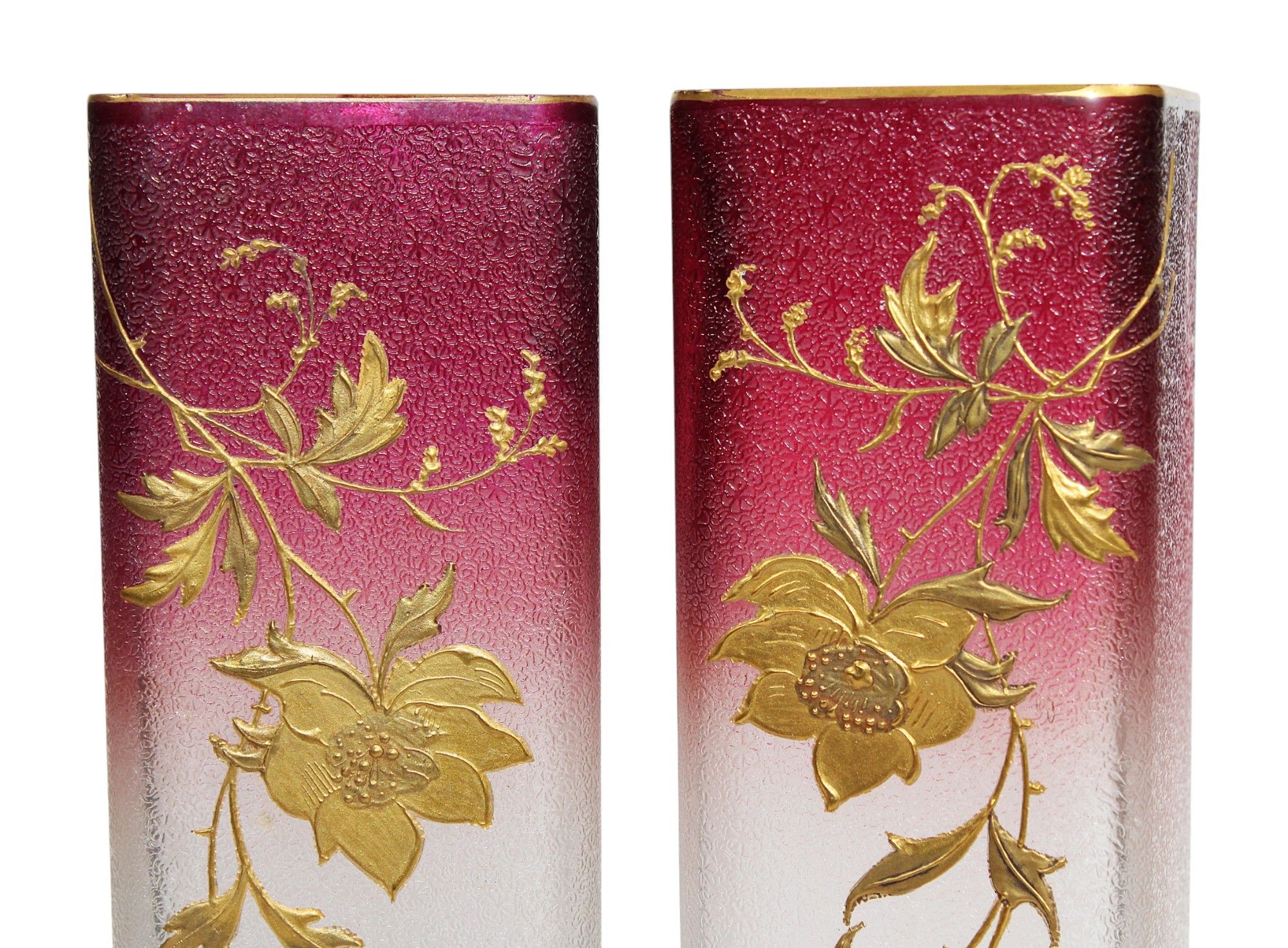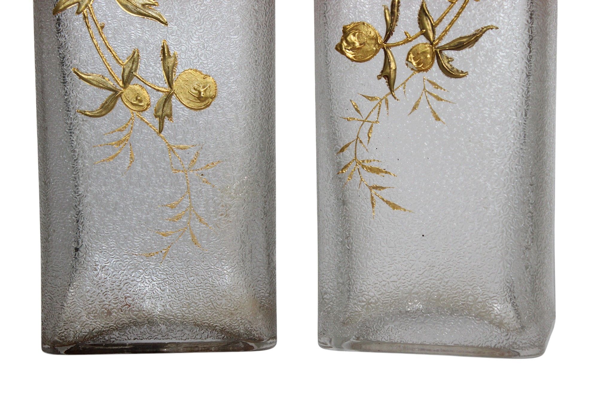 LEGRAS, verrerie de Saint Denis, attributed to - Pair of square section VASES in frosted and partially mauve tinted glass with gold floral decoration, circa 1900, height: 20 cm. One vase damaged.