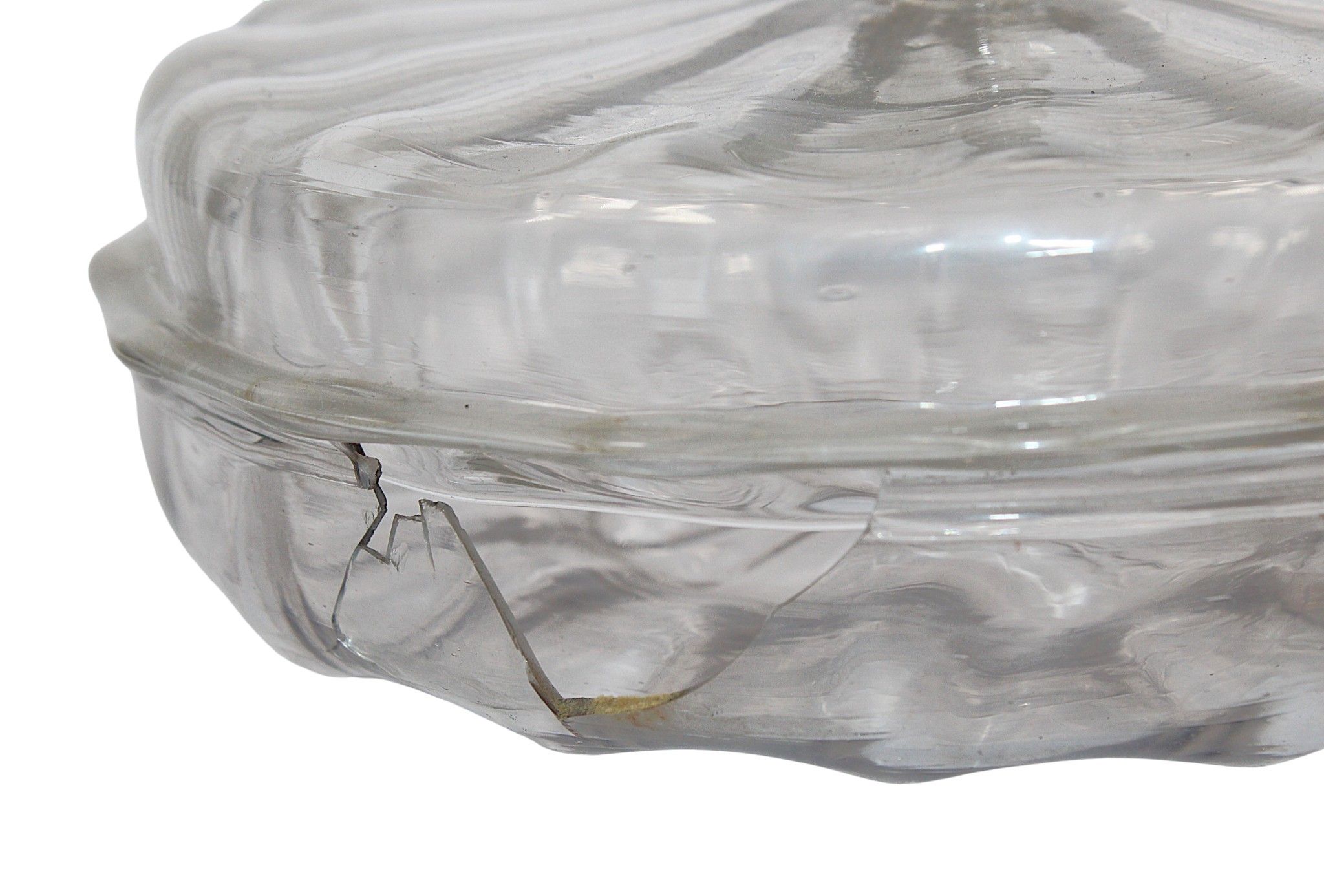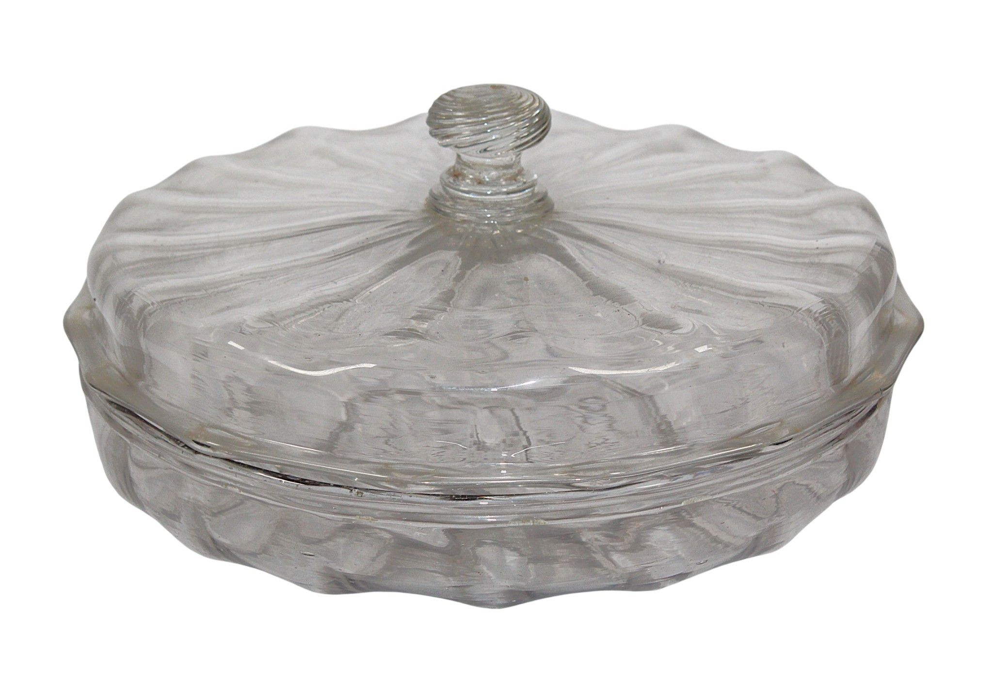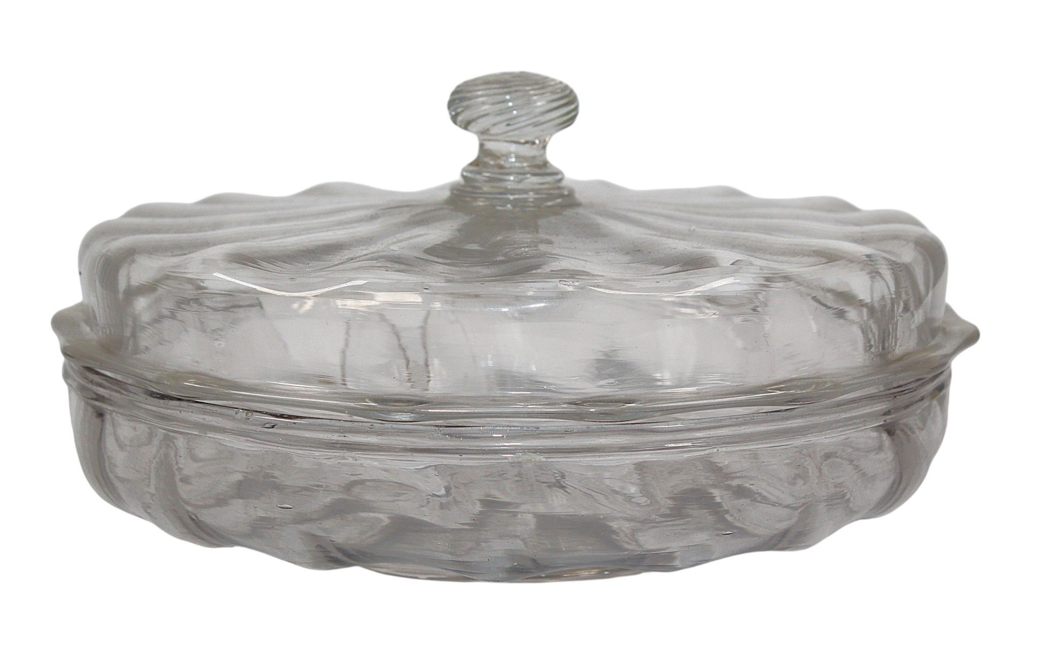 A rare ribbed blown glass DRAGEOIR or covered bowl on a heel, with a spiral grip on the lid, 18th century, diameter : 21 cm. Chipped and missing at the edge of the bowl.