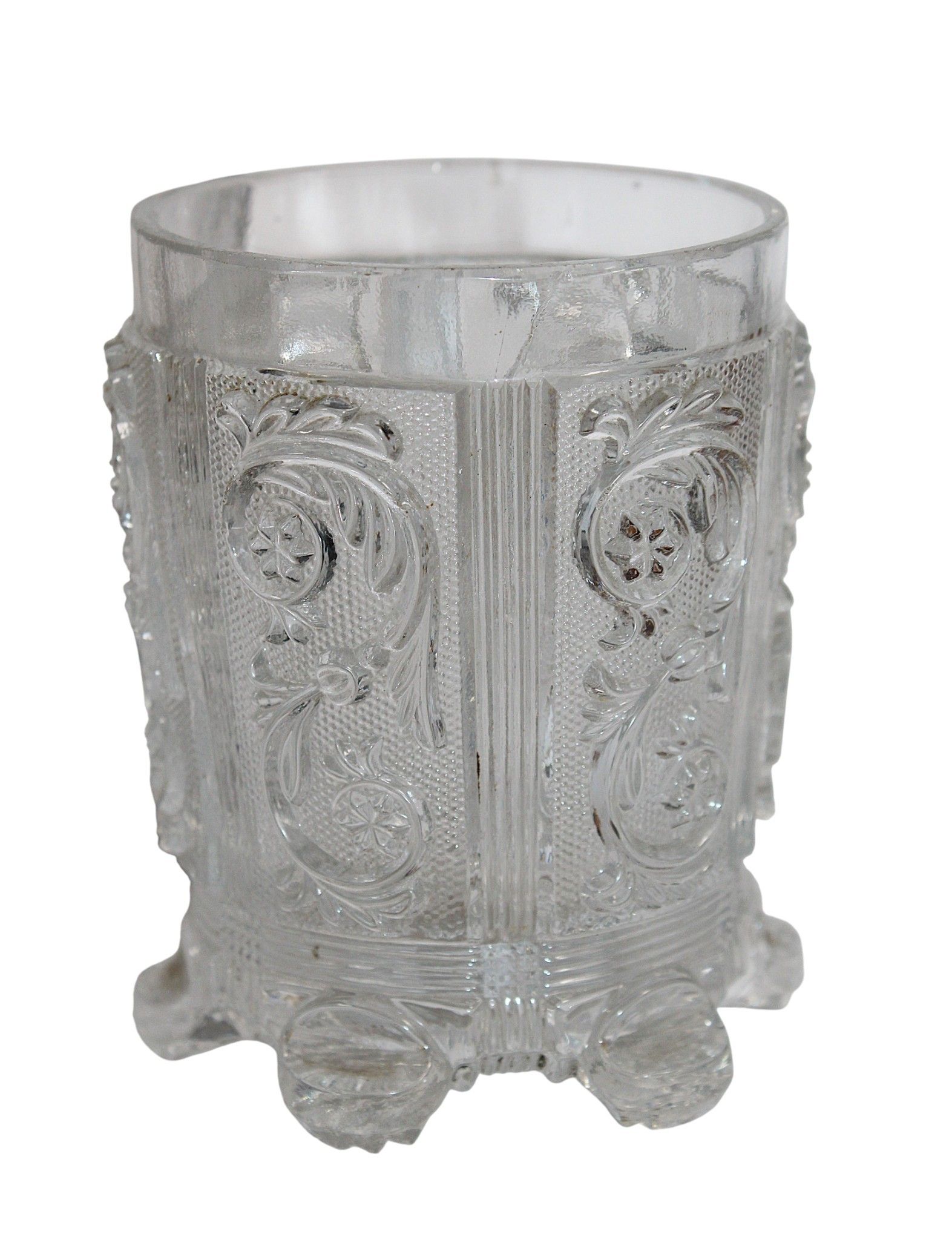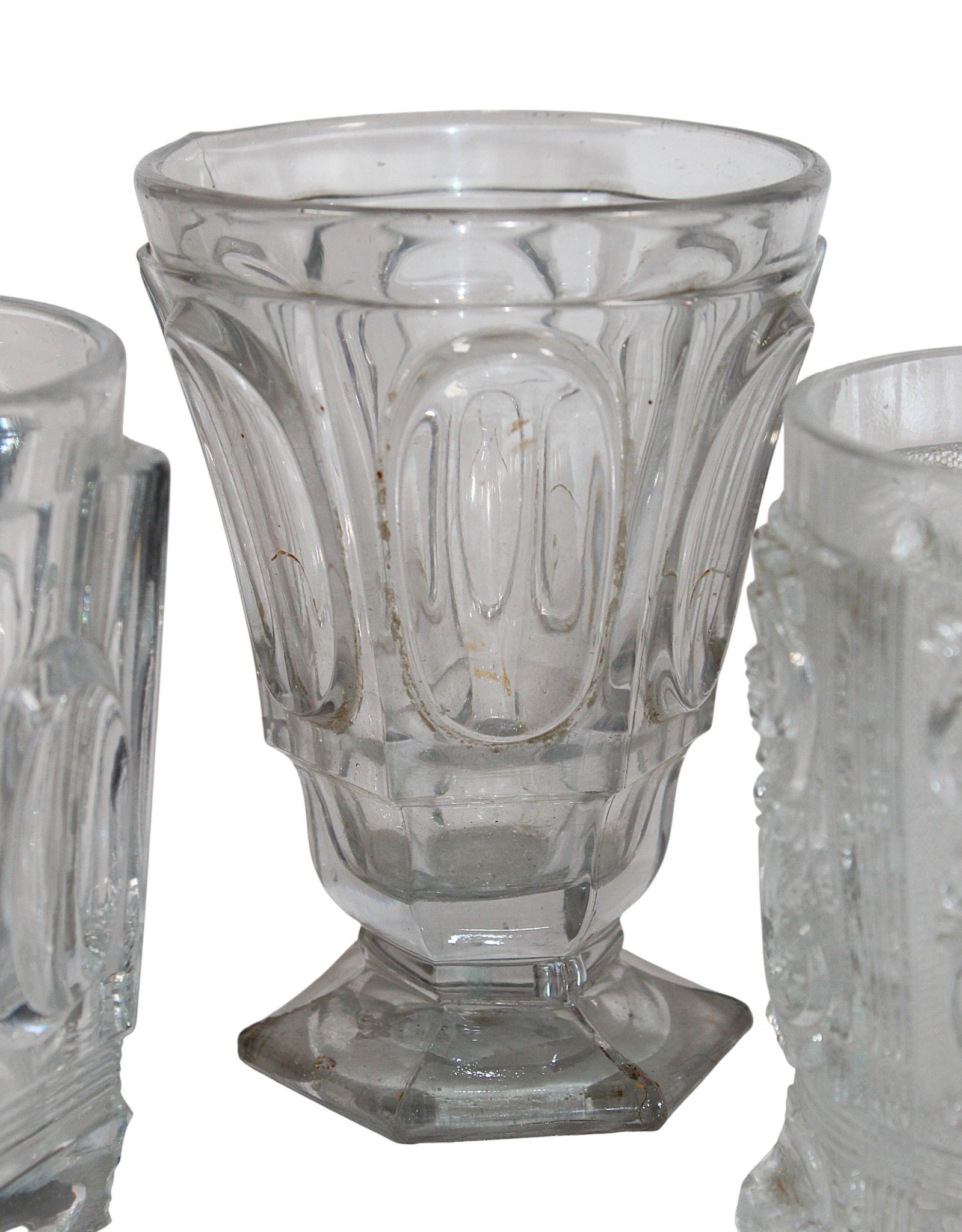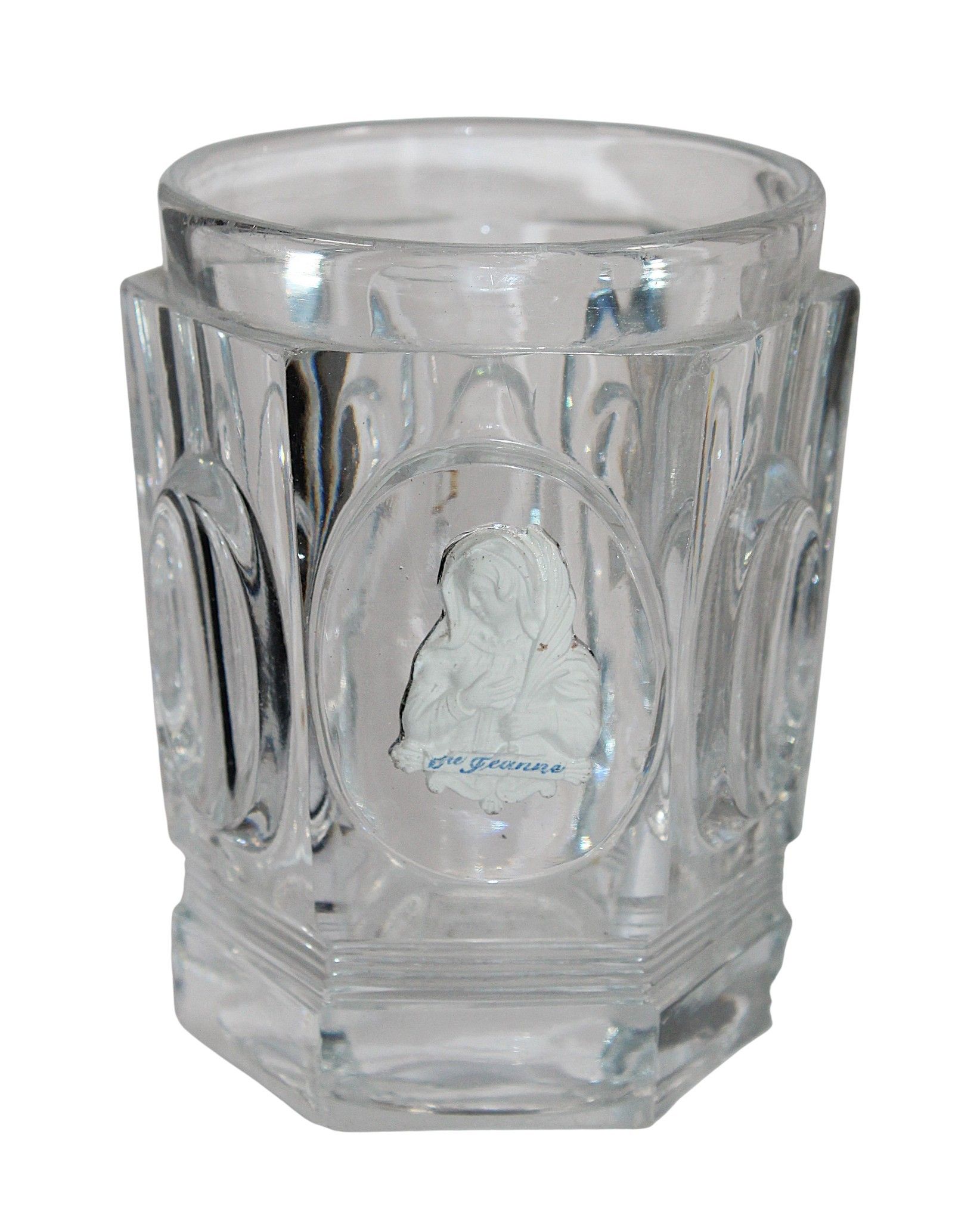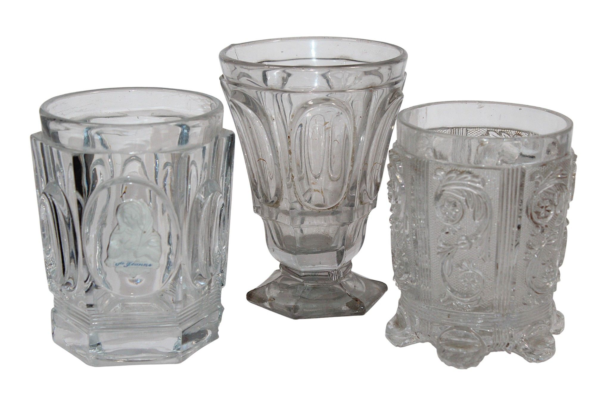 Suite of 3 crystal GOBELETS with moulded decoration of foliage scrolls or with crystallo-ceramics depicting Sainte Jeanne, mid 19th century, heights between 12 and 10 cm. Chips.