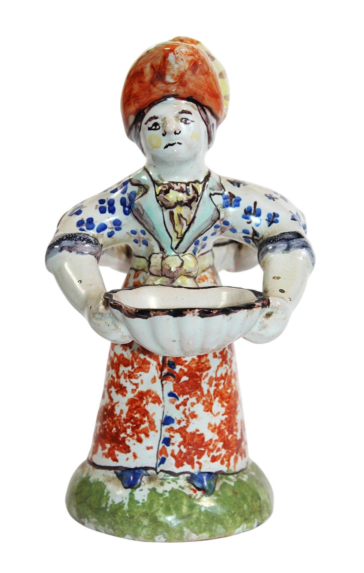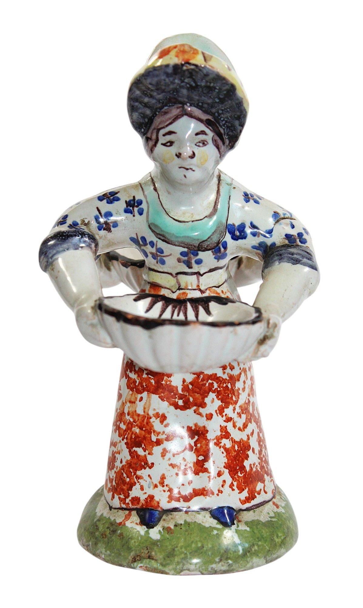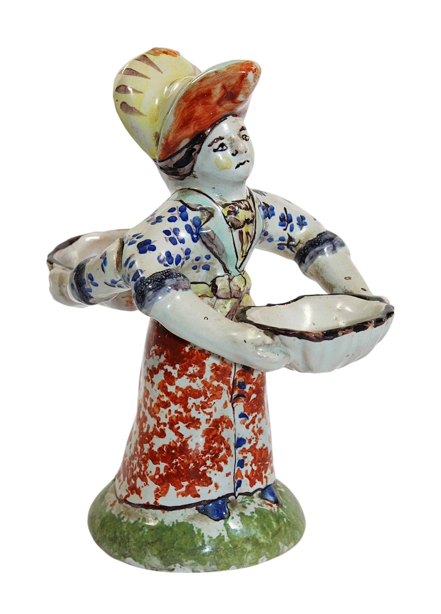 DESVRES or BOULOGNE, 19th century - A double salt cellar with a woman holding a shell, decorated with flowers and a brick sponge background, 18 cm high. Firing defect.