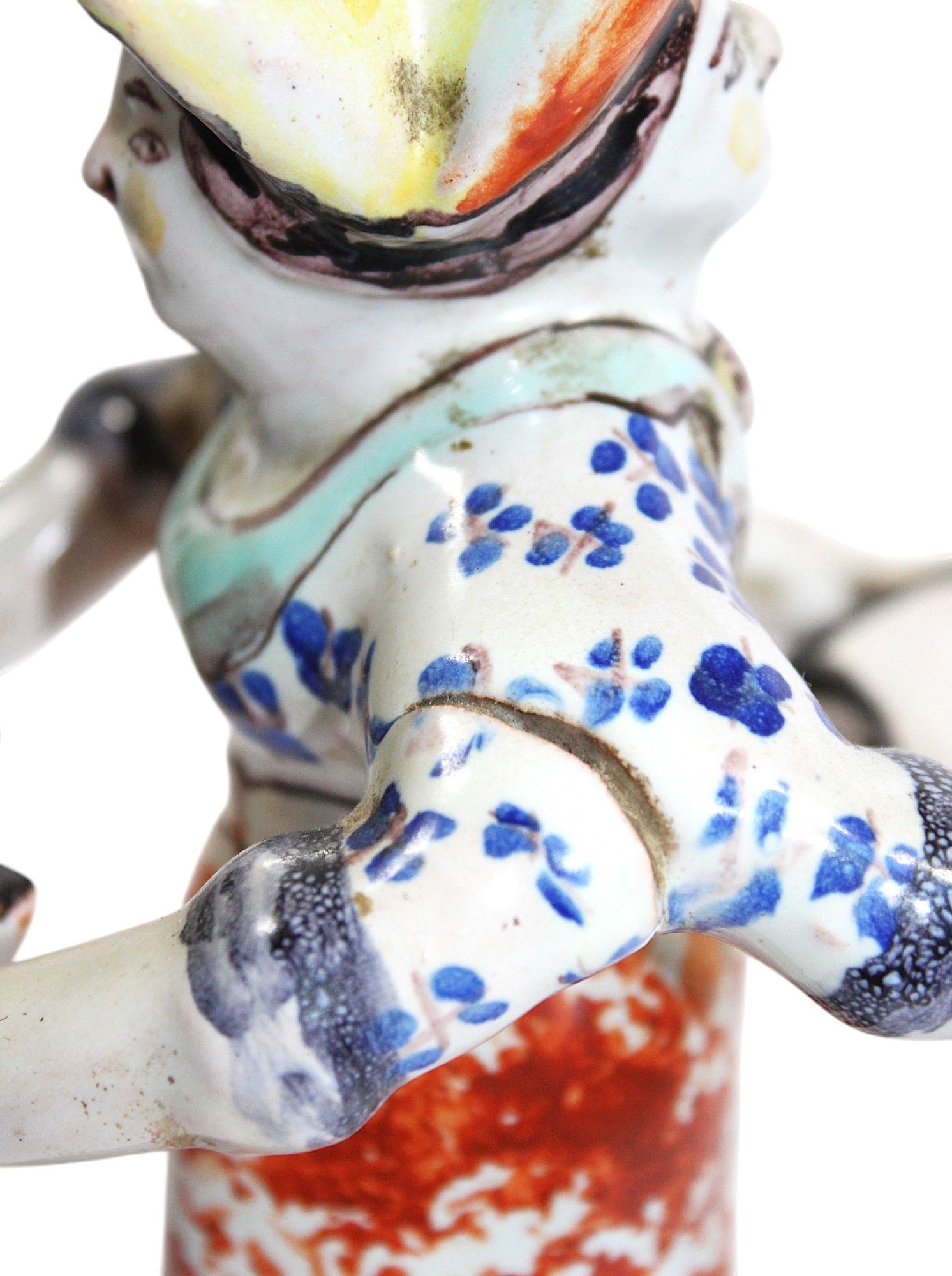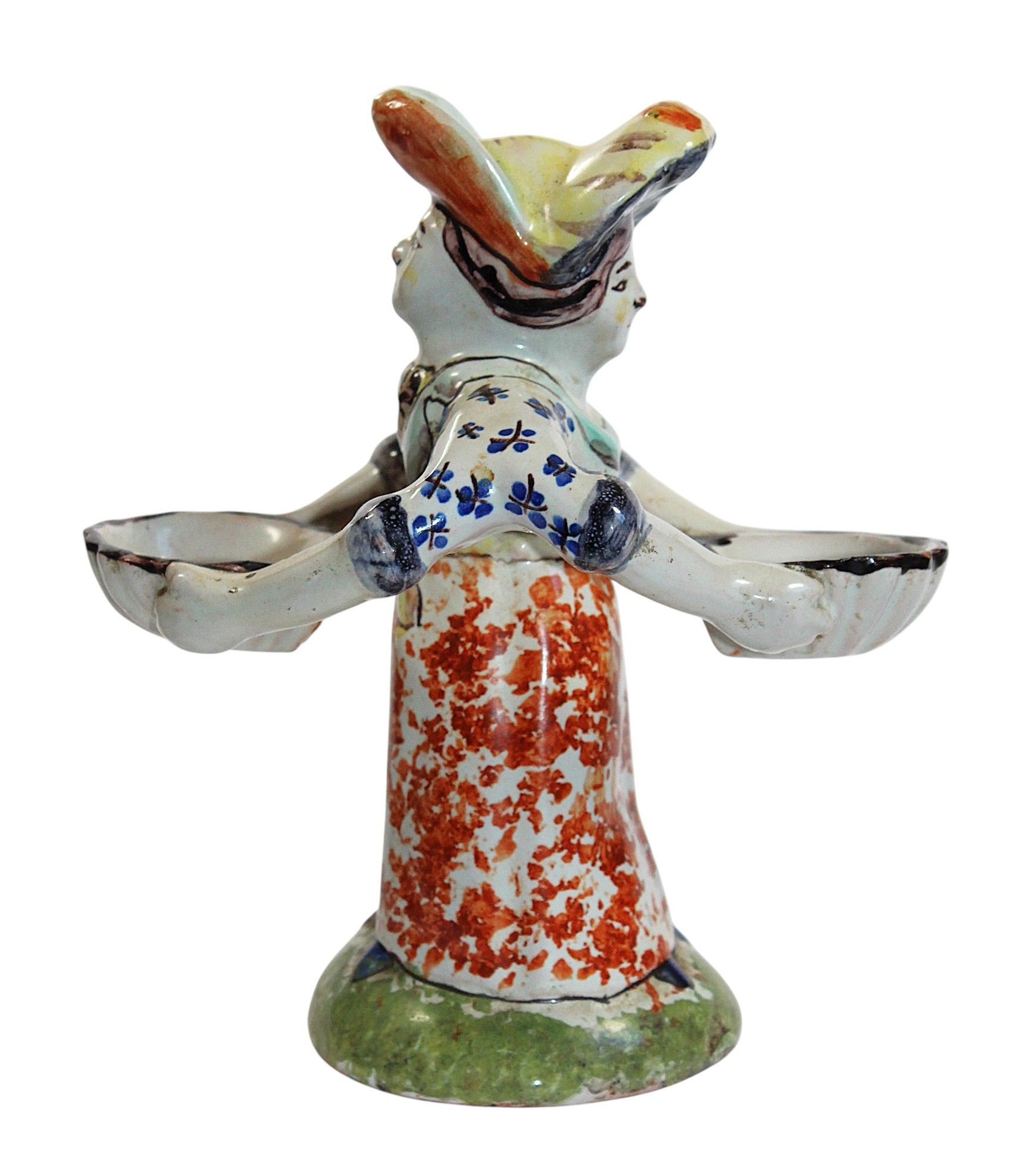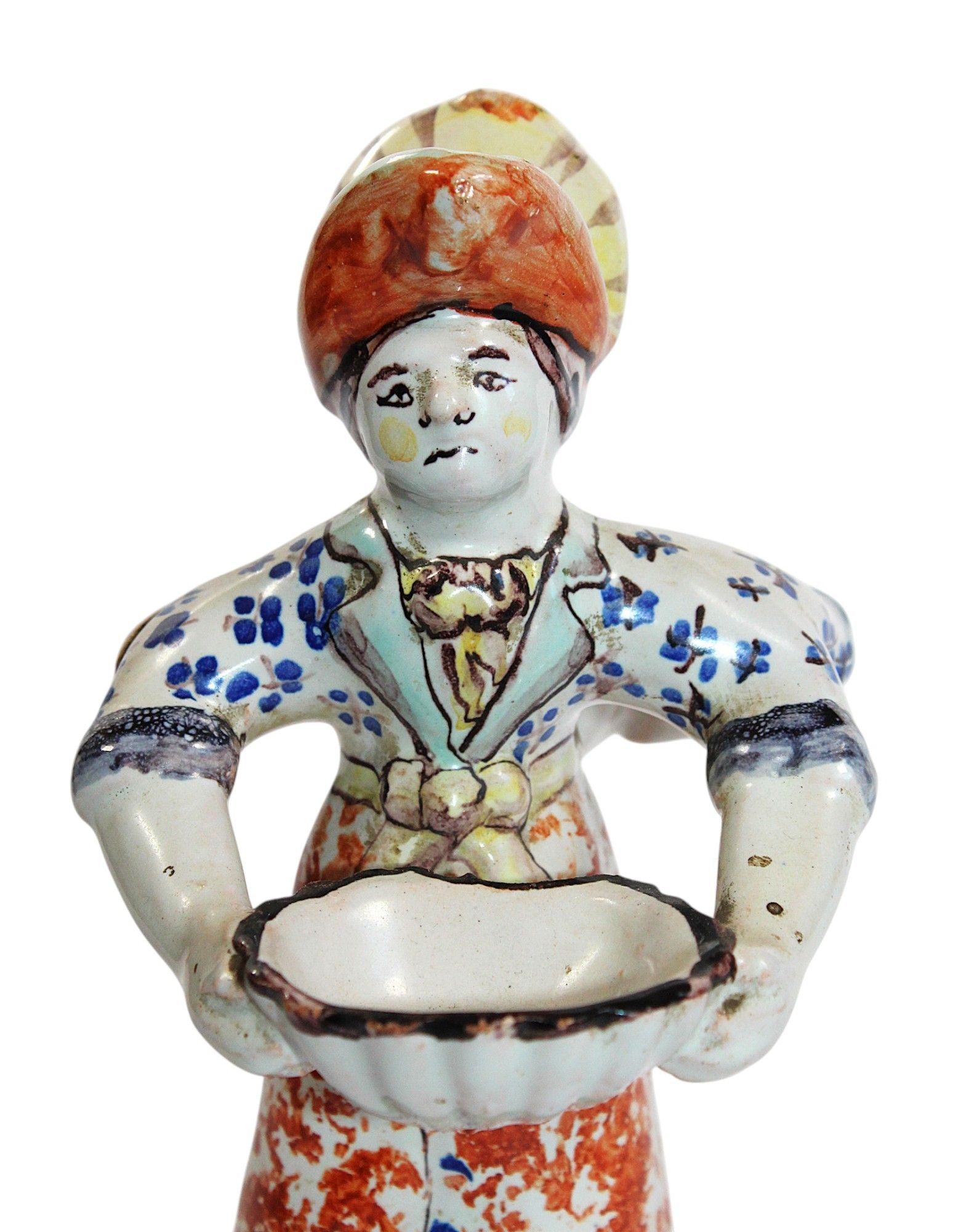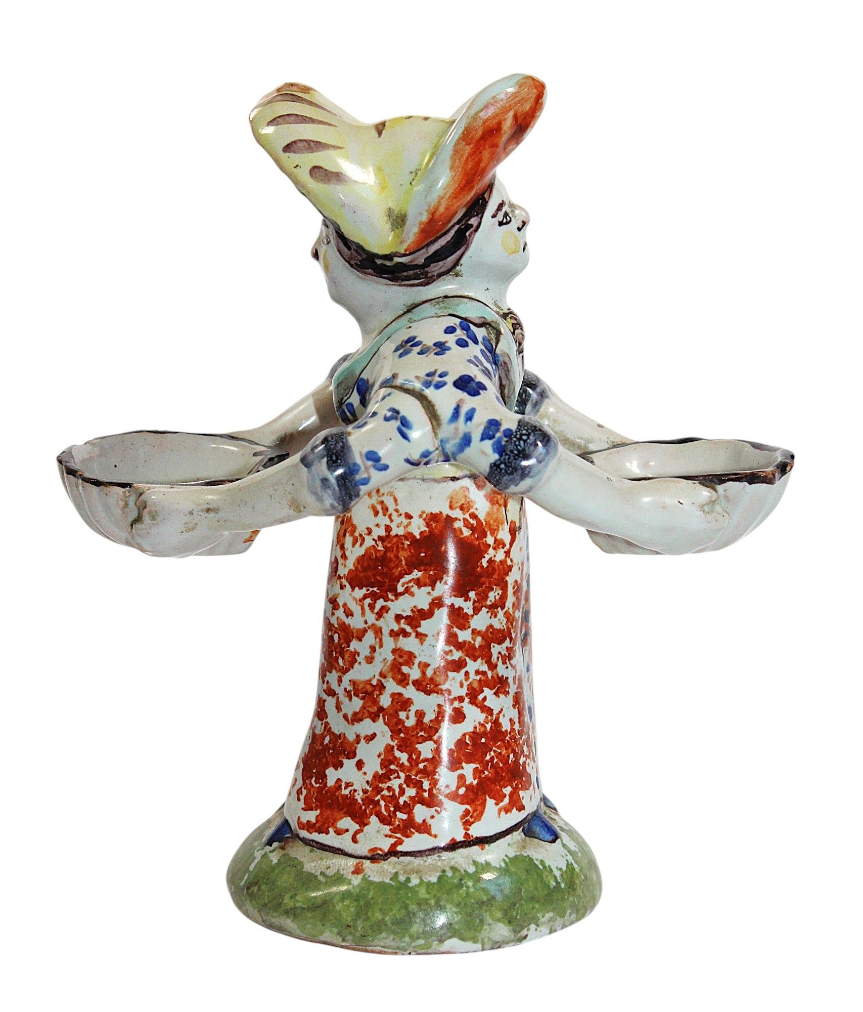DESVRES or BOULOGNE, 19th century - A double salt cellar with a woman holding a shell, decorated with flowers and a brick sponge background, 18 cm high. Firing defect.
