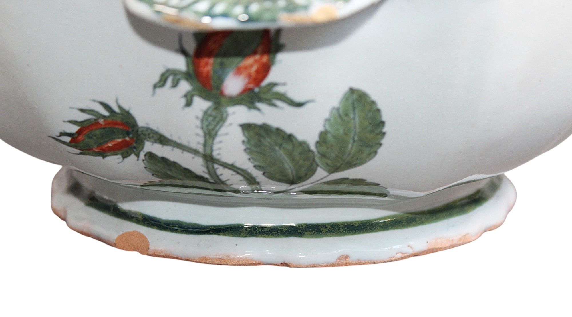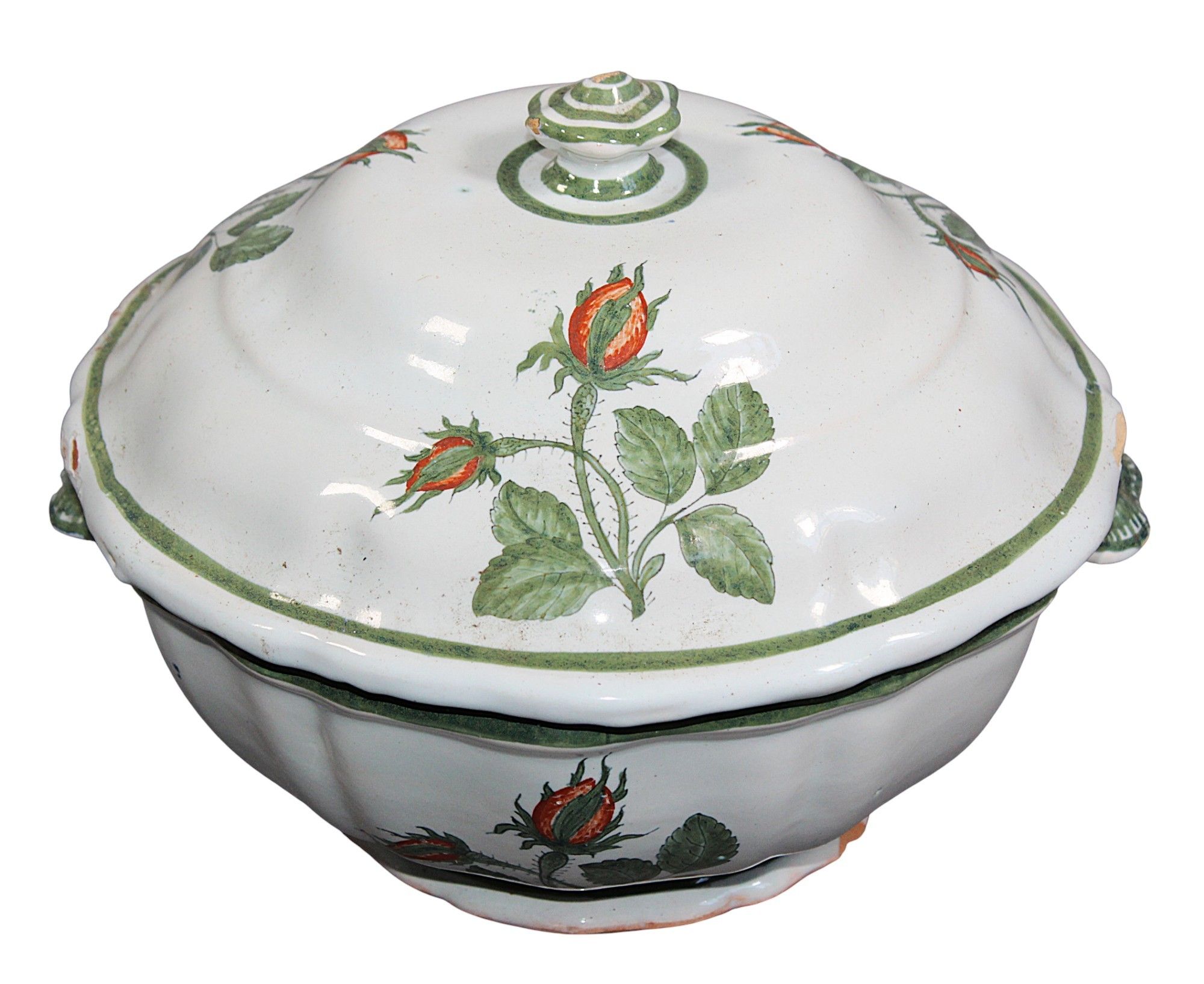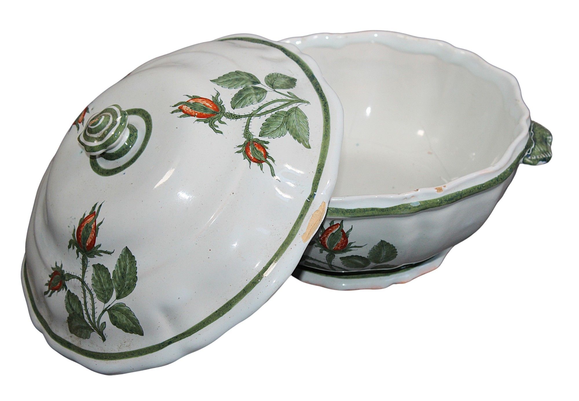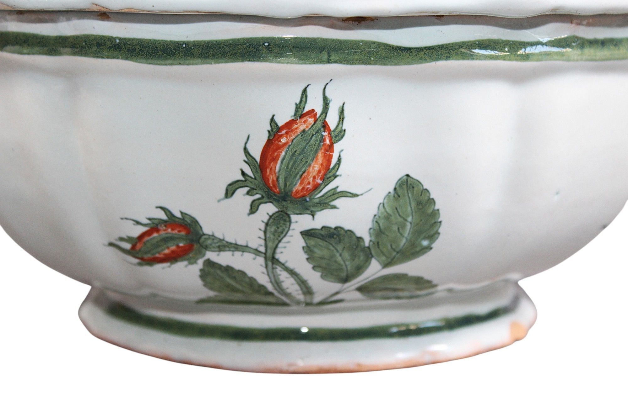 Probably SOUTH WEST 18th C. - Earthenware TERRINE or soup tureen with mossy rose decoration, height: 20 cm, diameter: 24 cm. Firing defects and a few small chips from use.