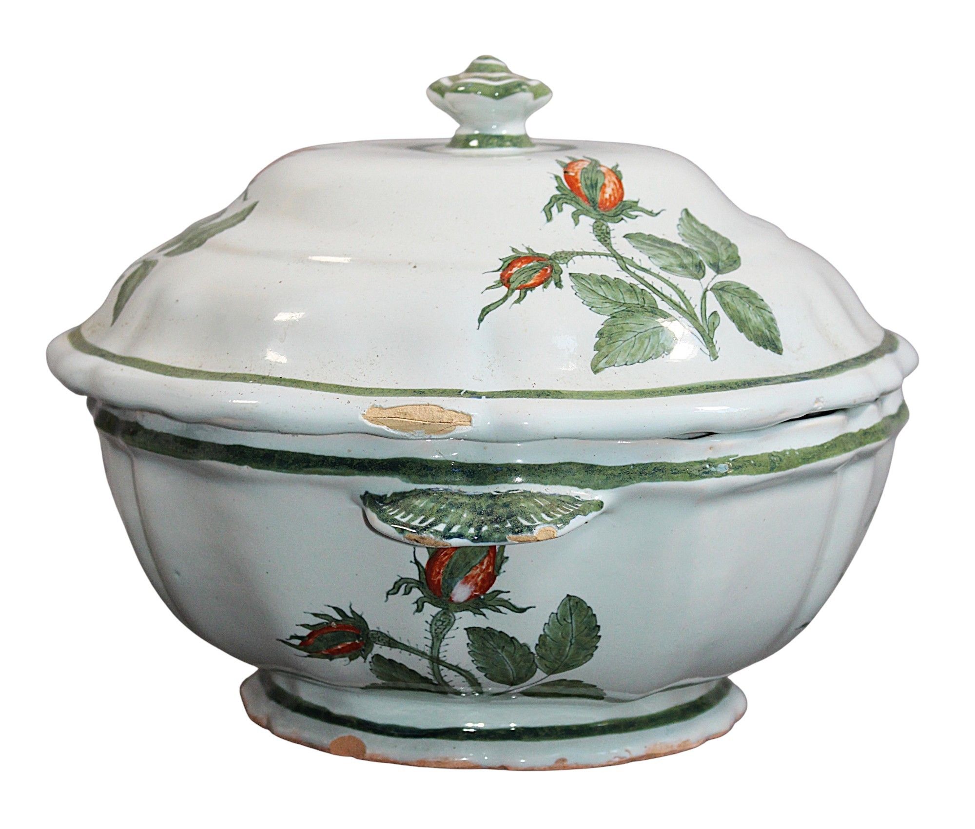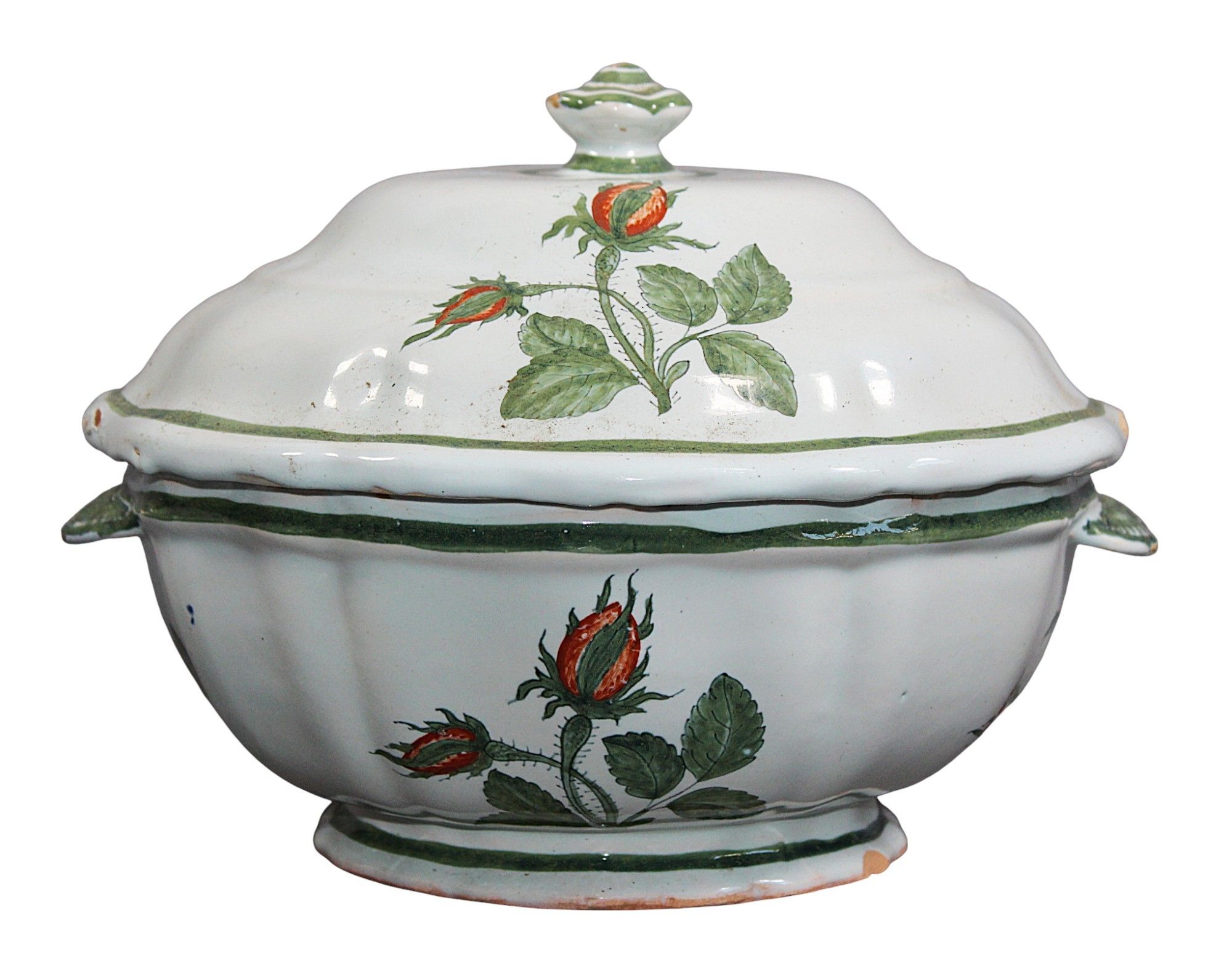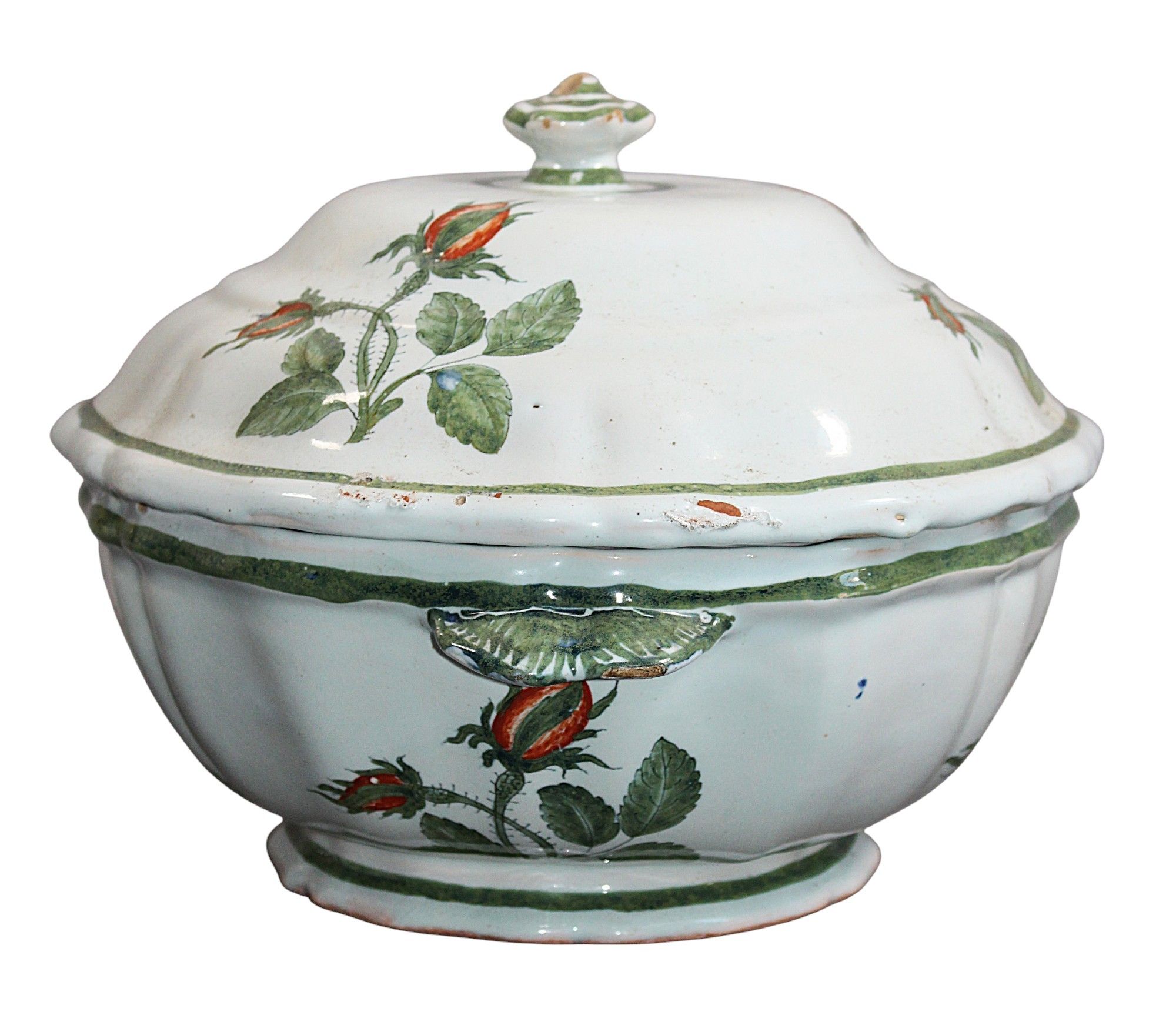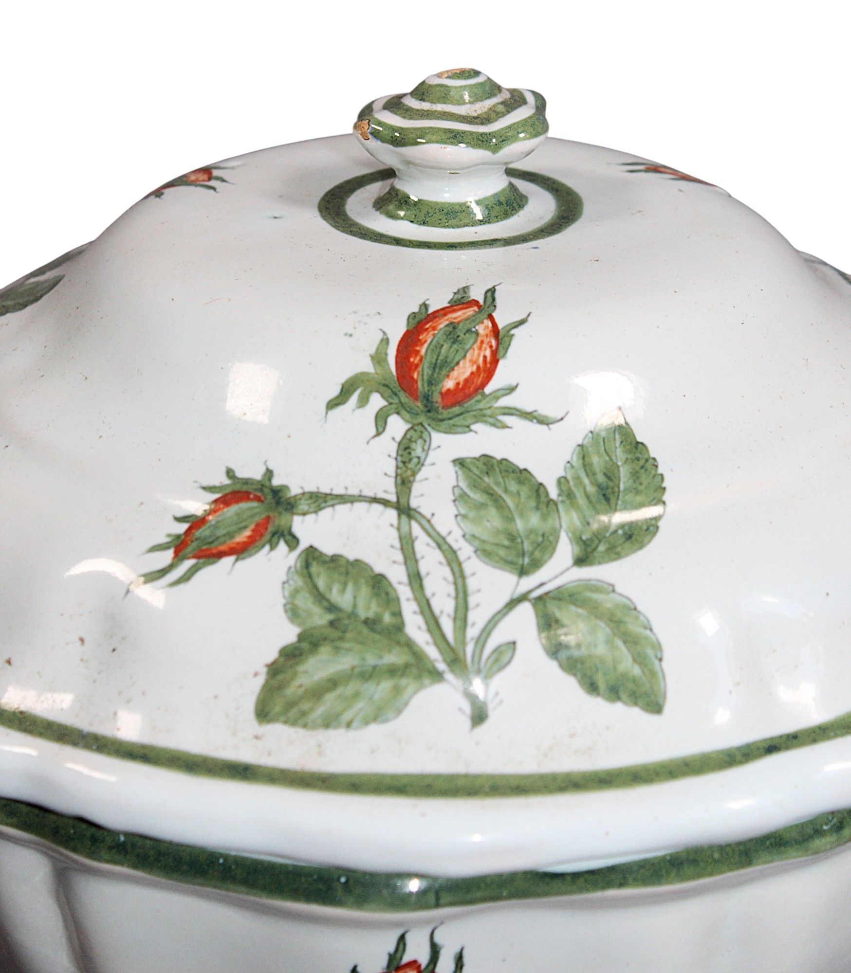 Probably SOUTH WEST 18th C. - Earthenware TERRINE or soup tureen with mossy rose decoration, height: 20 cm, diameter: 24 cm. Firing defects and a few small chips from use.