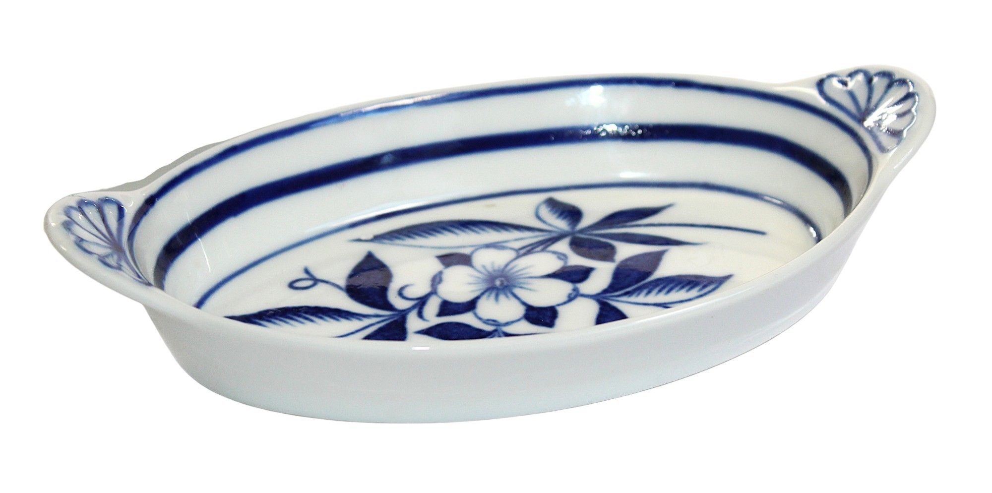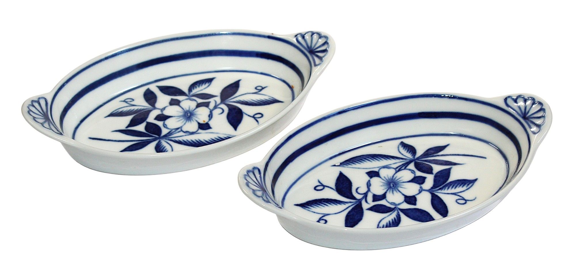 BAYEUX, late 19th century - Suite of 2 porcelain EGG PLATES with blue monochrome decoration of flowers, length: 18.5 cm.