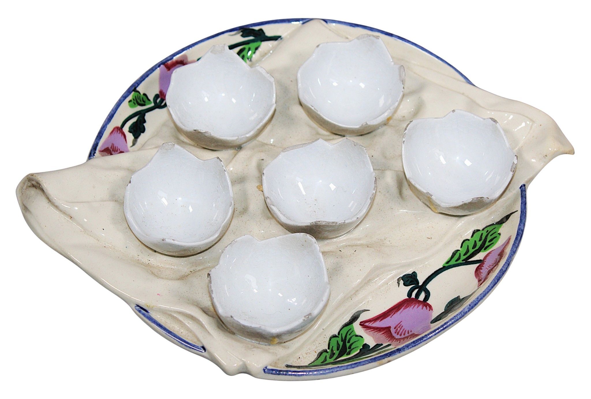 Georges DREYFUS (active between 1890-1933) - EGG STAND in earthenware with trompe-l'œil decoration of a dish presenting six shells resting on a napkin, early 20th century, 26 x 21 cm. Small chips and missing pieces.
