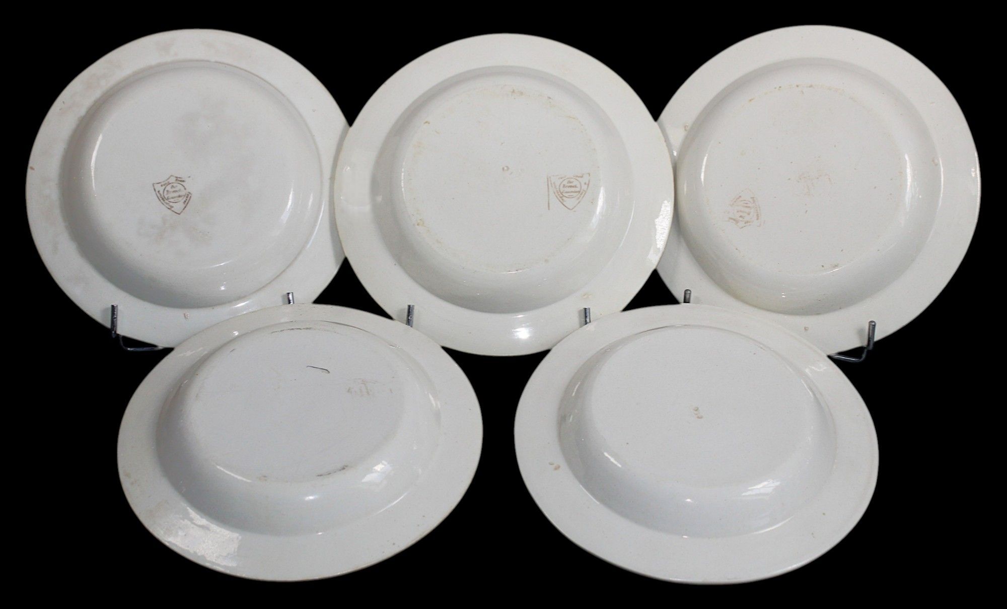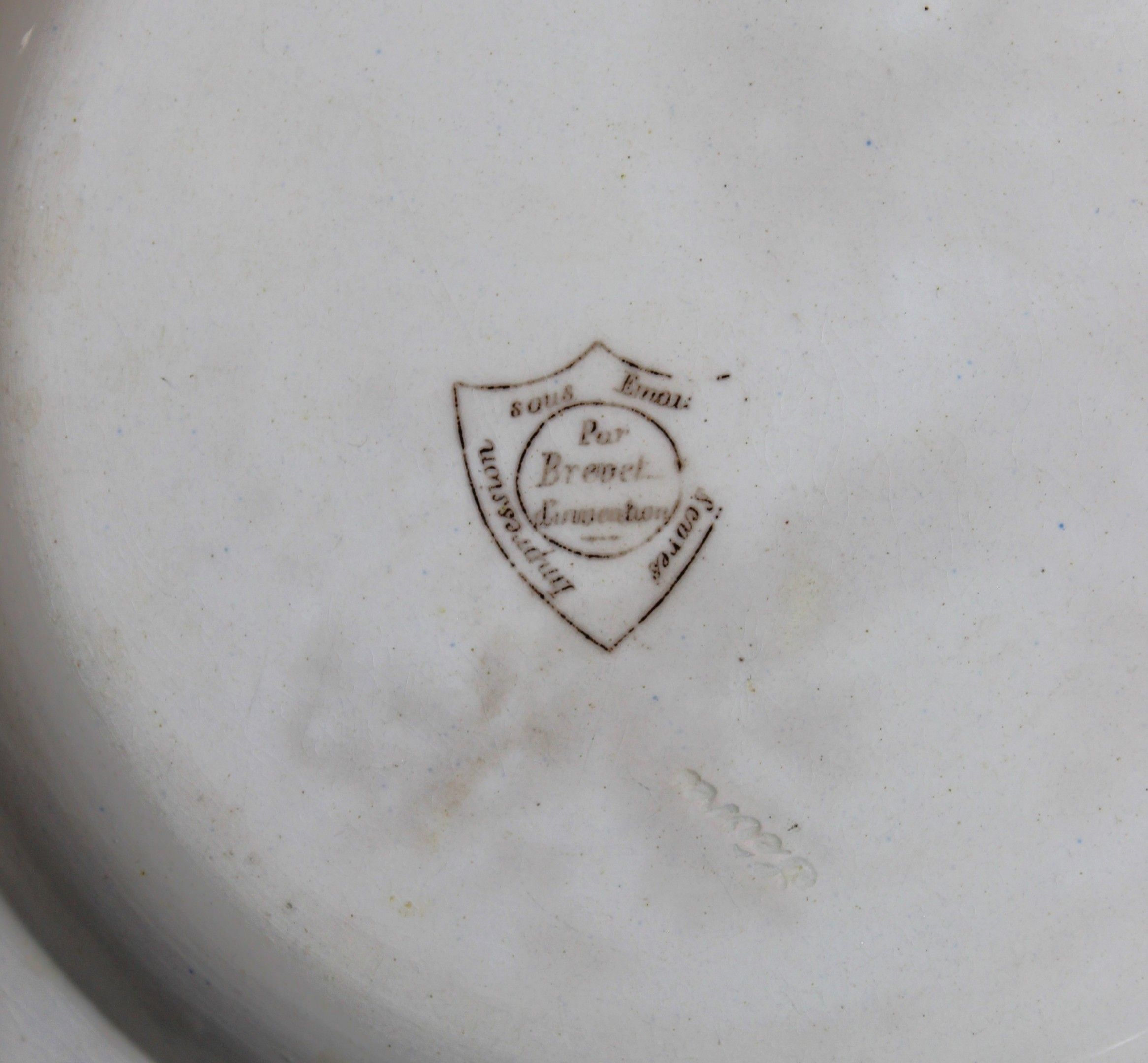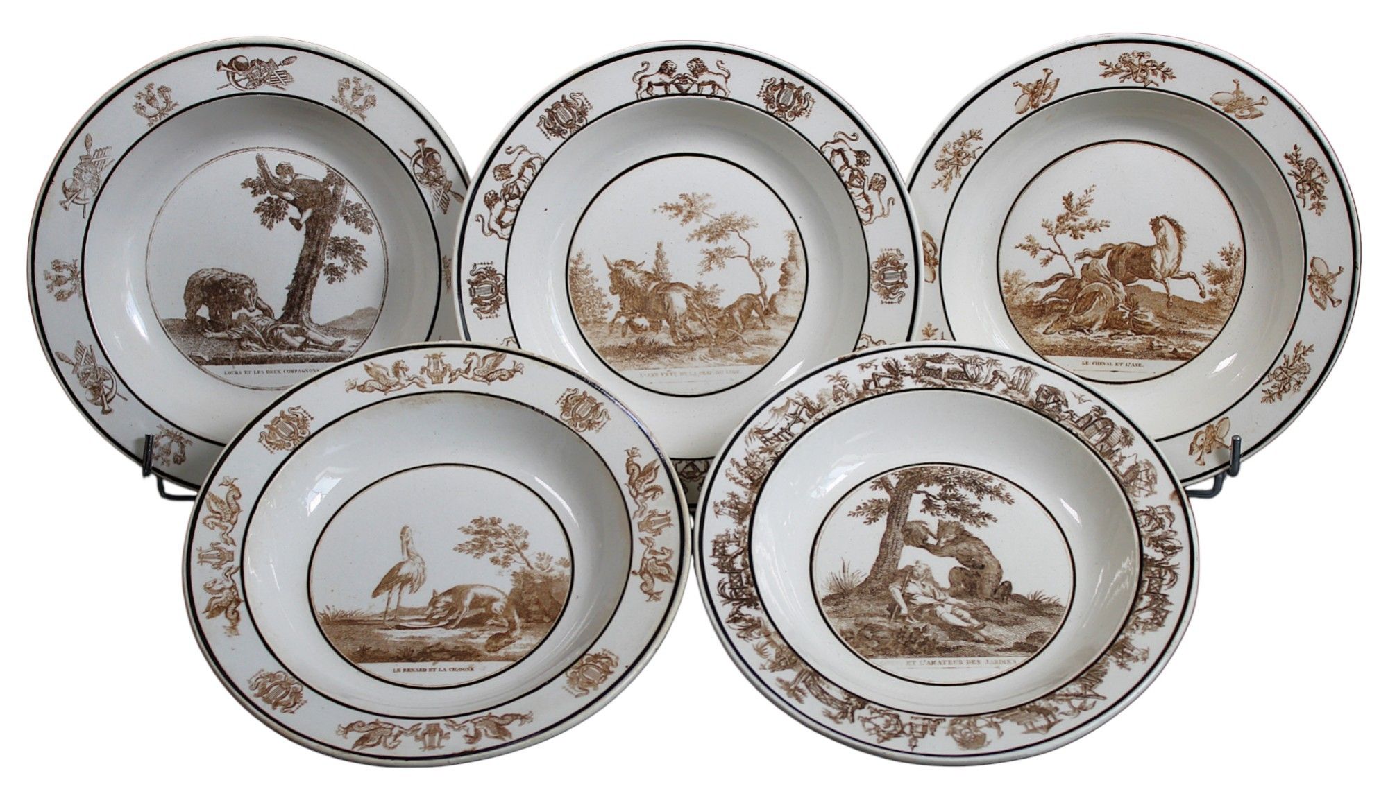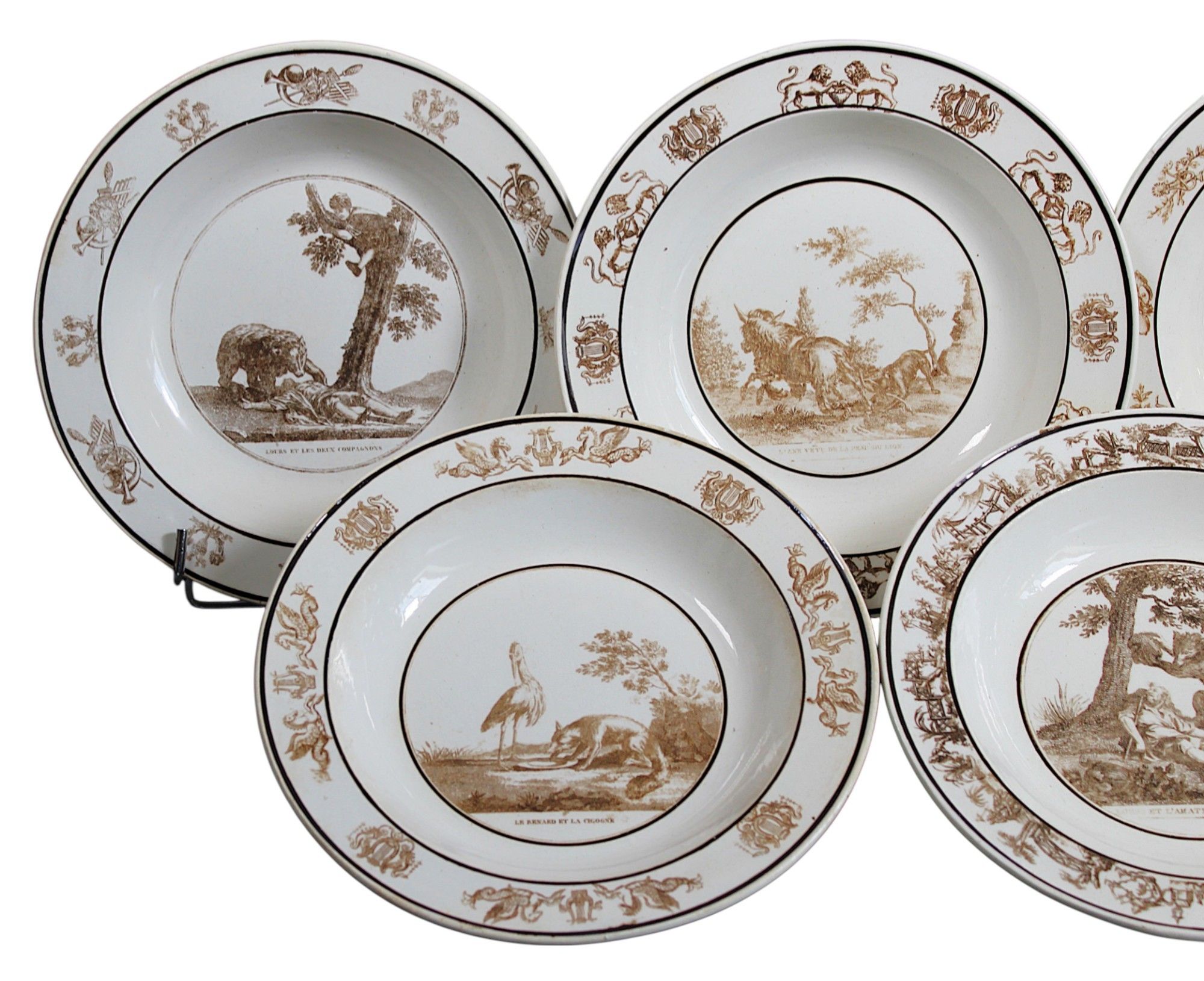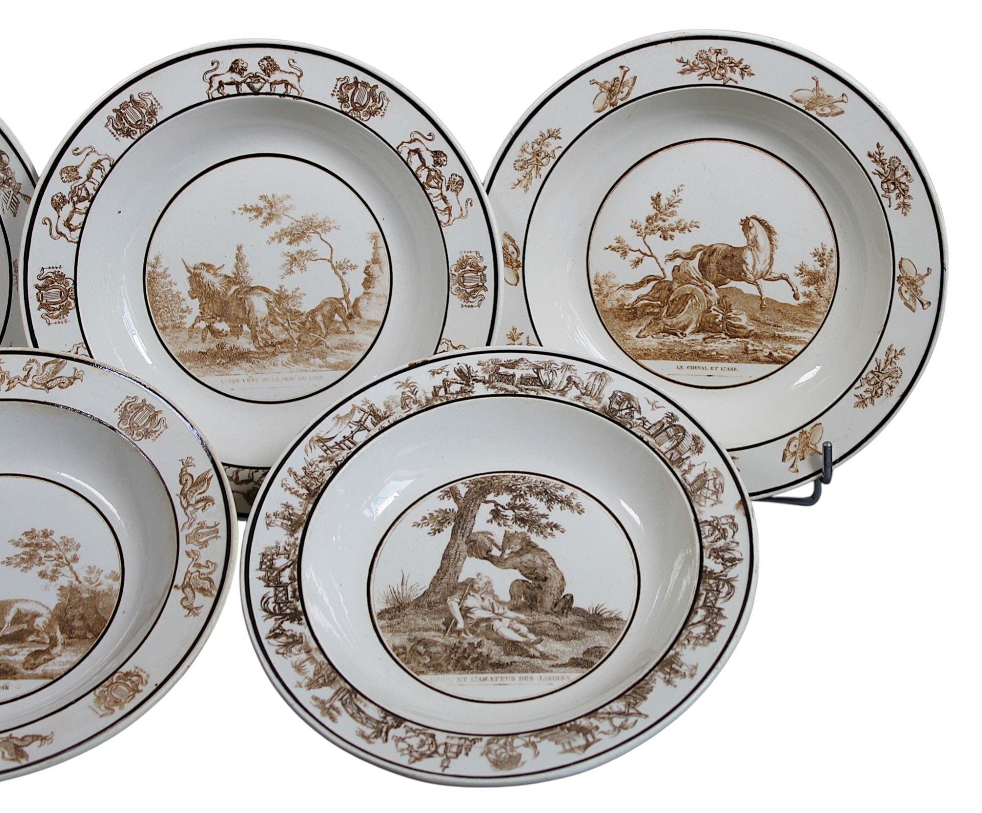 SEVRES early XIXth century - Suite of 5 fine earthenware hollow ASSIETTES in brown monochrome entitled "The fox and the stork", "The bear and the garden lover", "The donkey wearing the lion's skin", "The bear and the two companions" and "The horse and the donkey", debossed "Sèvres" and/or with stamp marks in the form of an escutcheon, diameter : 24,5 cm.