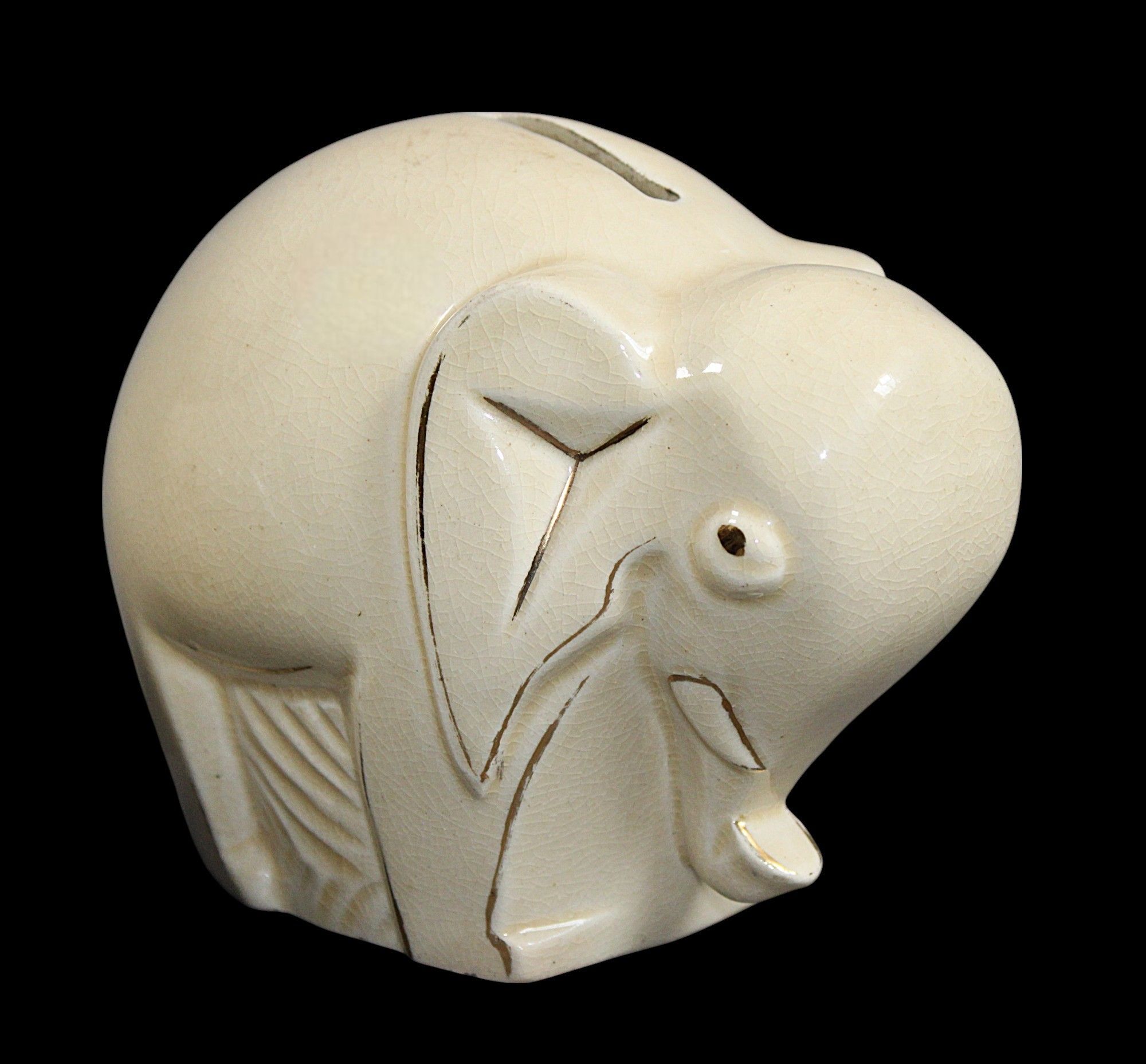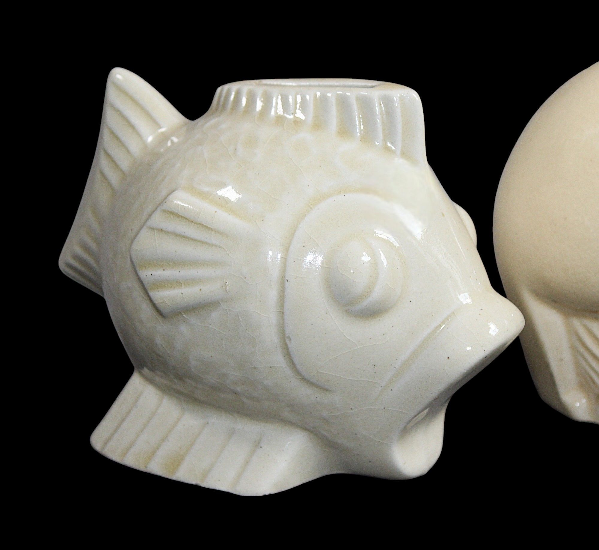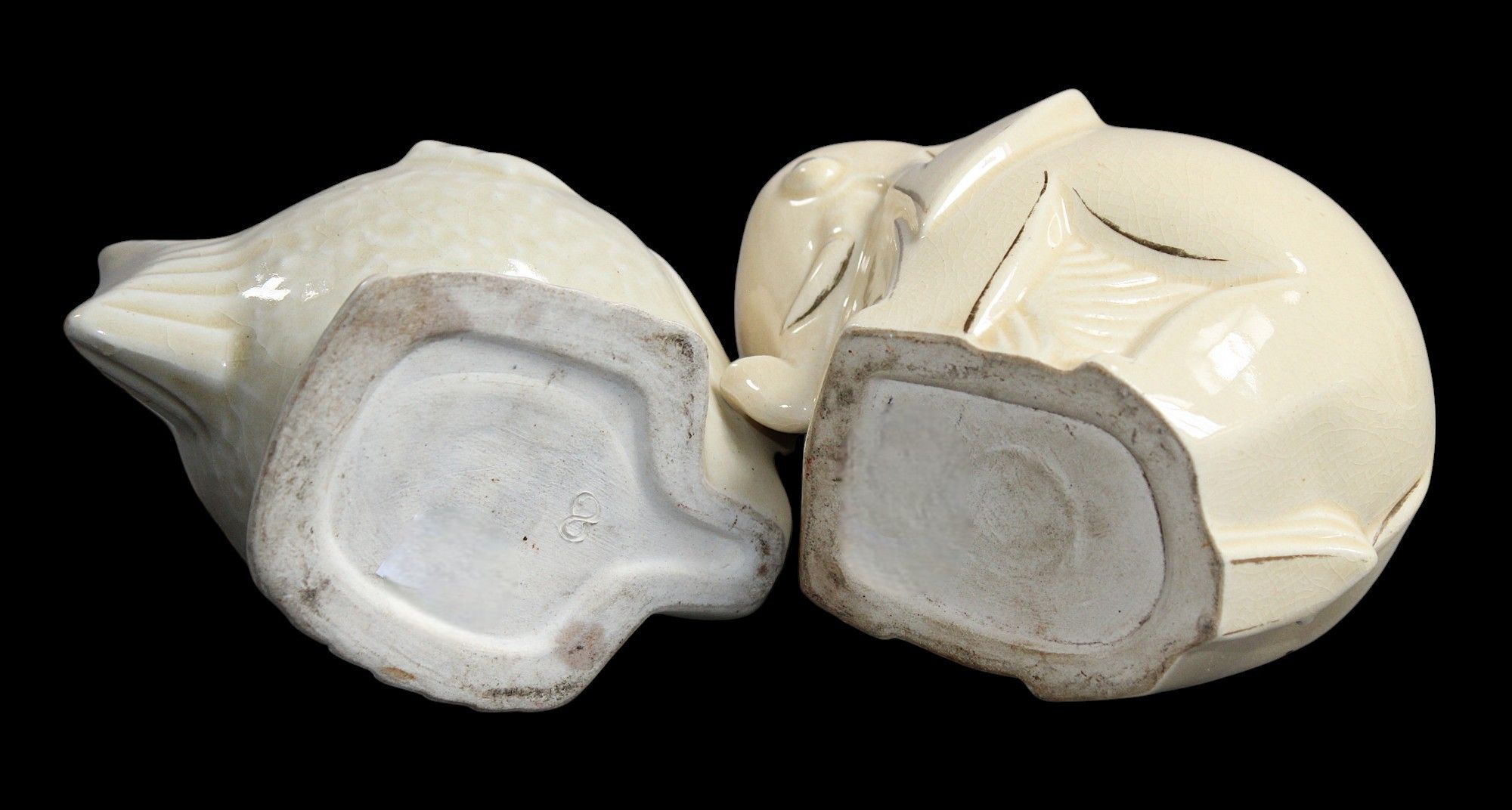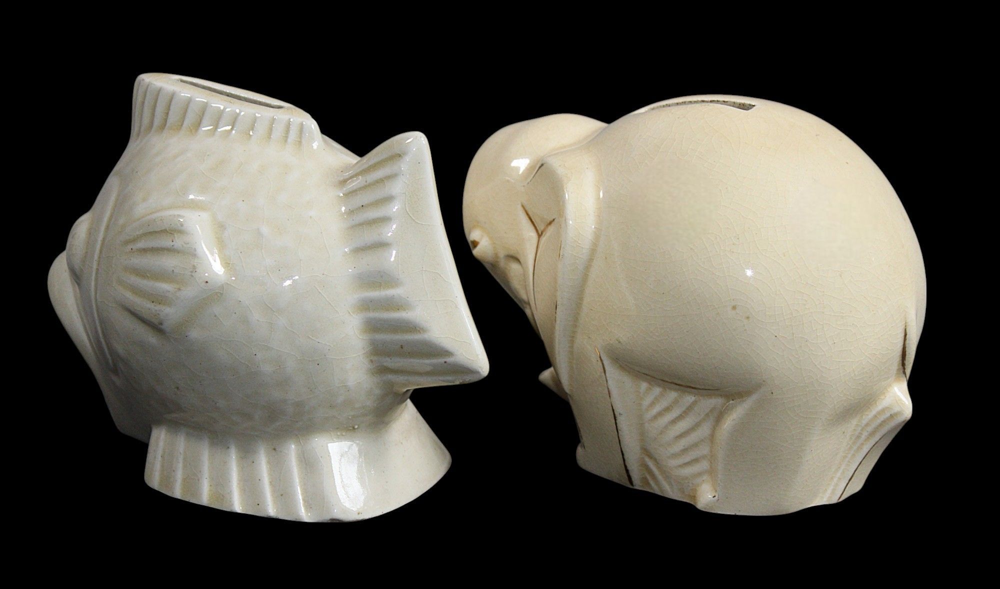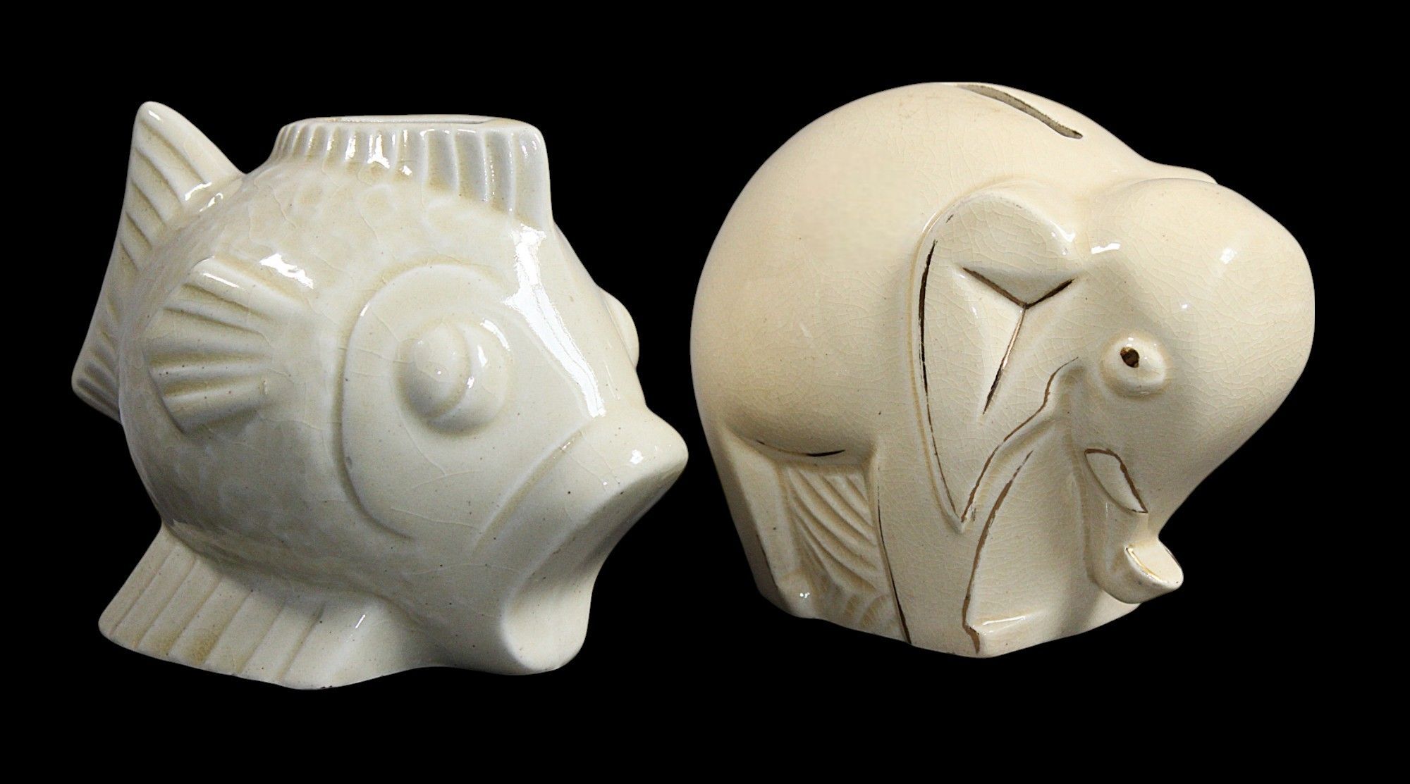 Earthenware set comprising 2 TIRELIRES with stylized decor featuring fish and elephants, mid 20th century, height: approx. 11.5 cm.