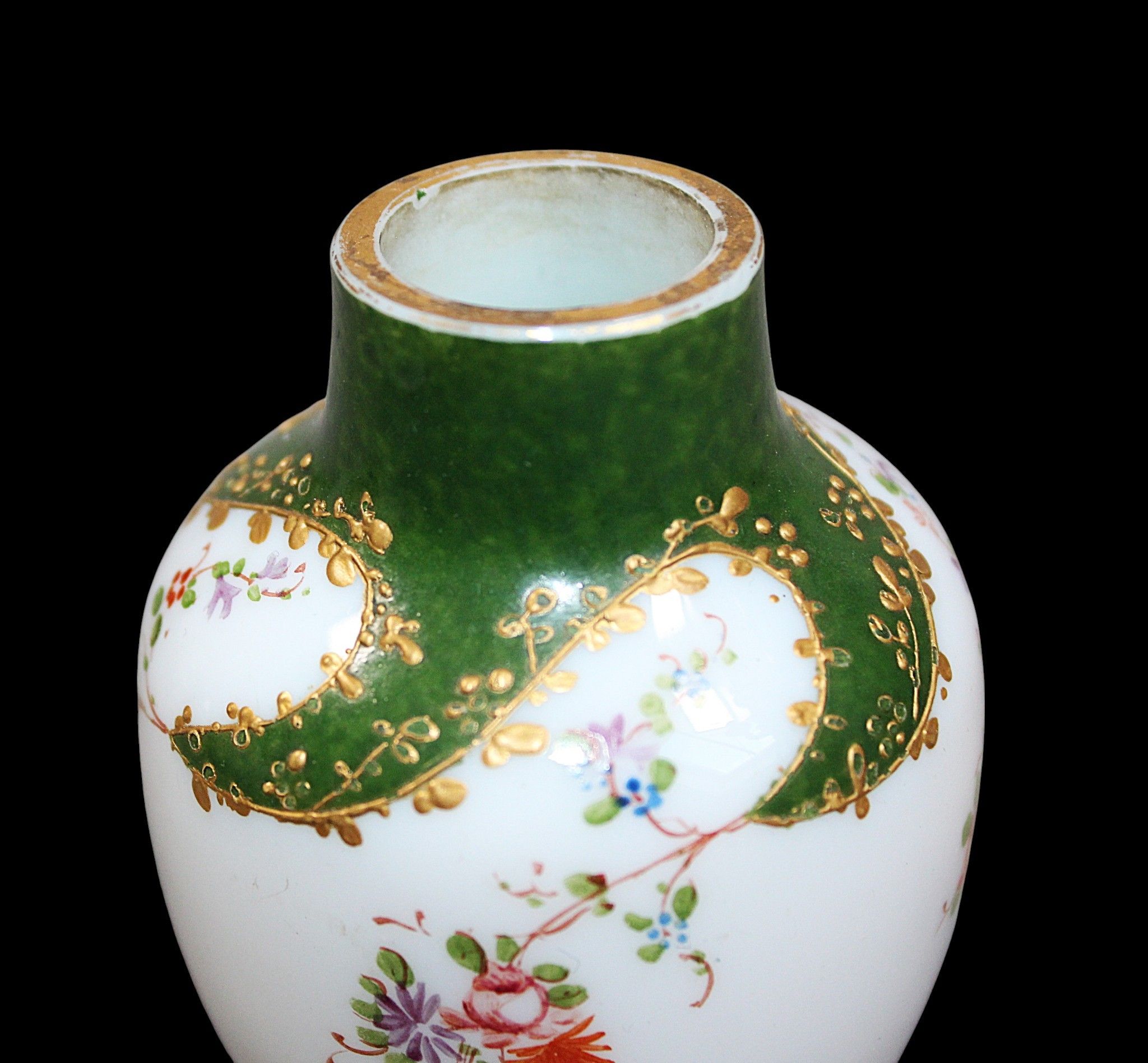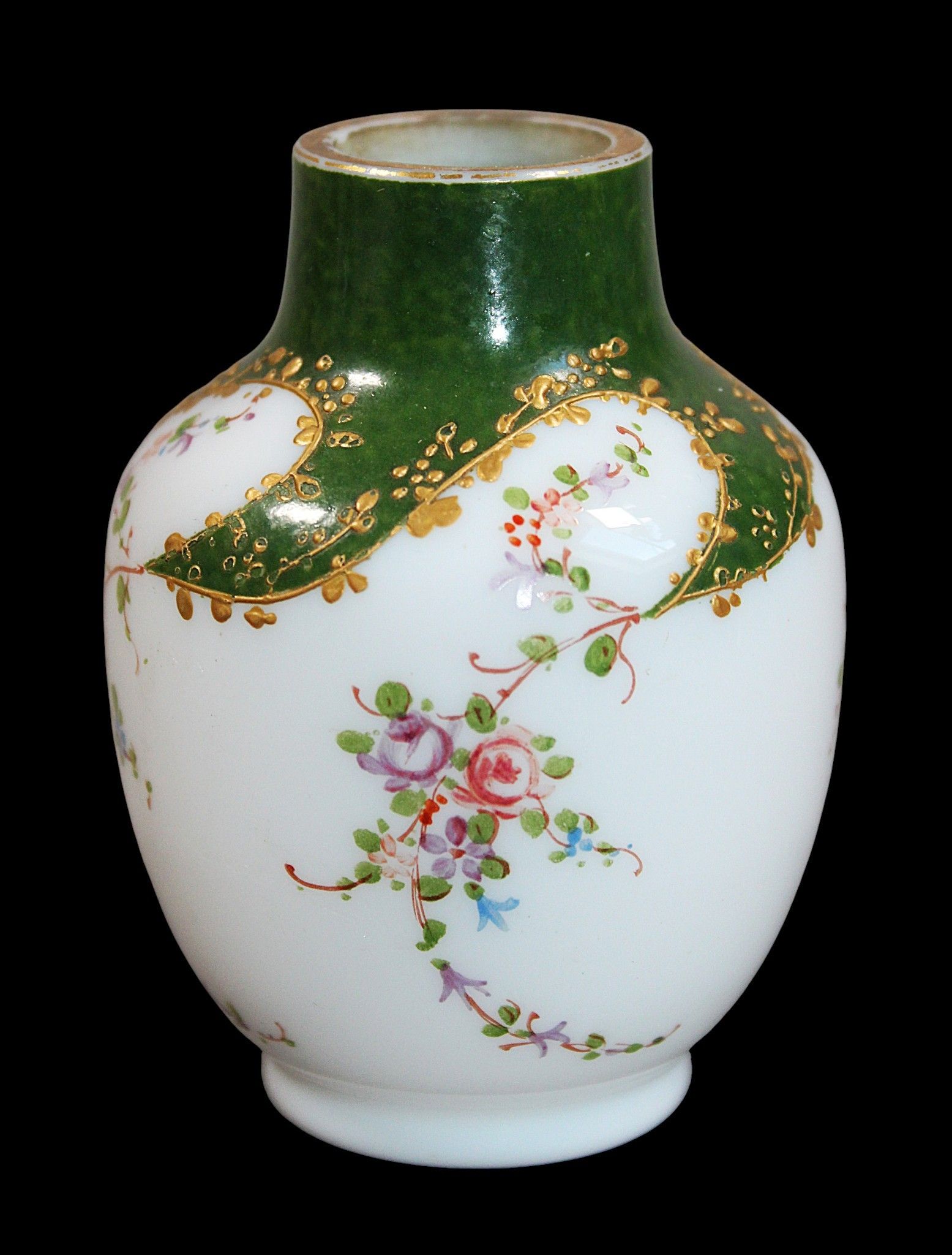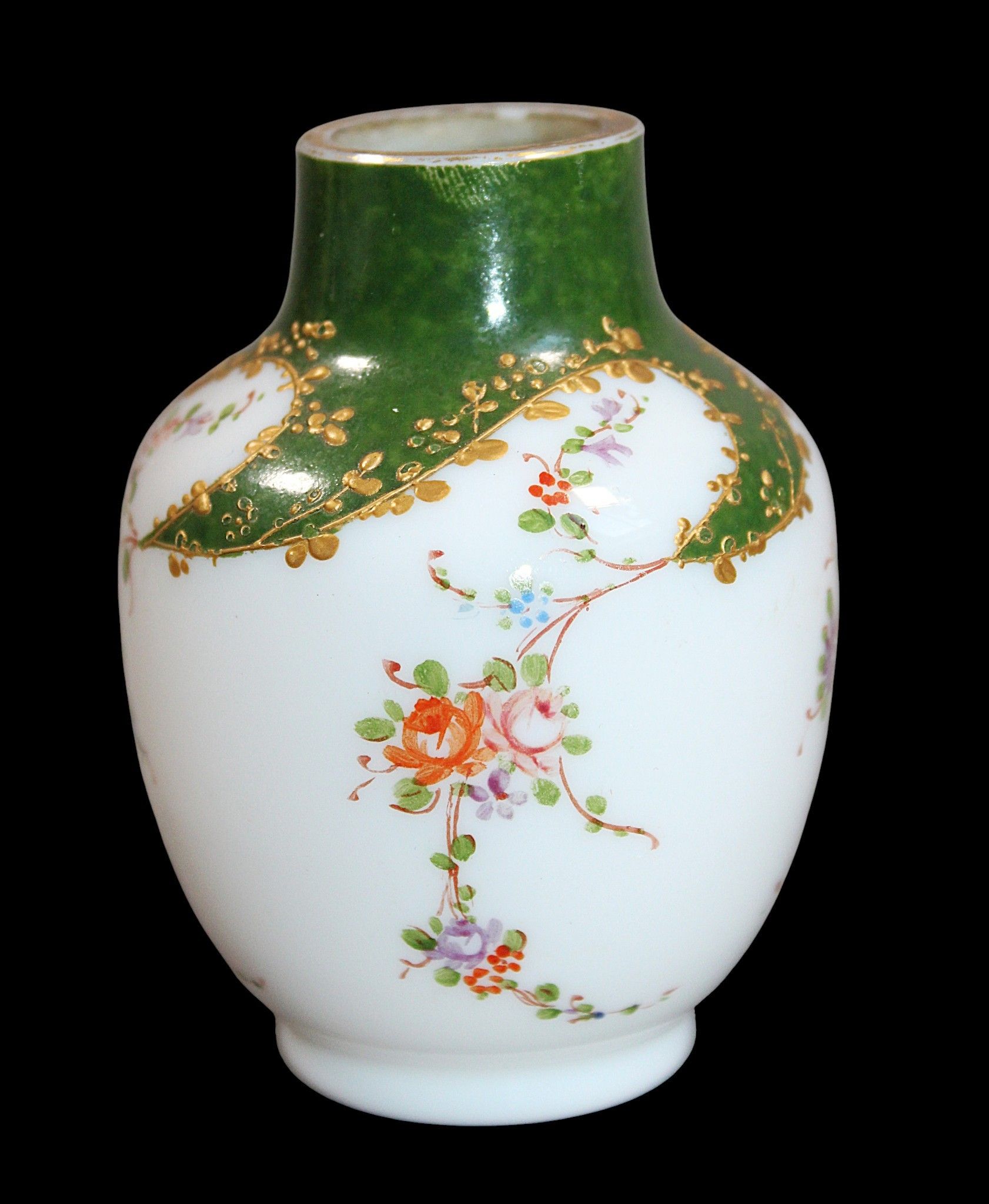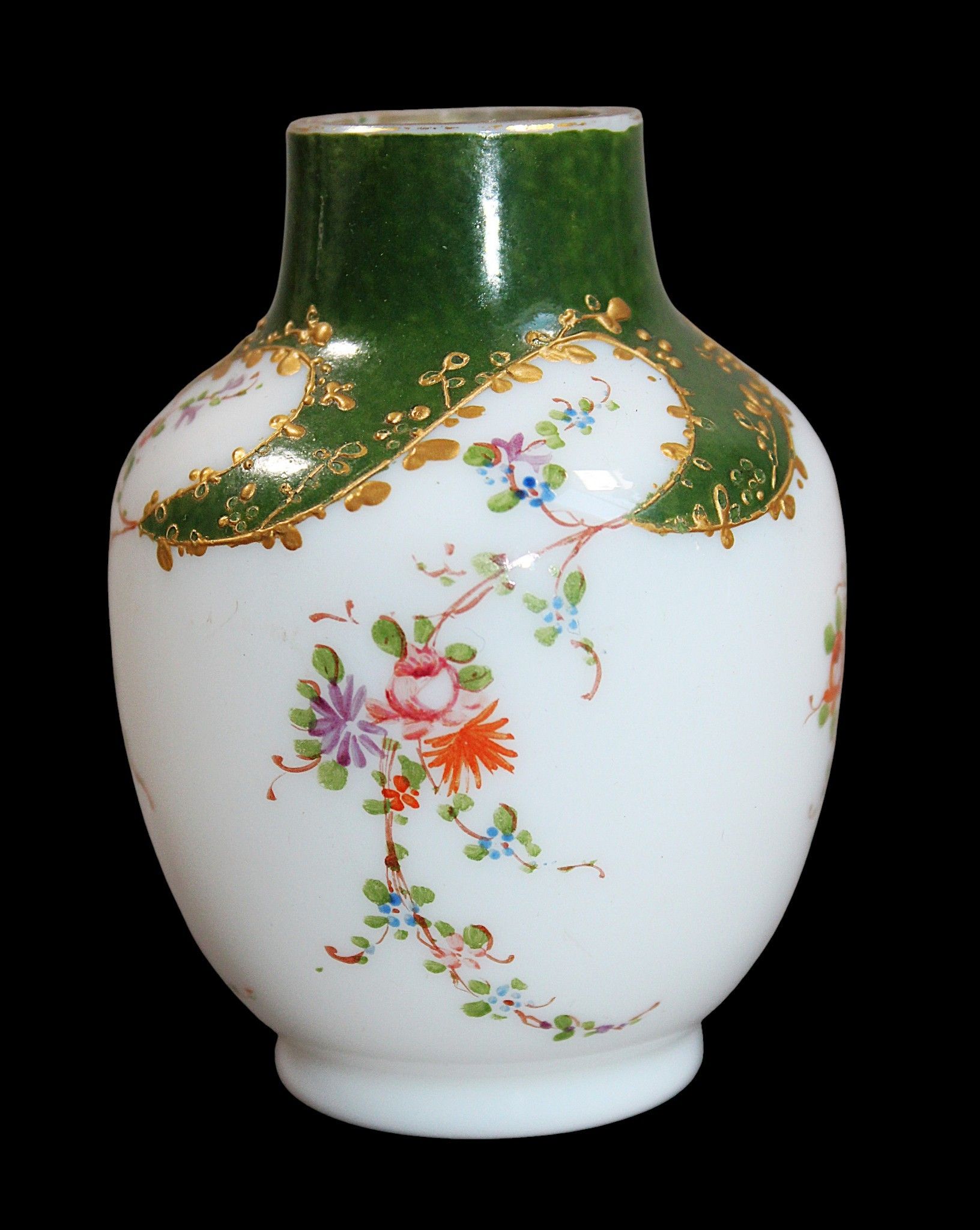 A white opaline miniature vase with falling flowers and gold highlights, 19th century, 8 cm high.