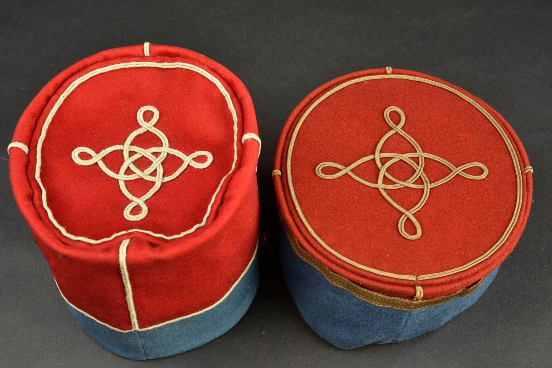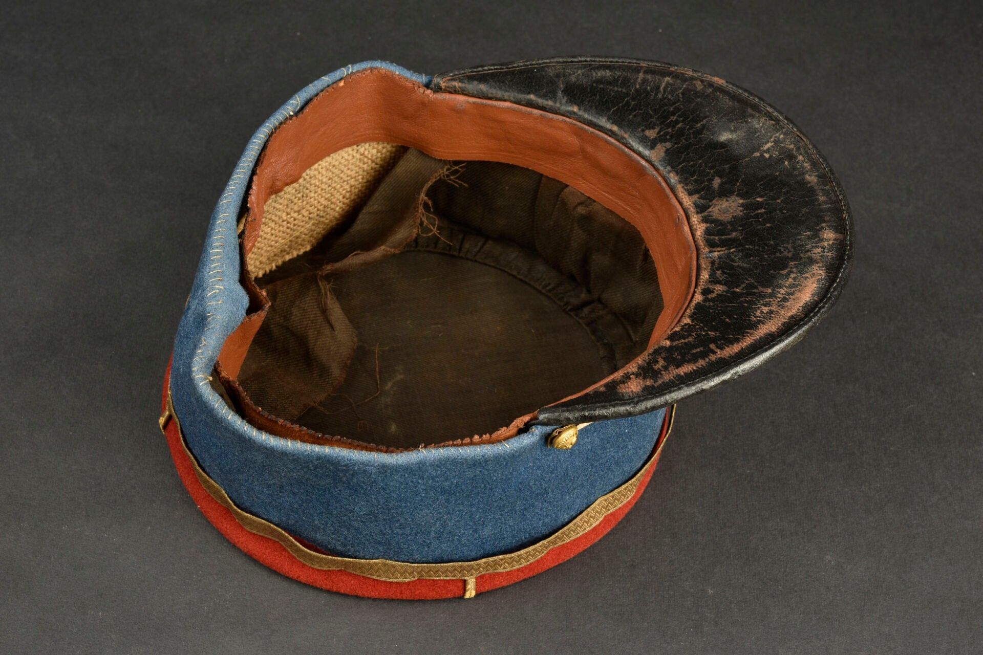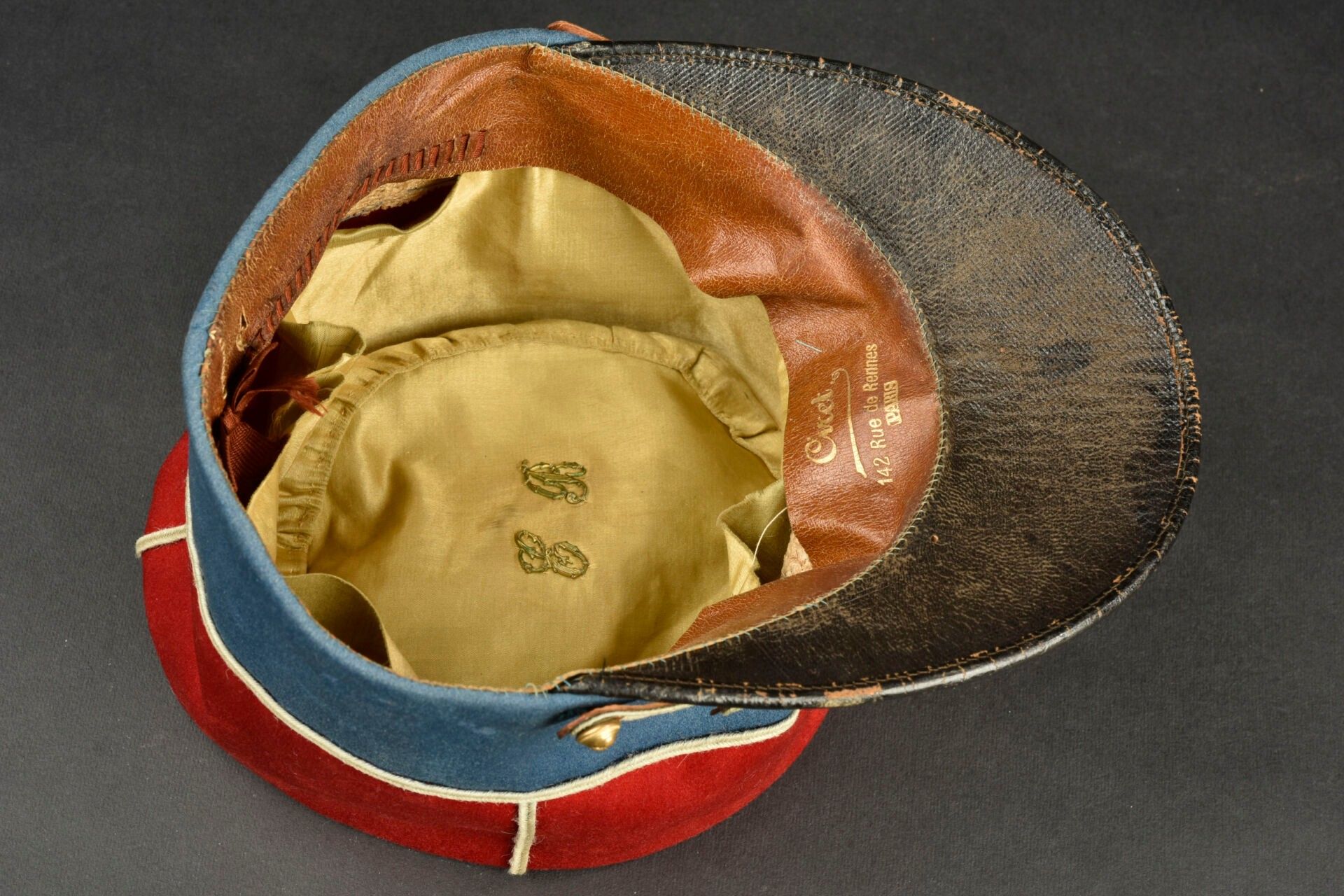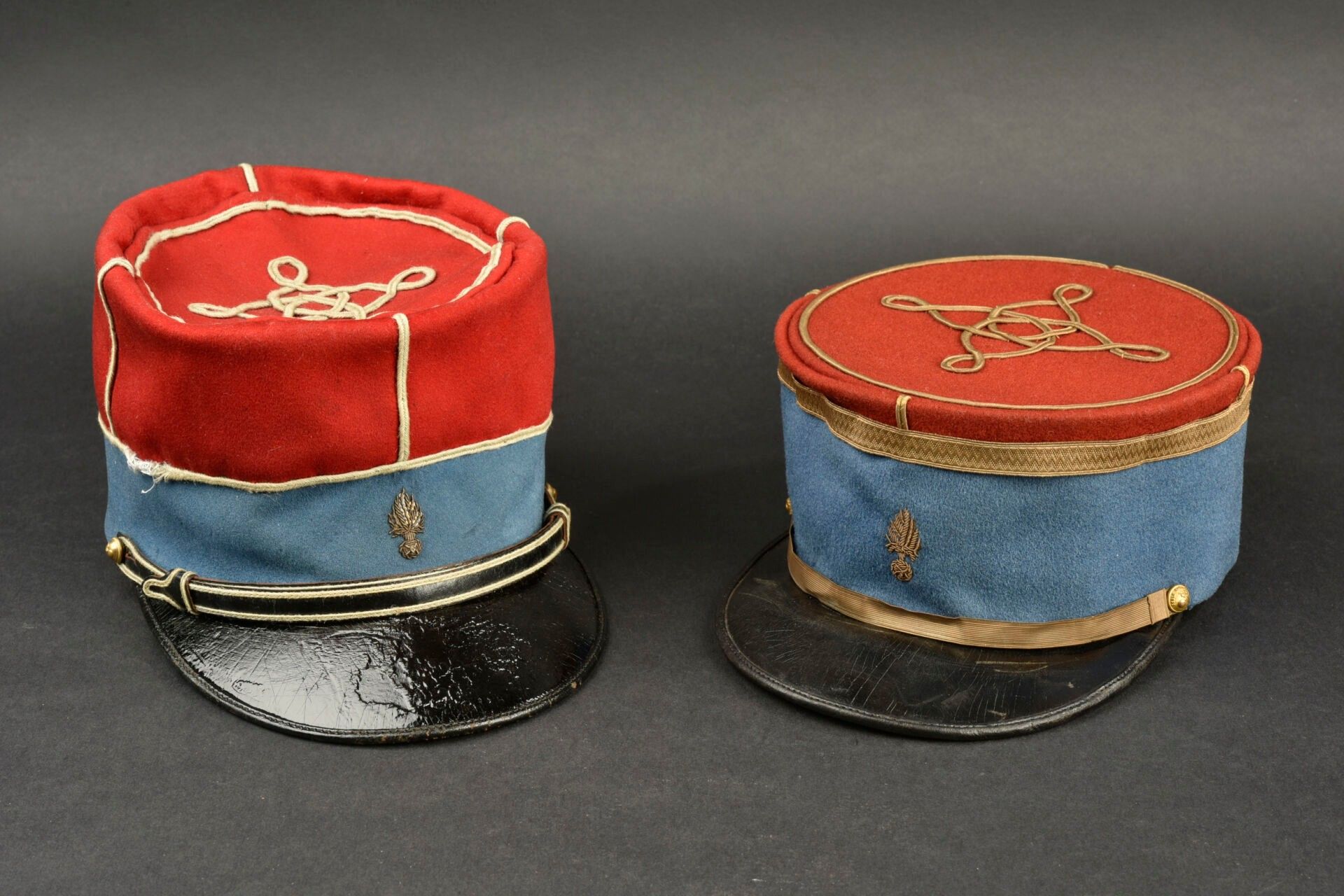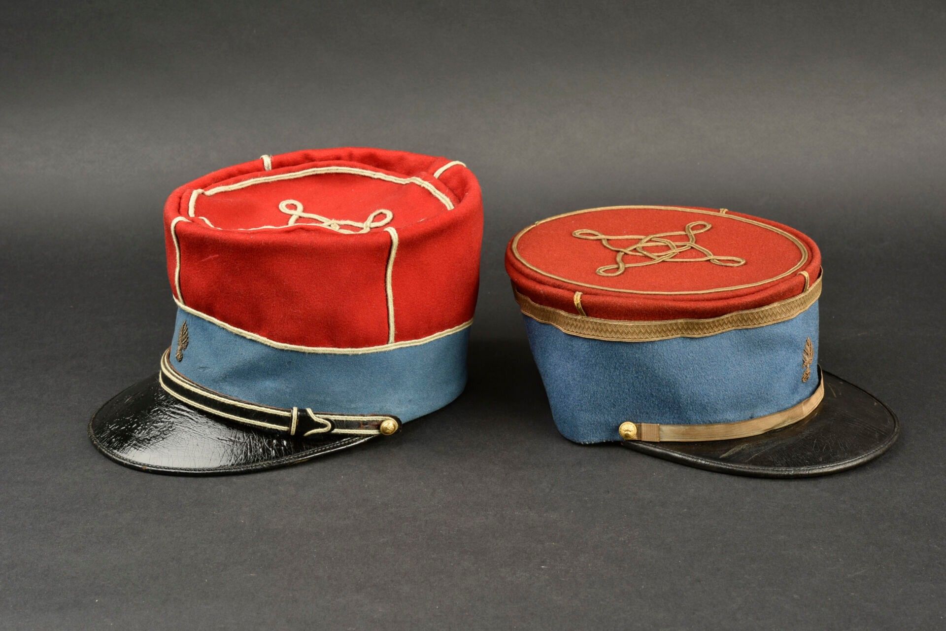 Set of kepi. Comprising a military school kepi scarf, grey-blue cloth headband, madder top, Hungarian knot and white cotton braids. Embroidered grenade in gold piping, gold buttons with infantry grenade. Leather chinstrap, soft leather visor. Sateen lining bearing the initials EB on the bottom of the kepi, tan leather sweatband with Ciret tailor's markings in Paris. Two staples on the sweatband. A military academy polo kepi, blue grey cloth headband, gold Hungarian ranks and knots, cannetille embroidered grenade, ESM buttons. Sweatband half detached. Condition II+