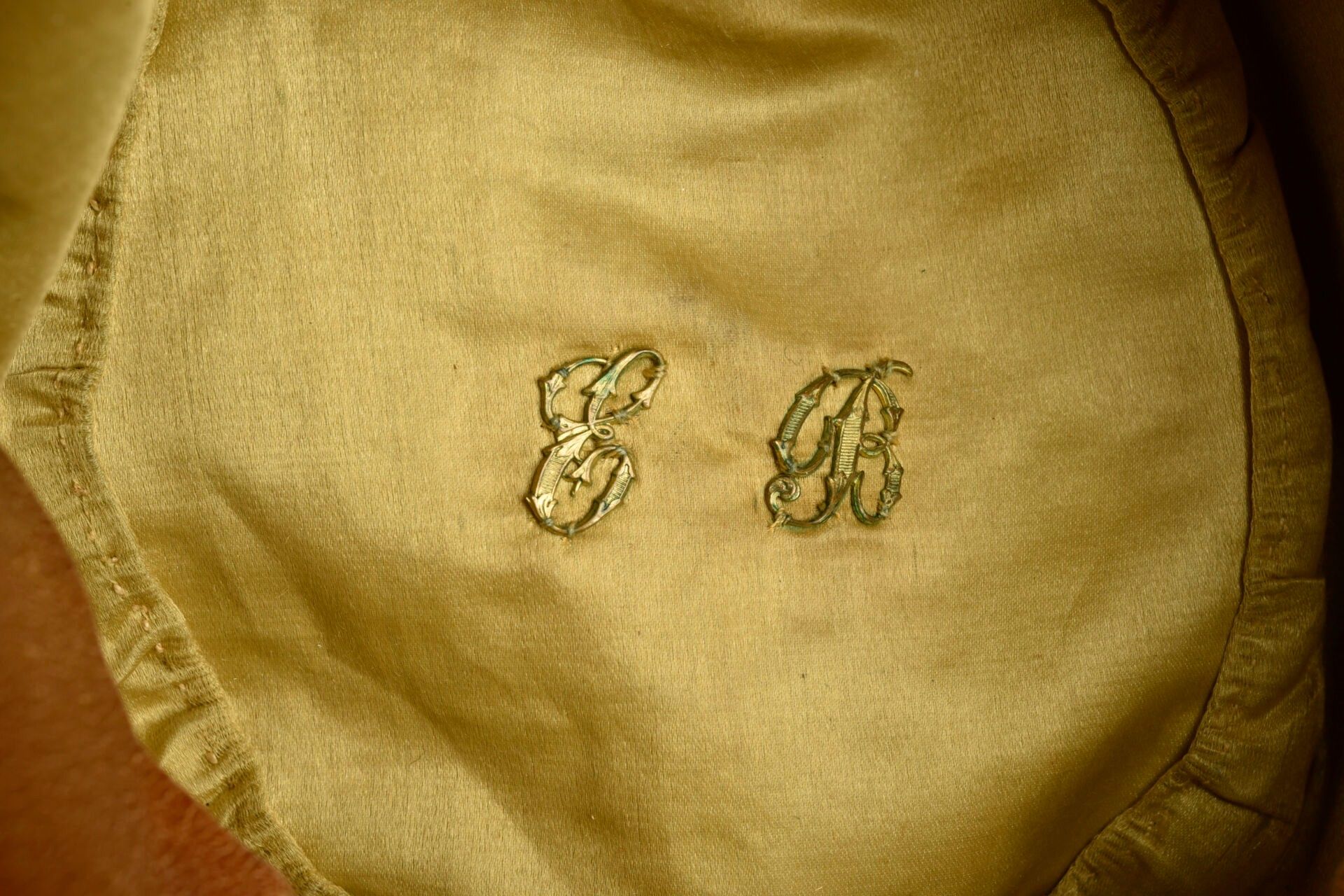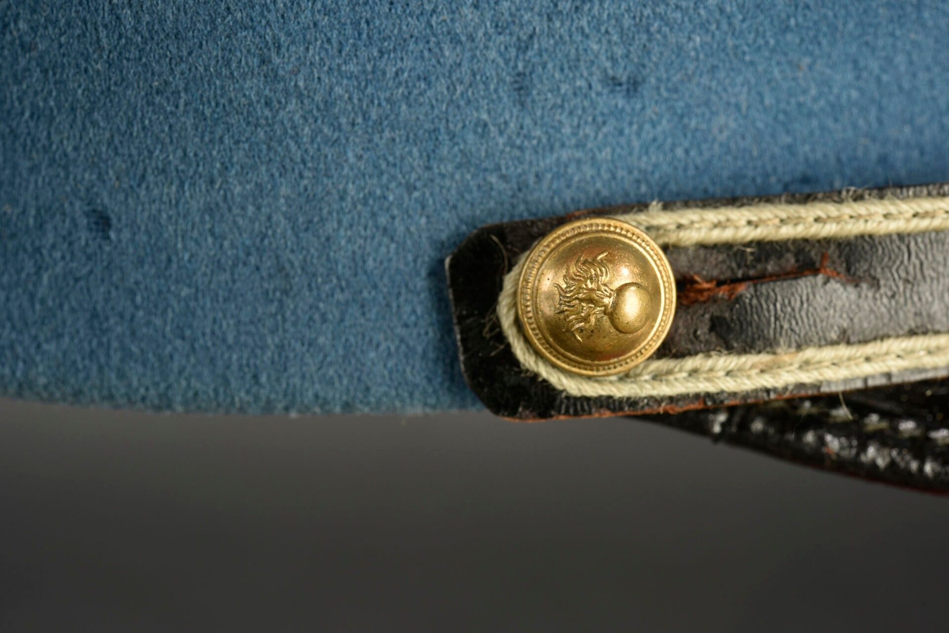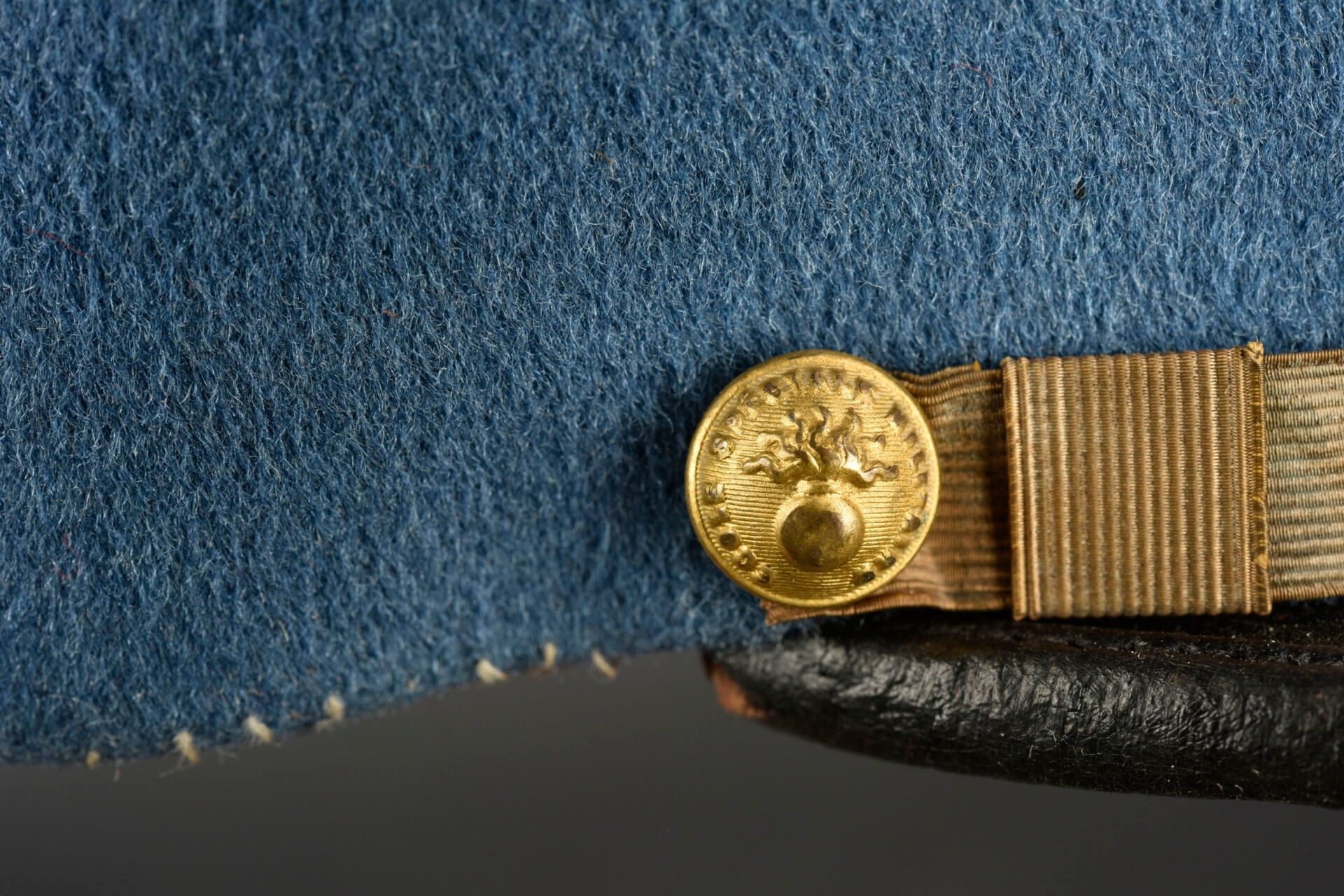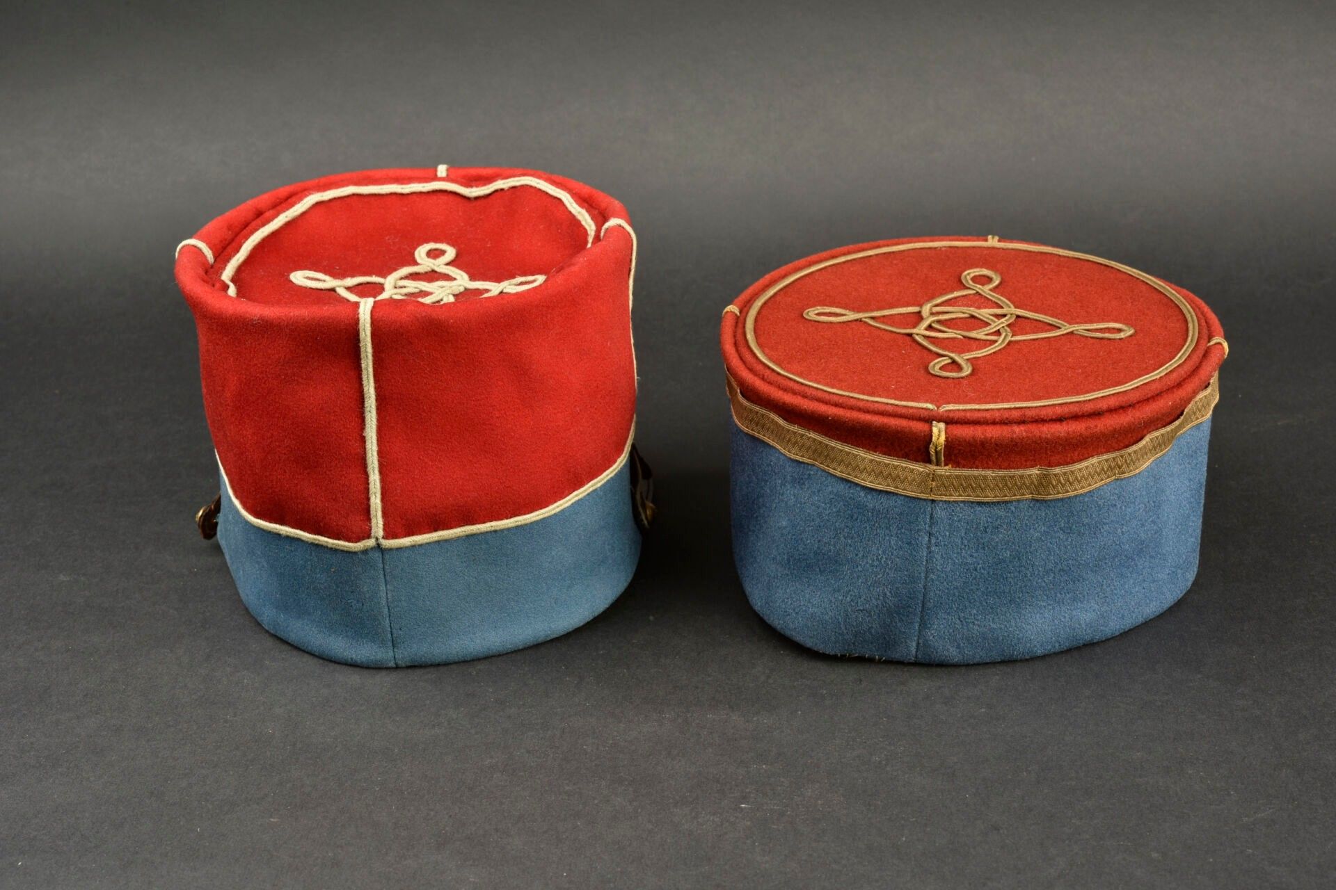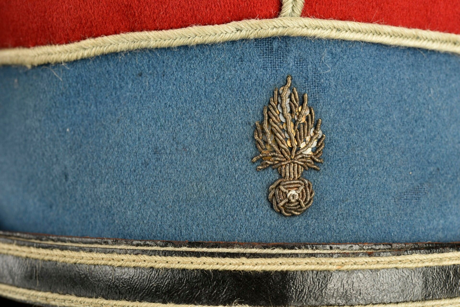 Set of kepi. Comprising a military school kepi scarf, grey-blue cloth headband, madder top, Hungarian knot and white cotton braids. Embroidered grenade in gold piping, gold buttons with infantry grenade. Leather chinstrap, soft leather visor. Sateen lining bearing the initials EB on the bottom of the kepi, tan leather sweatband with Ciret tailor's markings in Paris. Two staples on the sweatband. A military academy polo kepi, blue grey cloth headband, gold Hungarian ranks and knots, cannetille embroidered grenade, ESM buttons. Sweatband half detached. Condition II+